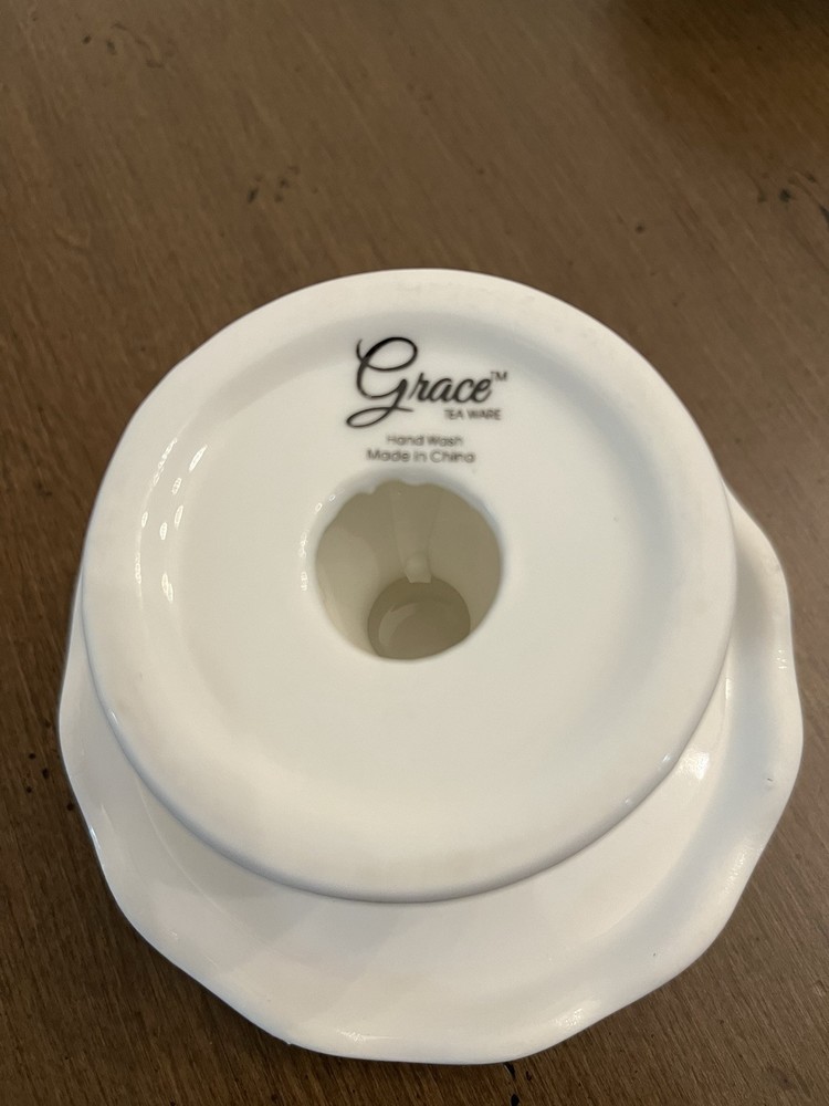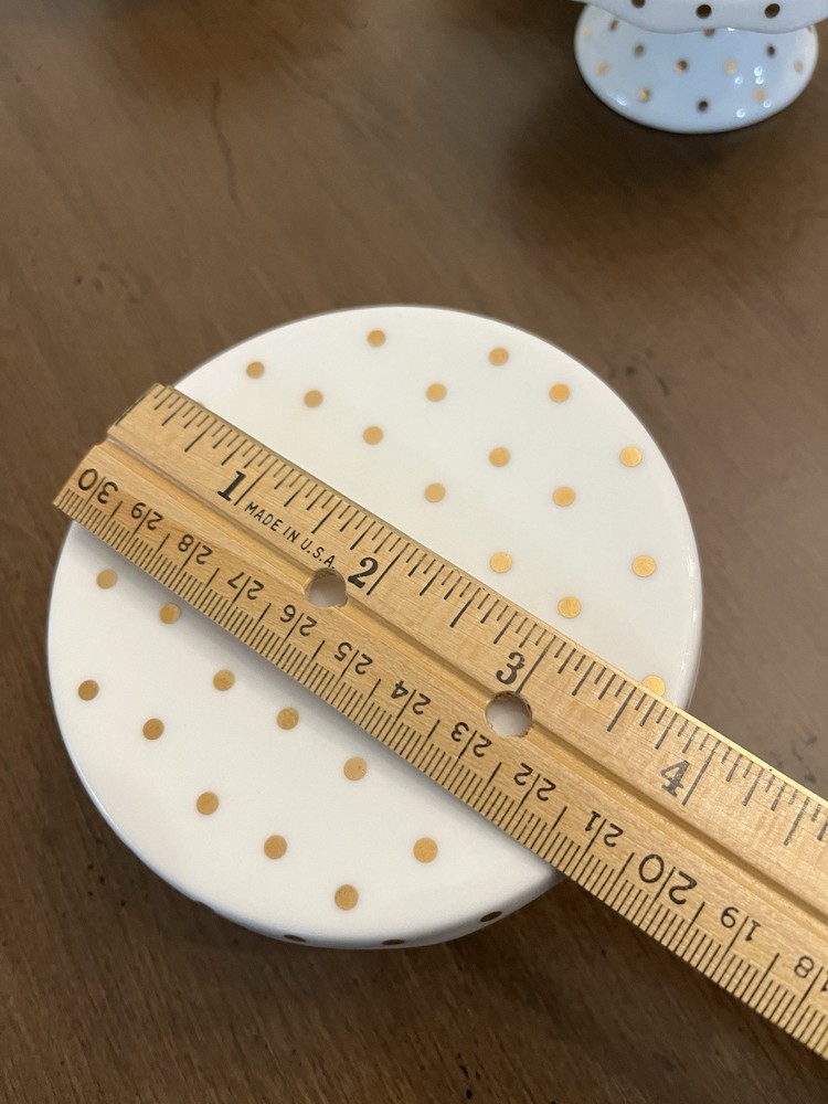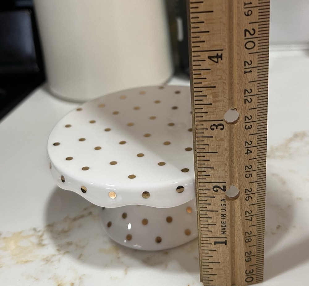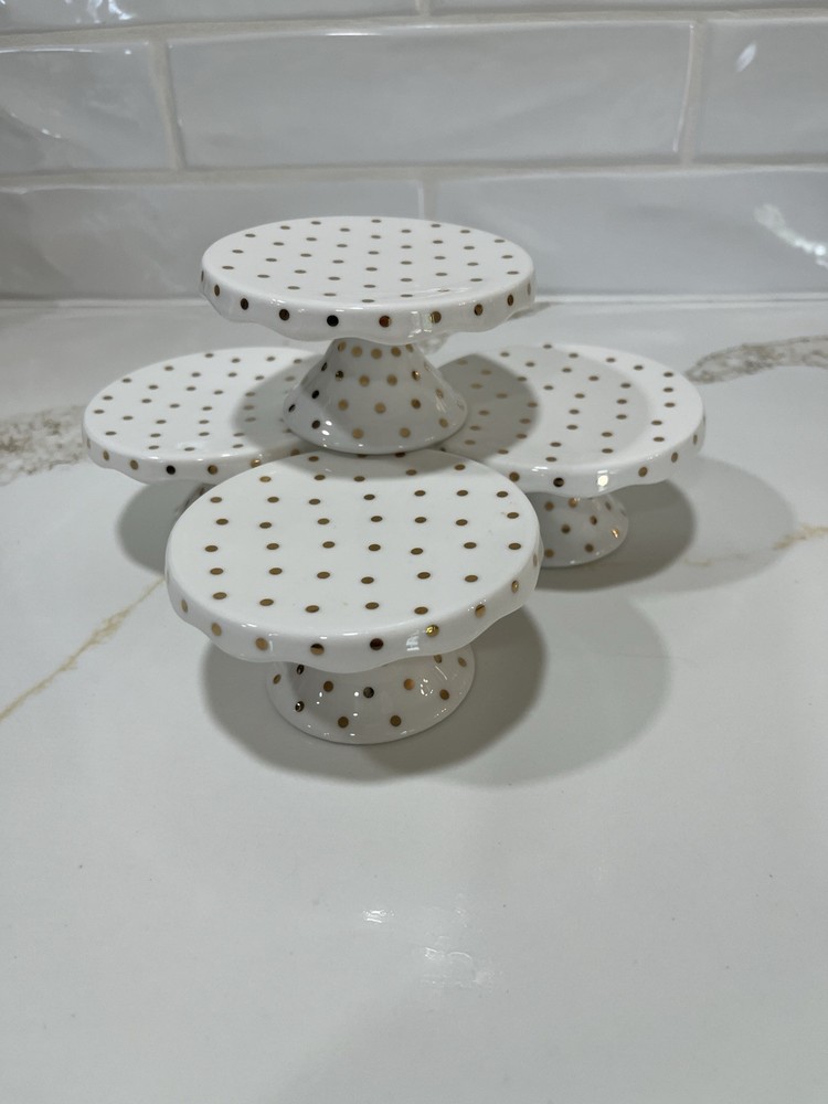 The set includes four round porcelain dessert trays with a cream color featuring gold dots, perfect for a wedding occasion. Each tray has a 4-inch diameter and 2-inch height, with a traditional style and a glossy finish. They are ideal for presenting cupcakes or other desserts in an elegant manner. The brand is Grace and the country of manufacture is China.