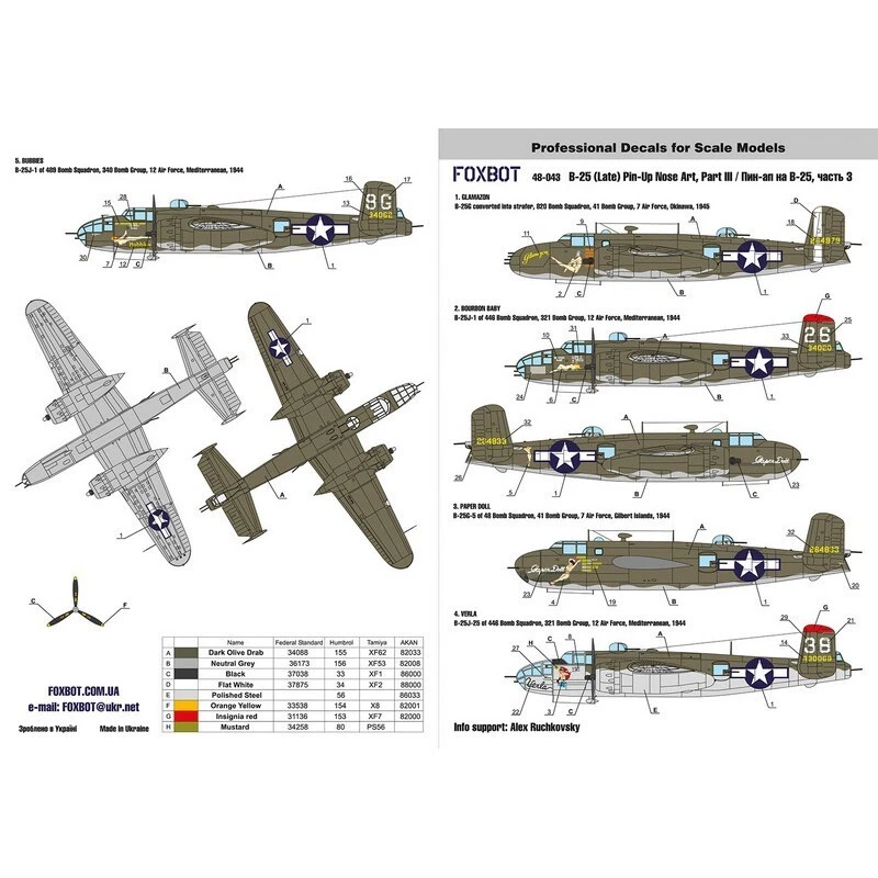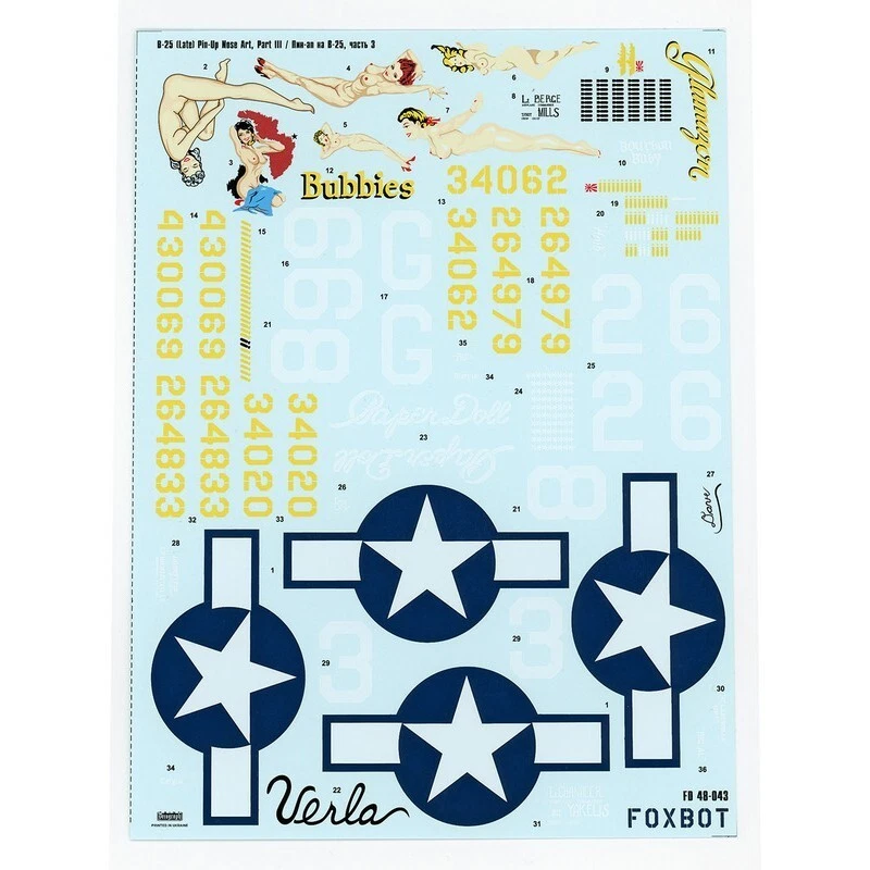 Foxbot Decals 1/48 North American B-25G/H/J Mitchell (Late) "Pin-Up Nose Art" Part # 3 (Stencils not included) Foxbot 48-043A Decals North American B-25G/J Mitchell ""Pin-Up Nose Art"" (Part III) - High Quality Scale: 1:48 Manufacturer: FoxBot (Ukraine) Country/Region of Manufacture: Ukraine Material: Decals Condition: New in Box Features: Kit High quality decals - 5 variants of assembly, for U.S.A.F. North American B-25G/J Mitchell Part # 3. Scale: 1/48. Package includes: 1 decal sheets Instruction Stencils are NOT included Suitable for model: For model kits: Academy, Accurate Miniatures, Hasegawa, Monogram, Pro Modeler, Revell kits Enhance your model kit with these high-quality decals from Foxbot. This set includes decals for 5 variants of the U.S.A.F. North American B-25G/J Mitchell aircraft, featuring stunning pin-up nose art. The decals are designed to scale 1/48. These decals are suitable for various model kits, including Academy, Accurate Miniatures, Hasegawa, Monogram, Pro Modeler, and Revell kits. They ensure a perfect fit for your North American B-25G/J Mitchell model. Add authenticity and detail to your model with these Foxbot decals. Order now and bring your U.S.A.F. North American B-25G/J Mitchell to life with beautiful pin-up nose art!