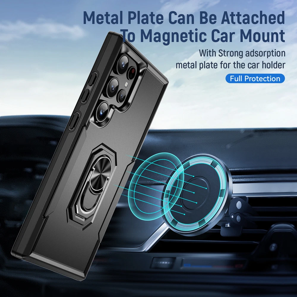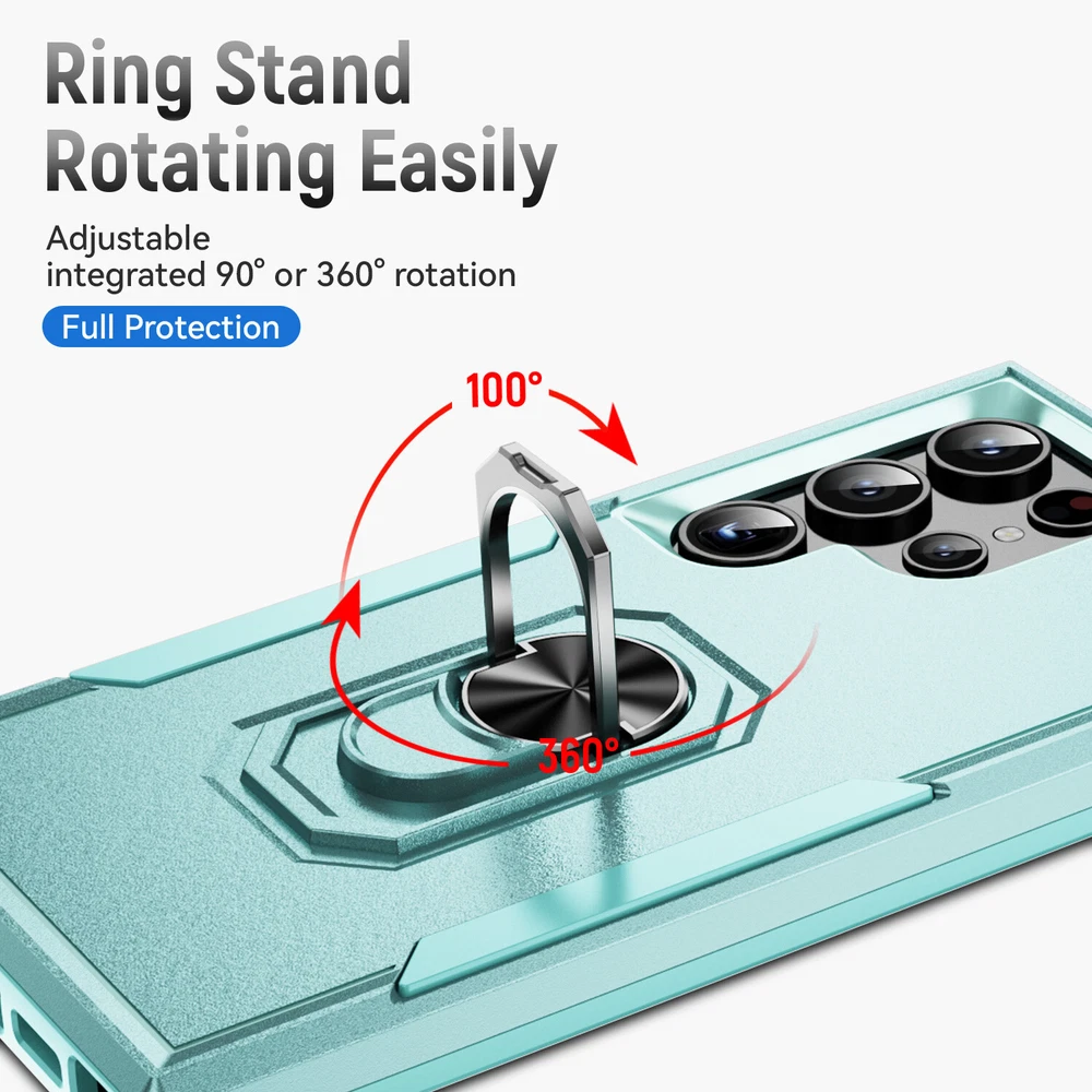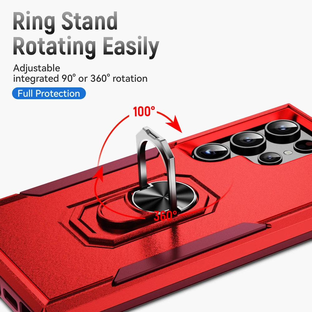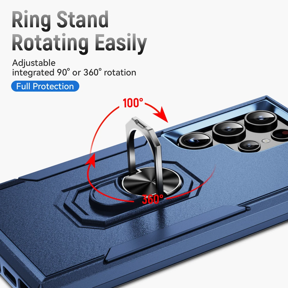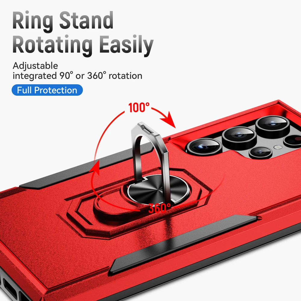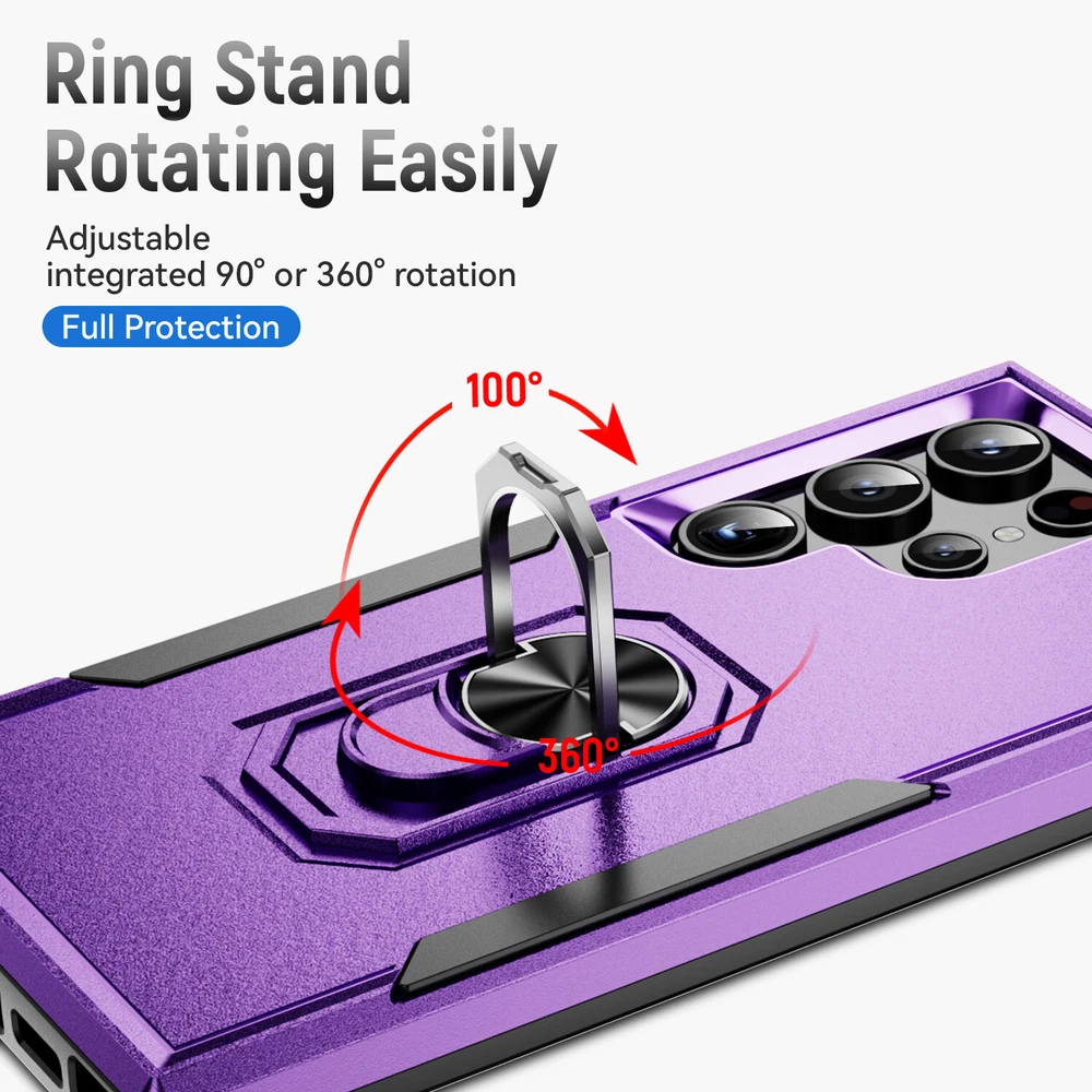 Fr Samsung Galaxy S25 Ultra S24 FE S23 Magnetic Ring Stand Case Screen Protector Key Features: 360° Rotating Magnetic Kickstand – Features a durable metal ring stand for hands-free video calls, streaming, or browsing, compatible with magnetic car mounts for added convenience. Shockproof & Durable Protection – Crafted with high-quality materials to guard your phone against drops, impacts, and scratches, ensuring long-lasting reliability. Precise Fit & Functionality – Designed with exact cutouts for buttons, ports, and the camera, offering seamless usability without removing the case. Lightweight & Comfortable Grip – Slim yet protective, this case provides a secure, ergonomic grip while maintaining your phone's sleek profile. Package: 1* Case Cover (Phone Is not included!) 1* Screen Protector