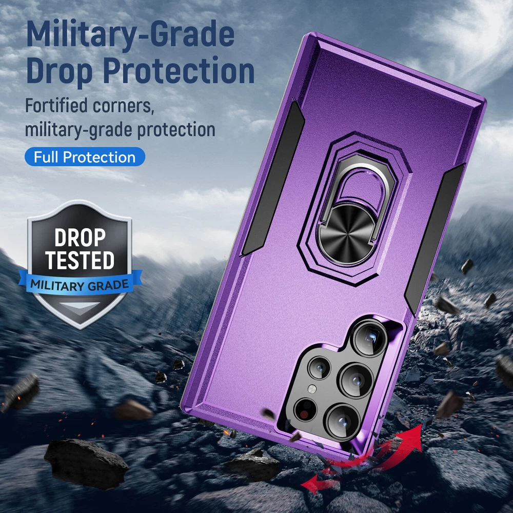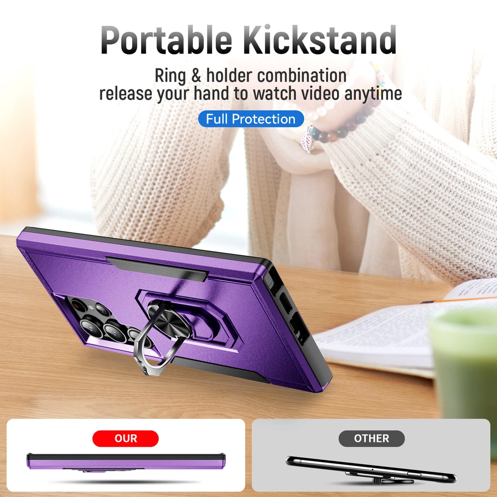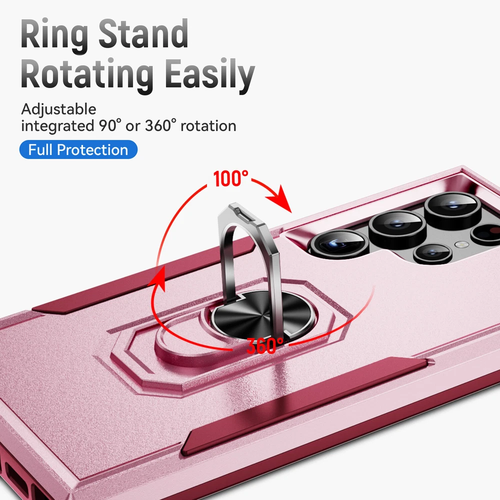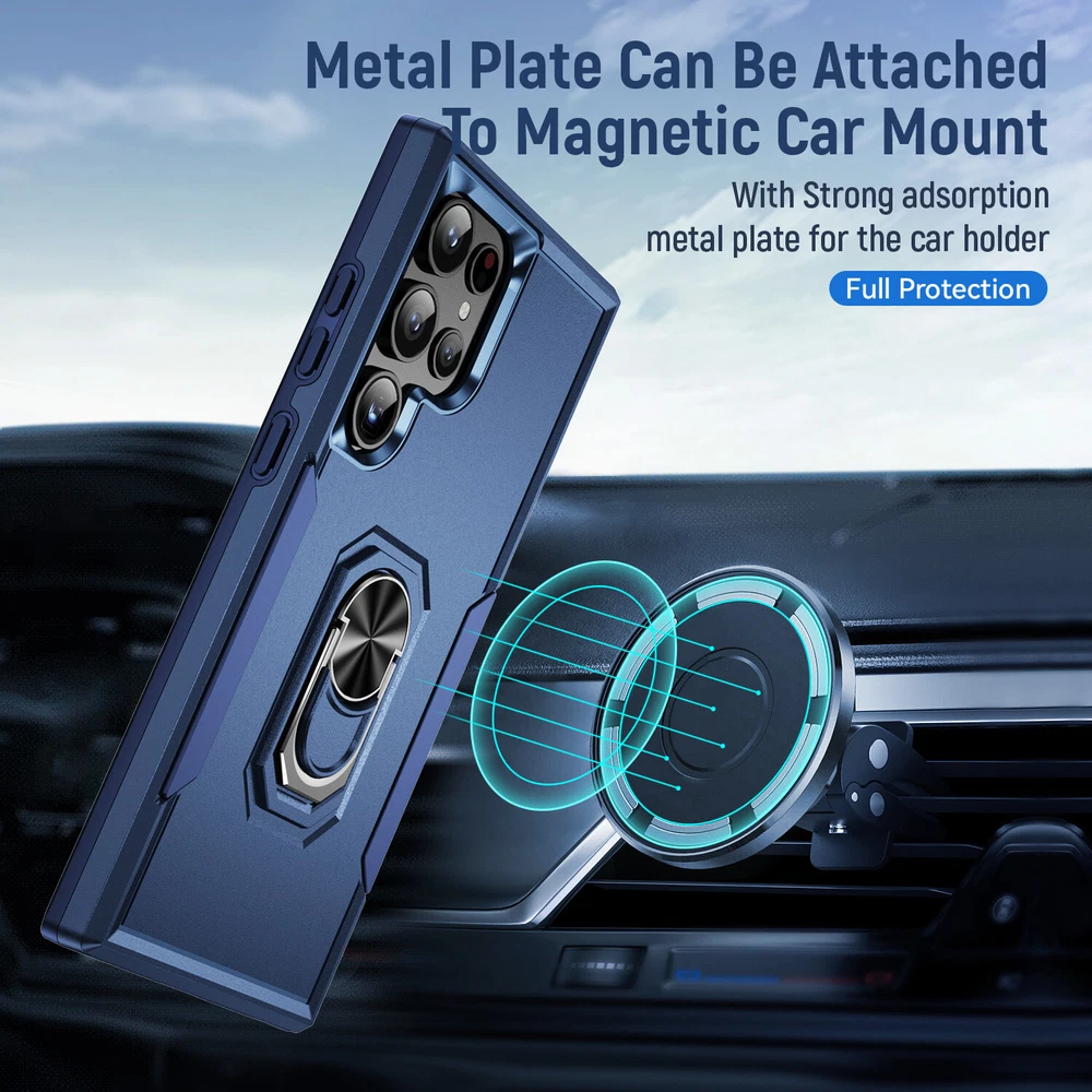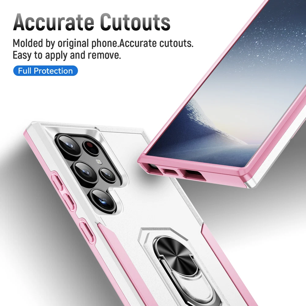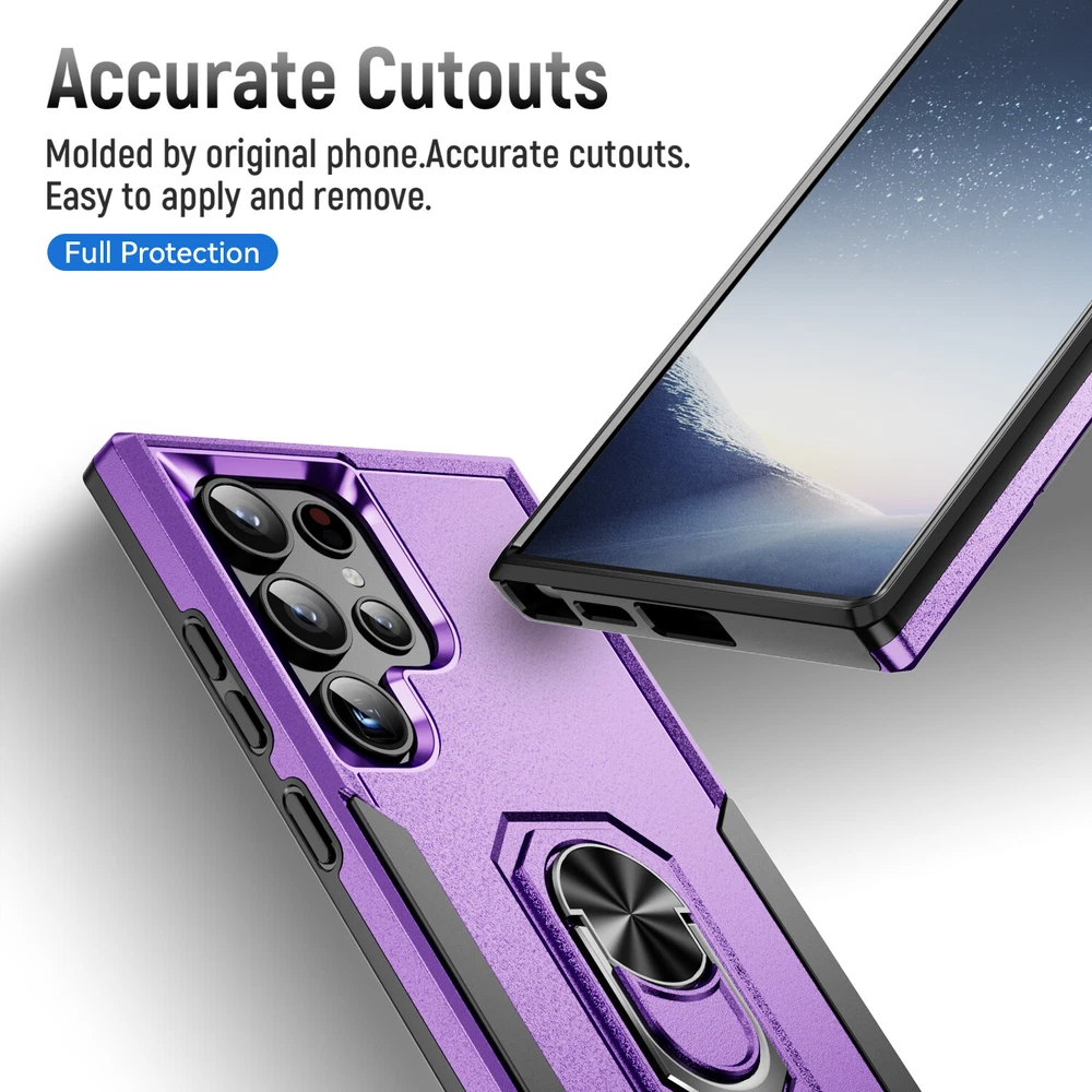 Fr Samsung Galaxy S25 Ultra S24 FE S23 Magnetic Ring Stand Case Screen Protector Key Features: 360° Rotating Magnetic Kickstand – Features a durable metal ring stand for hands-free video calls, streaming, or browsing, compatible with magnetic car mounts for added convenience. Shockproof & Durable Protection – Crafted with high-quality materials to guard your phone against drops, impacts, and scratches, ensuring long-lasting reliability. Precise Fit & Functionality – Designed with exact cutouts for buttons, ports, and the camera, offering seamless usability without removing the case. Lightweight & Comfortable Grip – Slim yet protective, this case provides a secure, ergonomic grip while maintaining your phone's sleek profile. Package: 1* Case Cover (Phone Is not included!) 1* Screen Protector