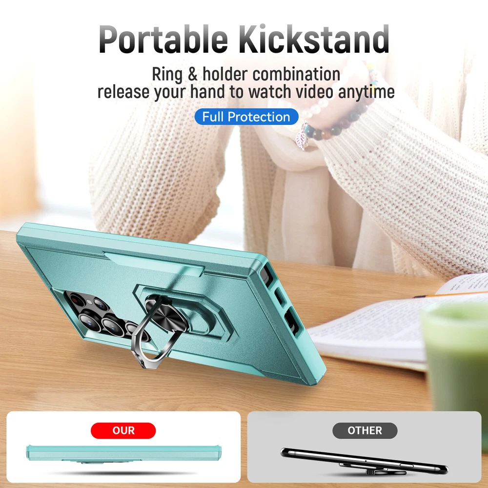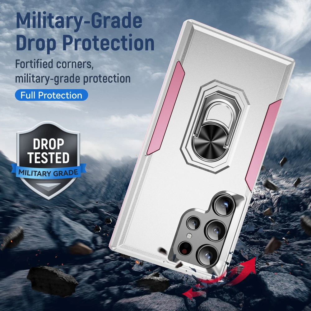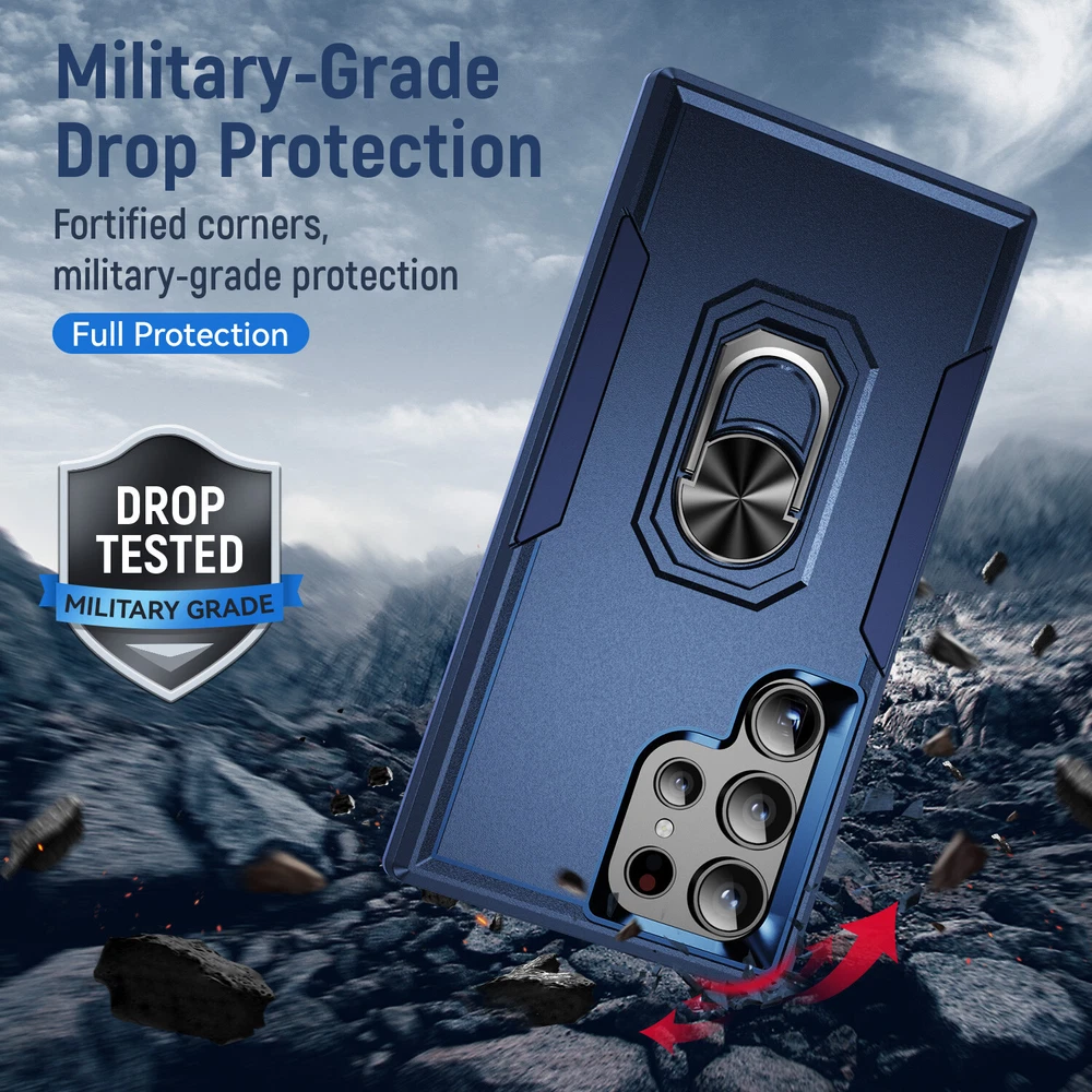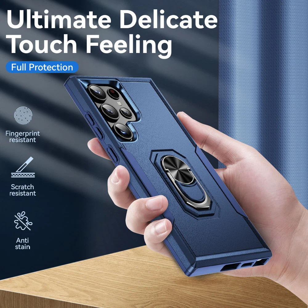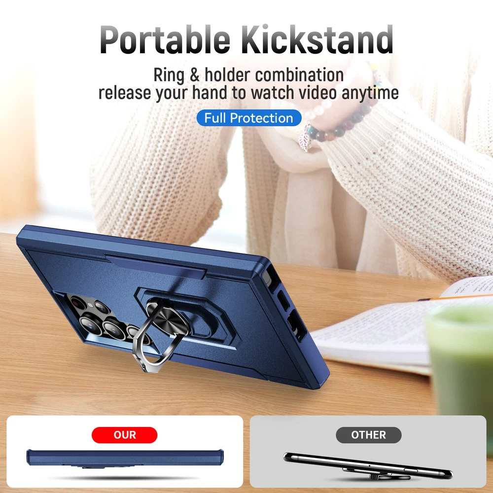 Fr Samsung Galaxy S25 Ultra S24 FE S23 Magnetic Ring Stand Case Screen Protector Key Features: 360° Rotating Magnetic Kickstand – Features a durable metal ring stand for hands-free video calls, streaming, or browsing, compatible with magnetic car mounts for added convenience. Shockproof & Durable Protection – Crafted with high-quality materials to guard your phone against drops, impacts, and scratches, ensuring long-lasting reliability. Precise Fit & Functionality – Designed with exact cutouts for buttons, ports, and the camera, offering seamless usability without removing the case. Lightweight & Comfortable Grip – Slim yet protective, this case provides a secure, ergonomic grip while maintaining your phone's sleek profile. Package: 1* Case Cover (Phone Is not included!) 1* Screen Protector