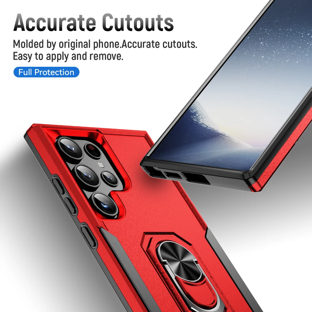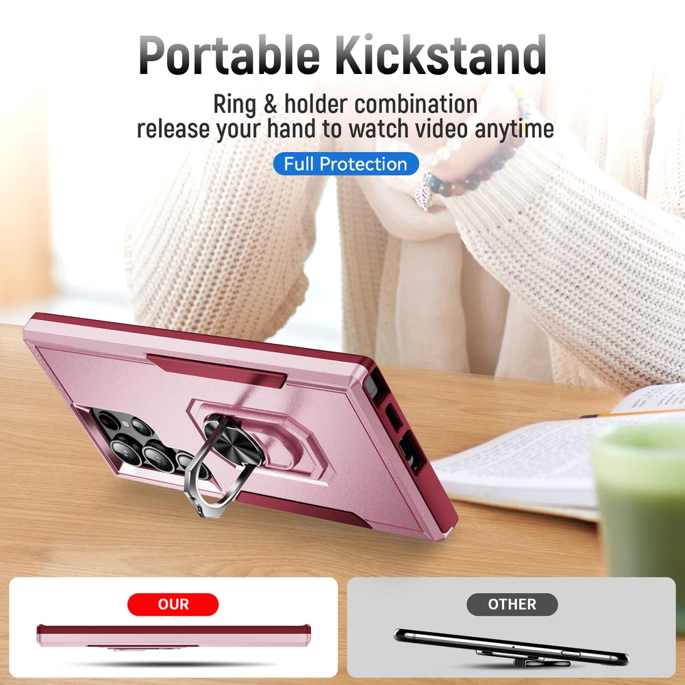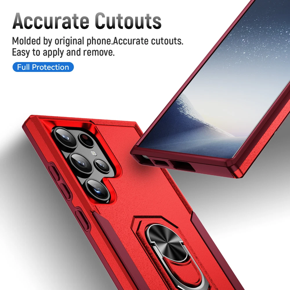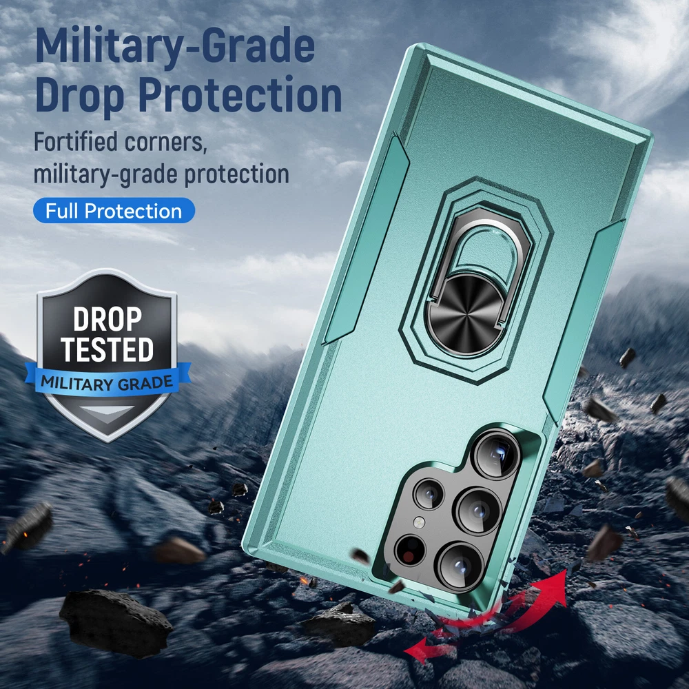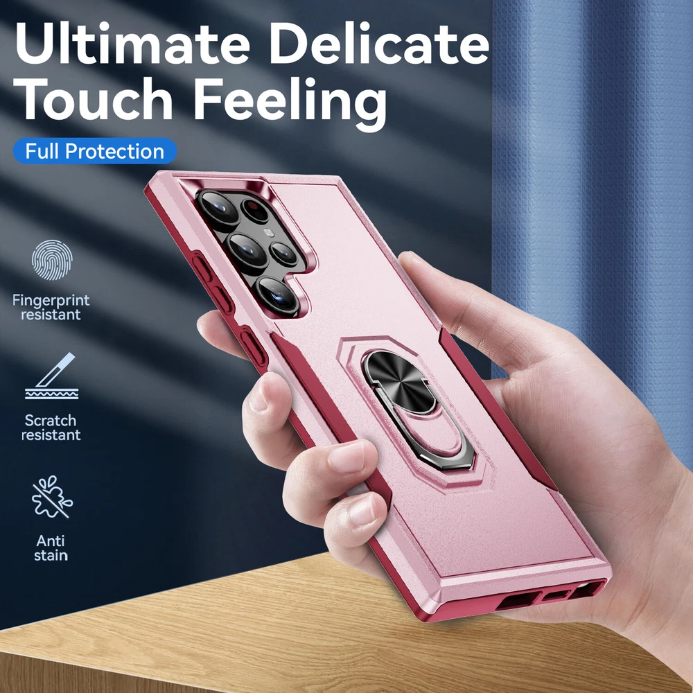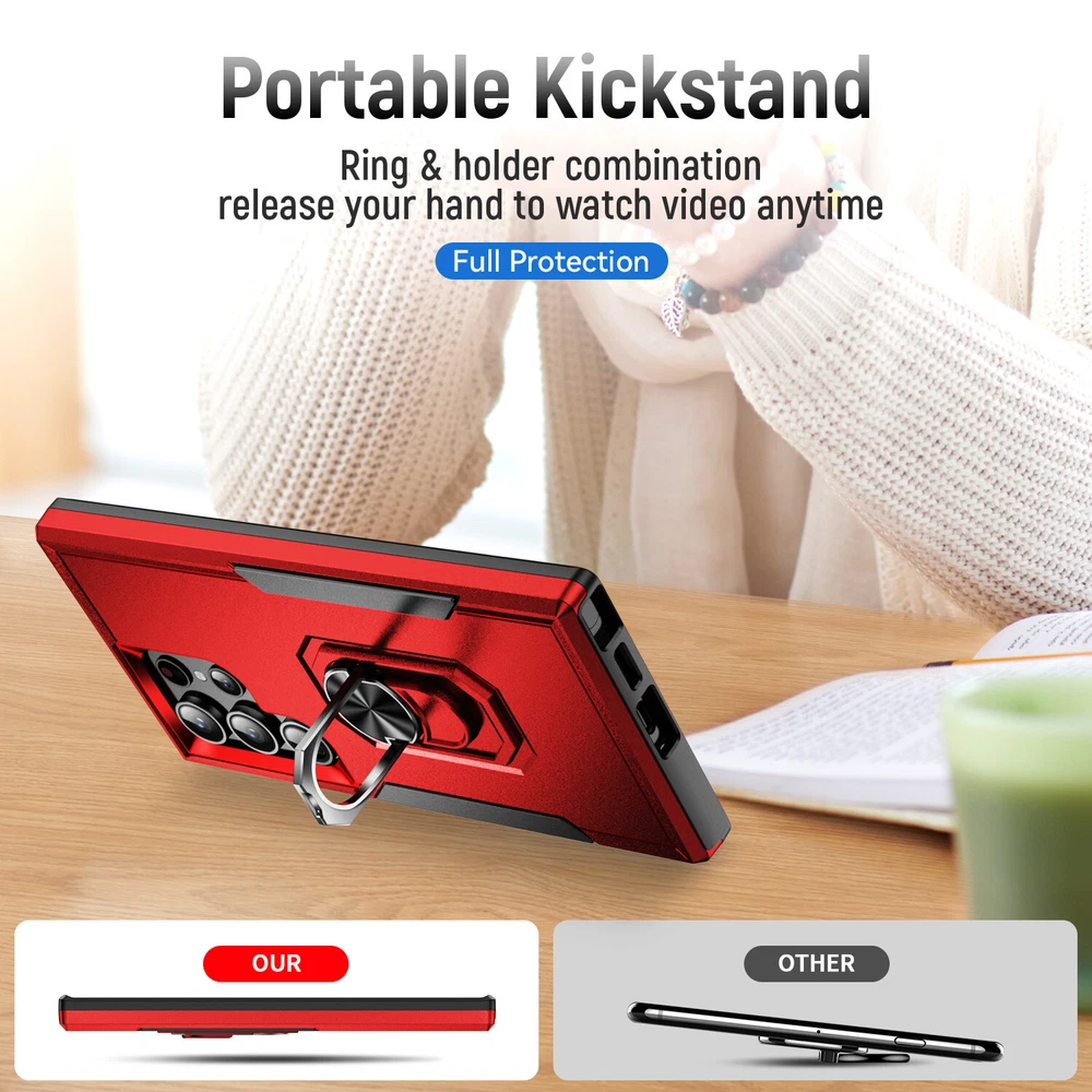 Fr Samsung Galaxy S25 Ultra S24 FE S23 Magnetic Ring Stand Case Screen Protector Key Features: 360° Rotating Magnetic Kickstand – Features a durable metal ring stand for hands-free video calls, streaming, or browsing, compatible with magnetic car mounts for added convenience. Shockproof & Durable Protection – Crafted with high-quality materials to guard your phone against drops, impacts, and scratches, ensuring long-lasting reliability. Precise Fit & Functionality – Designed with exact cutouts for buttons, ports, and the camera, offering seamless usability without removing the case. Lightweight & Comfortable Grip – Slim yet protective, this case provides a secure, ergonomic grip while maintaining your phone's sleek profile. Package: 1* Case Cover (Phone Is not included!) 1* Screen Protector