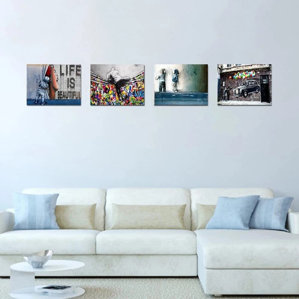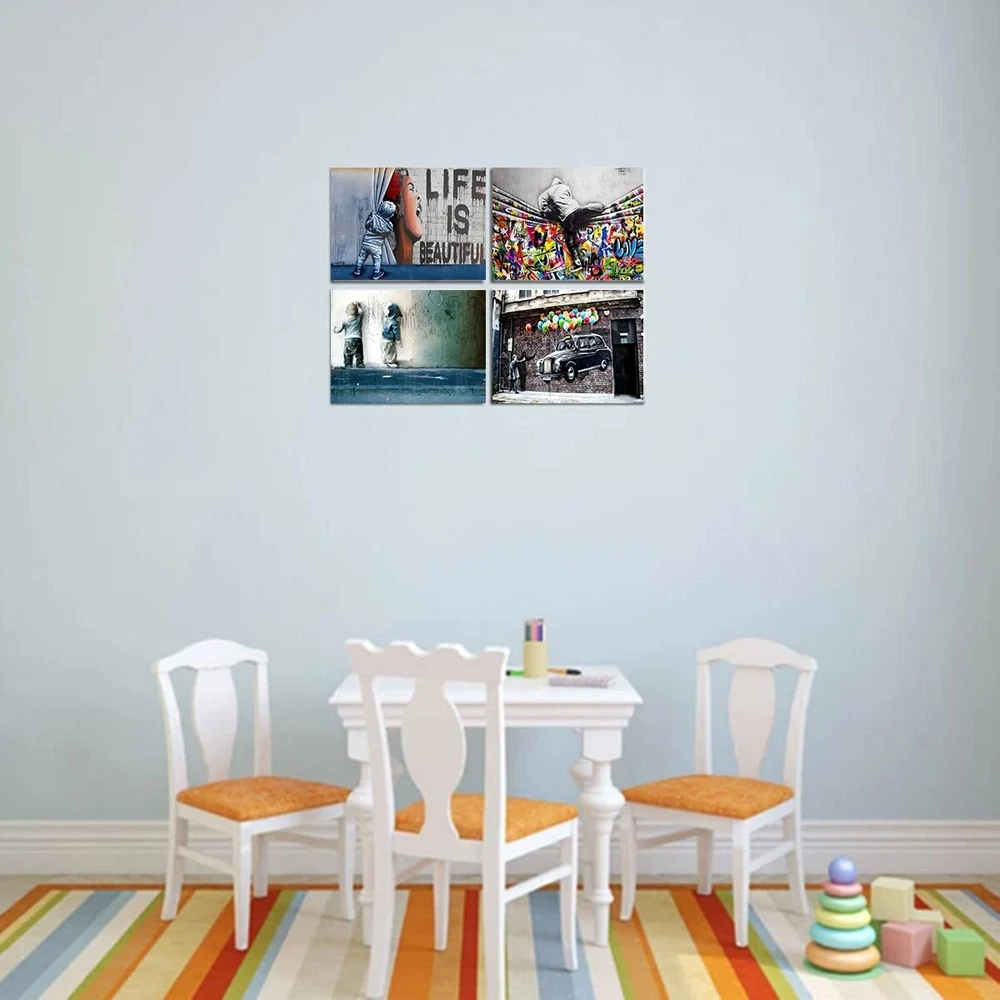 Framed Banksy Street Graffiti Wall Art Decor Large Abstract Pictures Canvas Painting Prints Colorful Modern Contemporary Poster Artwork Stretched for Wall Home Bathroom Bedroom Living Room Ready Hang 1.Framed Banksy wall art Prints On Canvas . High quality, high resolution High Definition Giclee pictures prints on premium artistic canvas. Stretched and Framed decor canvas paintings ready to hang for home living room bedroom office decorations wall decor. 2.Behind each panel canvas prints has a black hook already mounted on the wooden bar for easy to hang. modern wall decor for living room bedroom, kitchen, house, office, hotel, dining room, bar etc, makes your room look full of vitality and creativity. 3. Fashion abstract poster is the perfect wall decoration painting, home decorations and office decorations ,cuadros de pared de sala ,canvas wall art is the modern way to brighten the wall of your family, and relax after work. Perfect gift idea for wedding, anniversary, thanksgiving, christmas, mother's day, father's day, holidays, Valentine's Day, birthday and others. 4.Banksy art wall room decor for living room is a great gift for your family, western decor for bedroom, friends and relatives, teens rooms, kids room, girls or boys room. Due to different brands of monitors the actual wall art color may be slightly different from the product image. 5.Landscape wall art, minimalist line wall art Look great as an decorations,succulent wall decor, cute wall decor, black art wall decor, orange bathroom decor, wall art bedroom aesthetic,and it brings a unique and cool feeling to the entire experience. If there is any problem just contact us,we will try our best to help you.