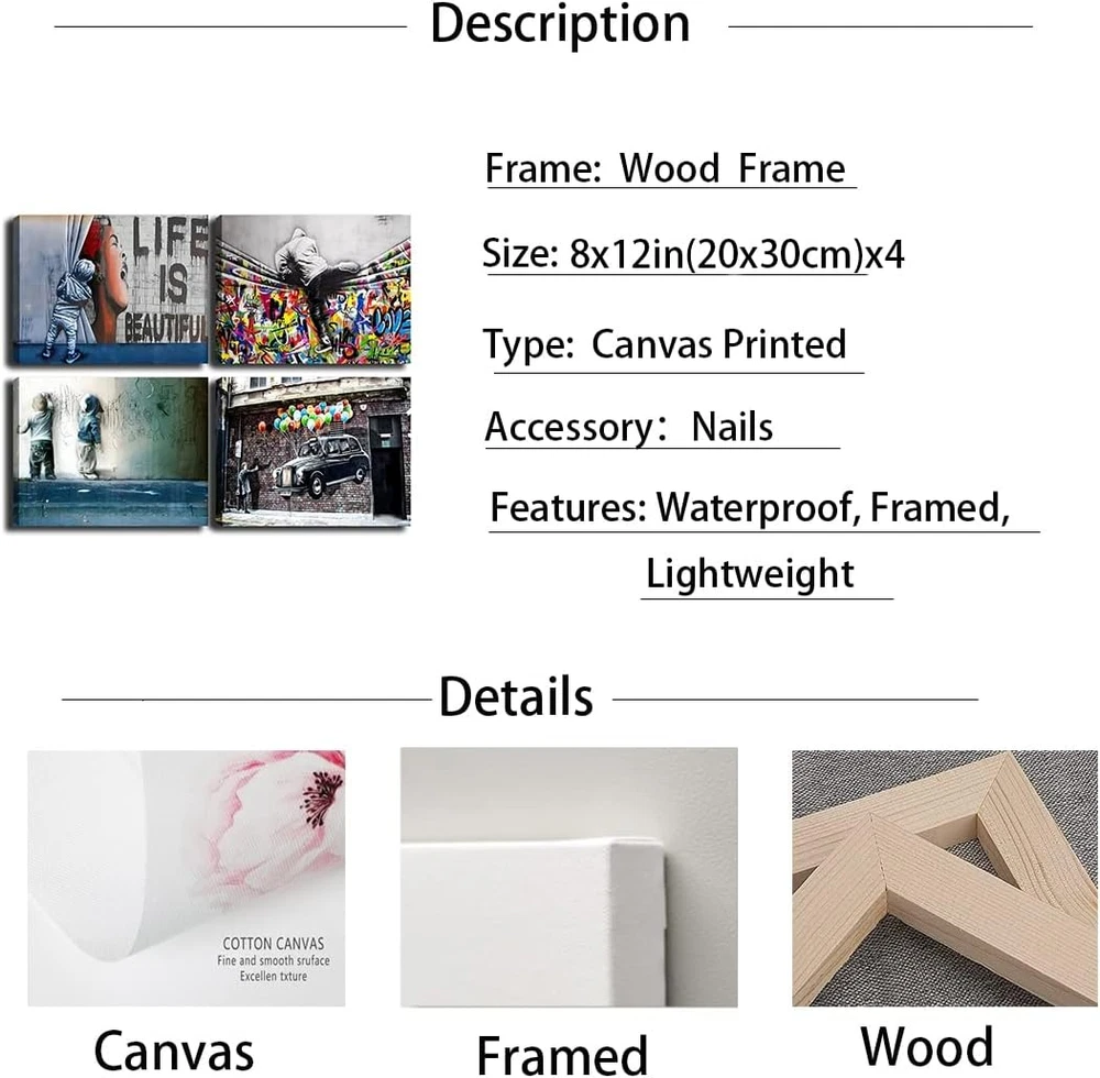Store New Arrivals Add to Favorite View Feedback Contact Framed Banksy Street Graffiti Wall Art Decor Large Abstract Pictures Canvas Painting Prints Colorful Modern Contemporary Poster Artwork Stretched for Wall Home Bathroom Bedroom Living Room Ready Hang (Framed-019, 8X12Inch(20X30Cm)X4) Description Color Framed-019 Product Dimensions 12 x 8 x 0.2 inches Country of Origin China Item Weight 1.6 pounds Size 8x12inch(20x30cm)x4 1.Framed Banksy wall art Prints On Canvas . High quality, high resolution High Definition Giclee pictures prints on premium artistic canvas. Stretched and Framed decor canvas paintings ready to hang for home living room bedroom office decorations wall decor. 2.Behind each panel canvas prints has a black hook already mounted on the wooden bar for easy to hang. modern wall decor for living room bedroom, kitchen, house, office, hotel, dining room, bar etc, makes your room look full of vitality and creativity. 3. Fashion abstract poster is the perfect wall decoration painting, home decorations and office decorations ,cuadros de pared de sala ,canvas wall art is the modern way to brighten the wall of your family, and relax after work. Perfect gift idea for wedding, anniversary, thanksgiving, christmas, mother's day, father's day, holidays, Valentine's Day, birthday and others. 4.Banksy art wall room decor for living room is a great gift for your family, western decor for bedroom, friends and relatives, teens rooms, kids room, girls or boys room. Due to different brands of monitors the actual wall art color may be slightly different from the product image. 5.Landscape wall art, minimalist line wall art Look great as an decorations,succulent wall decor, cute wall decor, black art wall decor, orange bathroom decor, wall art bedroom aesthetic,and it brings a unique and cool feeling to the entire experience. If there is any problem just ,we will try our best to help you. Framed Banksy Street Graffiti Wall Art Decor Large Abstract Pictures Canvas Painting Prints Colorful Modern Contemporary Poster Artwork Stretched for Wall Home Bathroom Bedroom Living Room Ready Hang ABOUT US We offer the best prices around on high quality products. Our E-store includes media such as books, movies, music and games while offering electronics, toys, sporting apparel, clothing, tools, general home, garden items and more. SHIPPING We are always working hard to ensure your package arrives as soon as possible. Please understand that some factors like weather, high postal traffic, and the performance of shipping companies are outside of our control. We offer free shipping to the lower 48 states and ship within 2 business days of payment, usually sooner. We do not accept P.O. Boxes. Please provide a physical address. For shipping outside of the continental USA, we only use eBay's Global Shipping Program.The item is shipped to KY and then sent to the rest of the world. International customers are responsible for all duties and taxes. Continue to check out in order to calculate costs for shipping the item to your country. Messages regarding eBay's Global Shipping Program MUST be directed at eBay EXCLUSIVELY. RETURNS We offer a 30-Day Return Policy on items which you are not completely satisfied with. You have the option for a full-refund or an exchange of the item. No returns are available on items shipped outside of the USA. PAYMENT We accept PayPal. CONTACT US This page content is yet to come Please ad us to your favorite seller and visit again later Thank You CUSTOMER SATISFACTION We try our very best to make sure every customer is completely satisfied. If there's a problem, message us! We're happy to help. WE ACCEPT Copyright © 2021 AutoDS. | All Rights Reserved