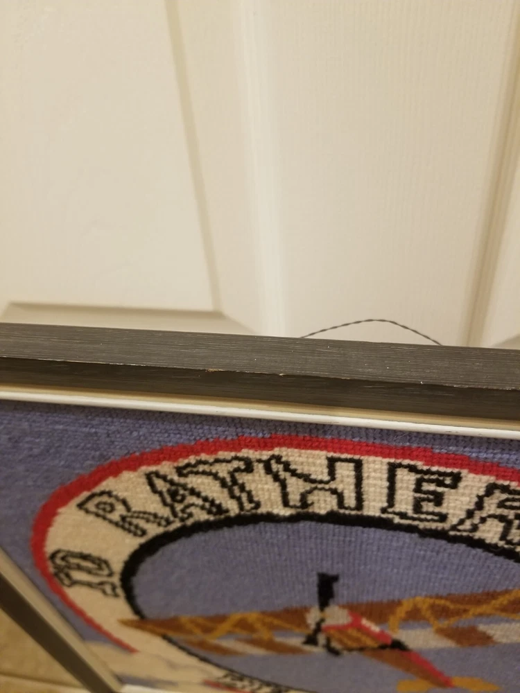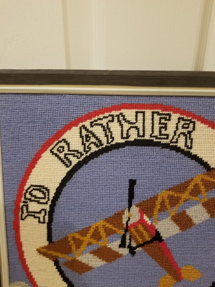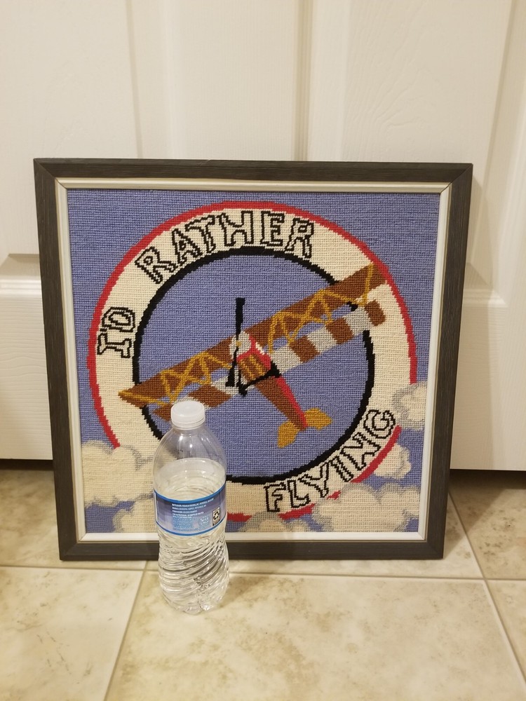 Framed 'I'd rather be flying' airplane needlepoint wall decor hand stitched vintage The frame is bout 15.5 x 15.5 inch, needlepoint is about 13.5 x 13.5 inch In good condition, the back has hanging wire