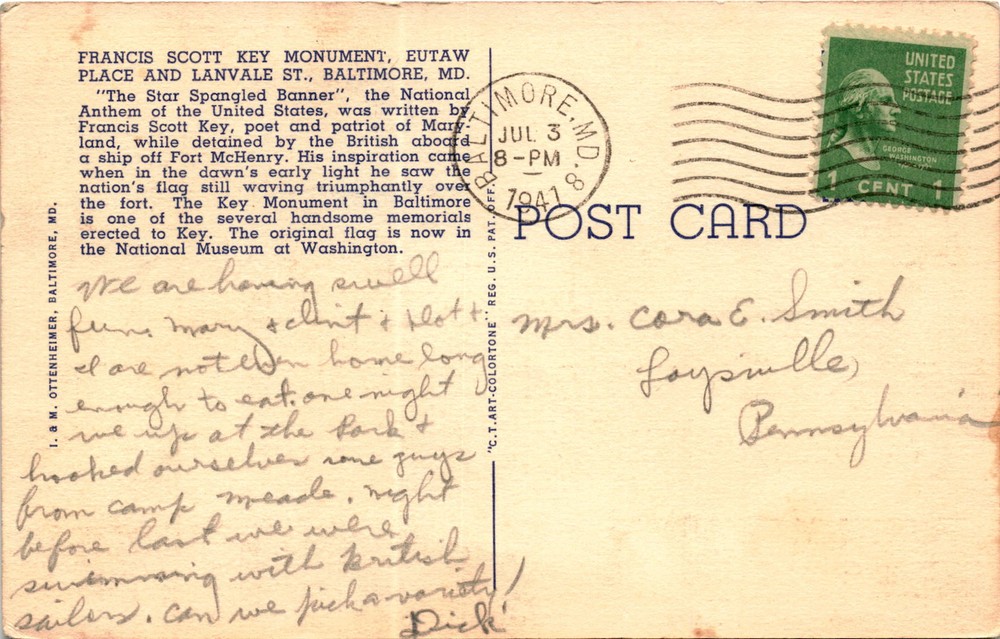 MAKE AN OFFER. THE MORE YOU BUY THE BETTER DEAL I WILL ACCEPT The postcard features an image of the Francis Scott Key Monument in Baltimore, Maryland, which commemorates the poet and patriot who wrote The Star-Spangled Banner, the national anthem of the United States.