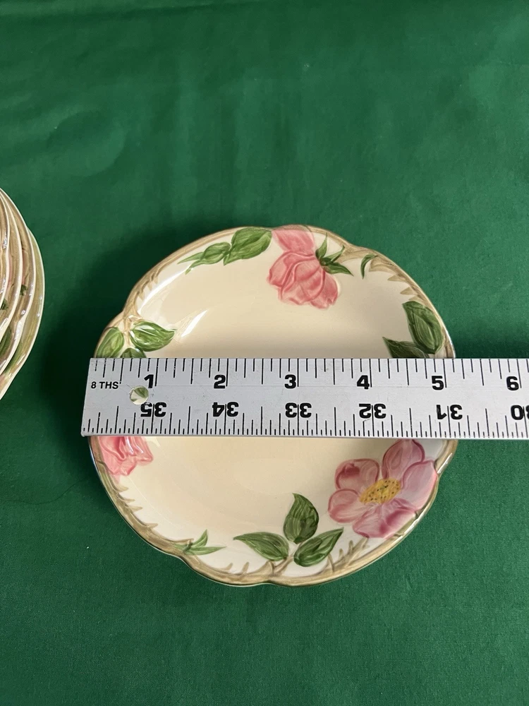 The Franciscan Vintage Desert Rose Dinnerware set includes 94 pieces with matching stamps, featuring a pink and green floral pattern on round ceramic plates. Produced in 1941 with a glossy finish, this mid-20th-century set is perfect for all occasions and includes various pieces such as salad bowls, dessert plates, soup bowls, and more. With its original production style and technique, this vintage dinnerware collection from the United States is a rare find for collectors and those looking to add a touch of flower-themed elegance to their dining experience.