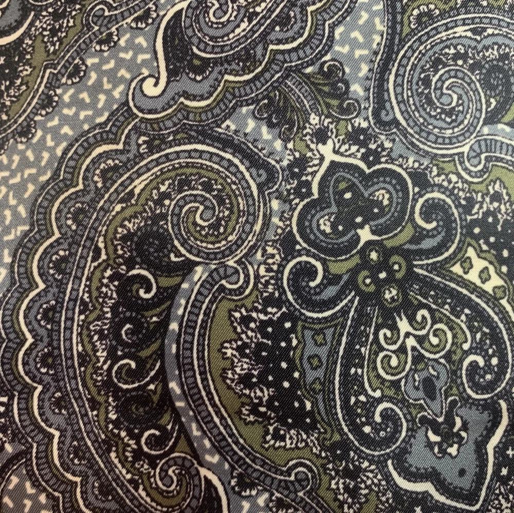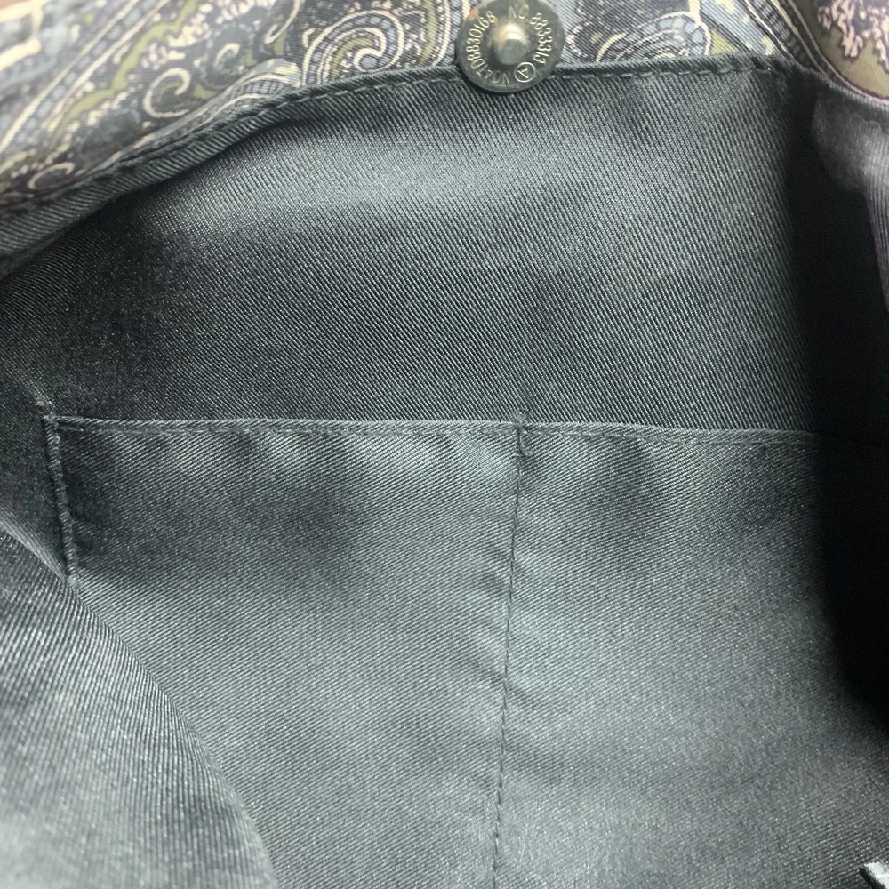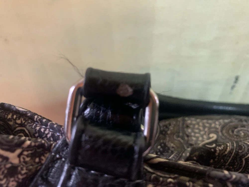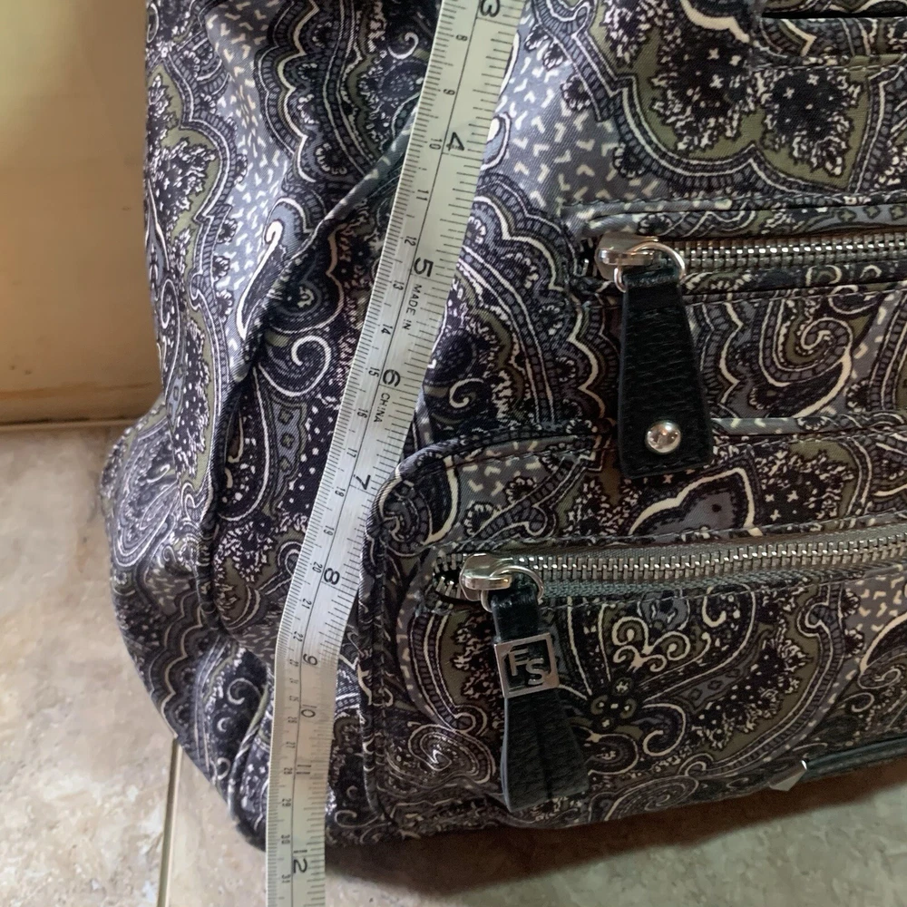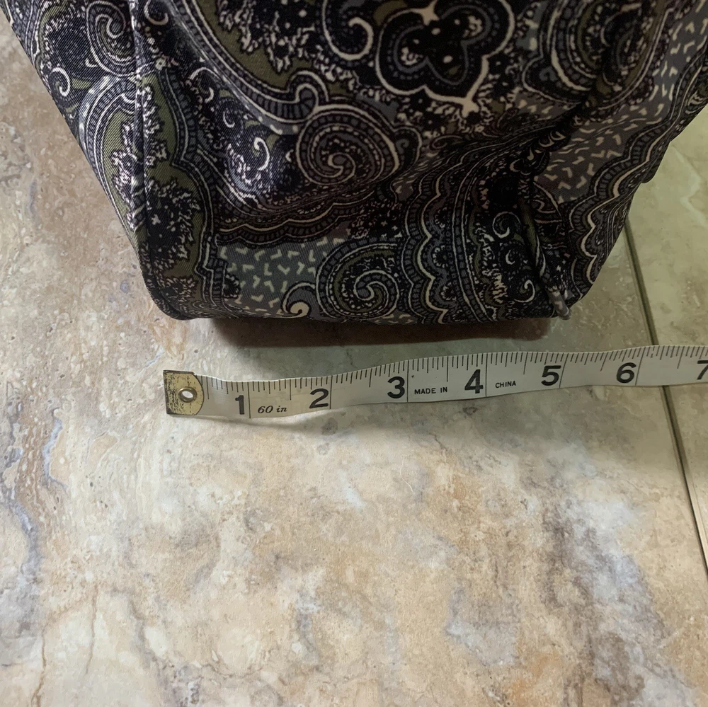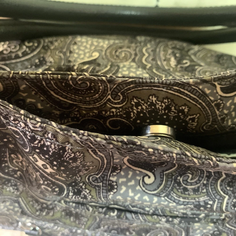 This is a beautiful warm colored shoulder bag, perfect for the cooler weather. There is a small wear spot(pictured) under one handle; not easily spotted. There is no long shoulder strap. It’s so clean and comes from a smoke free home. This stylish Franco Sarto shoulder bag is perfect for any occasion. The beautiful paisley pattern in a mix of black, warm green, grey, and white colors gives it a retro vibe that is sure to turn heads. The bag has a zip and snap closure and features both inner and outer pockets for ample storage space. Measuring 14 inches in width, 12 inches in height(not including handle height), and 5 1/2 This inches in depth, this medium-sized bag is made of durable polyester material and has a black handle/strap color. The hardware color is silver, and the bag's lining color is black With its spacious interior and multiple pockets, this bag is perfect for everyday use or as a purse for a night out. Thank you for visiting my eBay store. Please feel free to reach out if you require further information about this beautiful handbag.