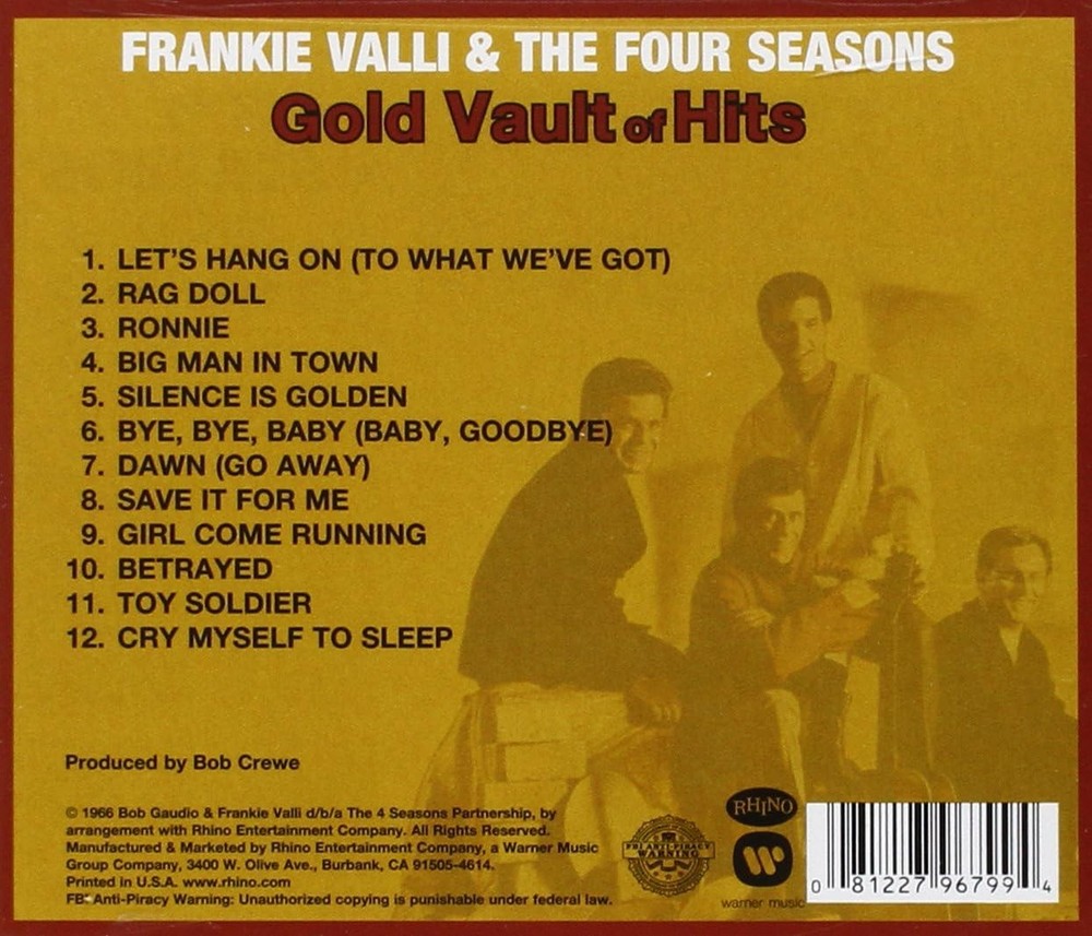 Further Details Title: Gold Vault of Hits Condition: New Description: The falsettoed wonder of Frankie Valli and The Four Seasons are a delight with a dozen of their greatest hits. Country/Region of Manufacture: UK Format: CD Artist: Frankie Valli and the Four Seasons EAN: 0081227967994 Genre: Pop Language: English No Of Discs: 1 Record Label: Rhino Type: Europa MPN: 26172023 Release Date: 2013 Release Year: 2013 Missing Information? Please contact us if any details are missing and where possible we will add the information to our listing.