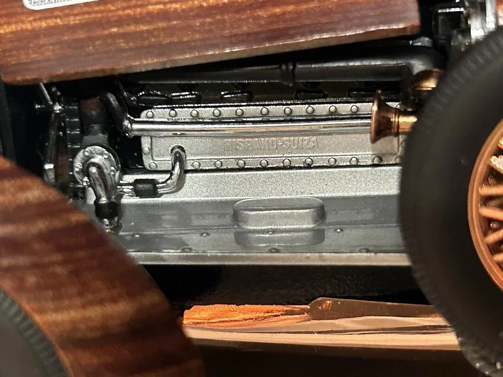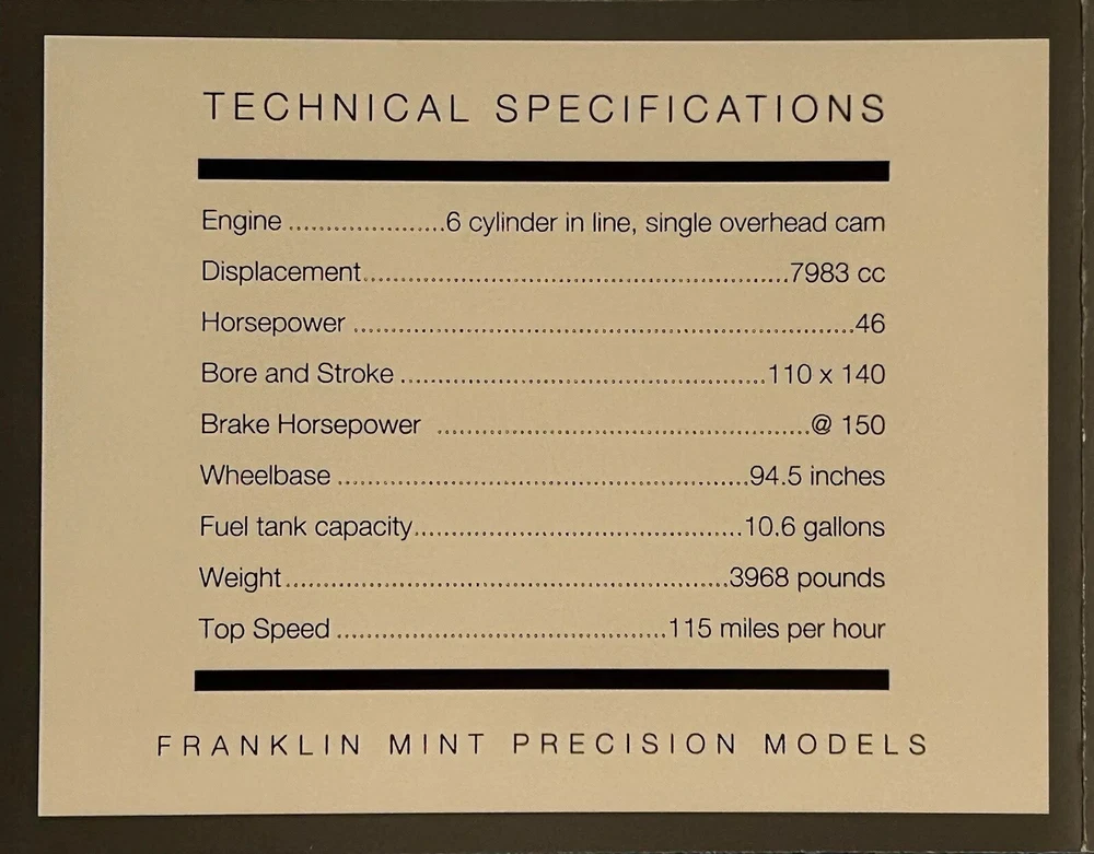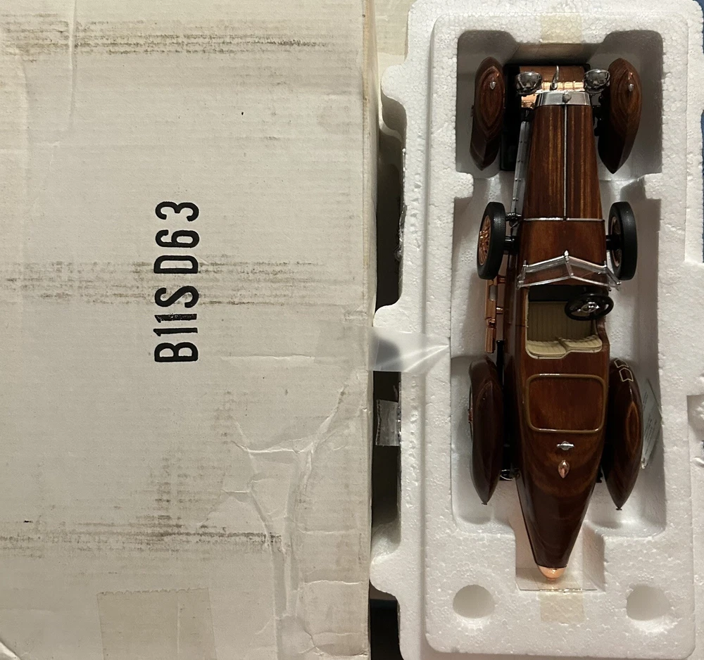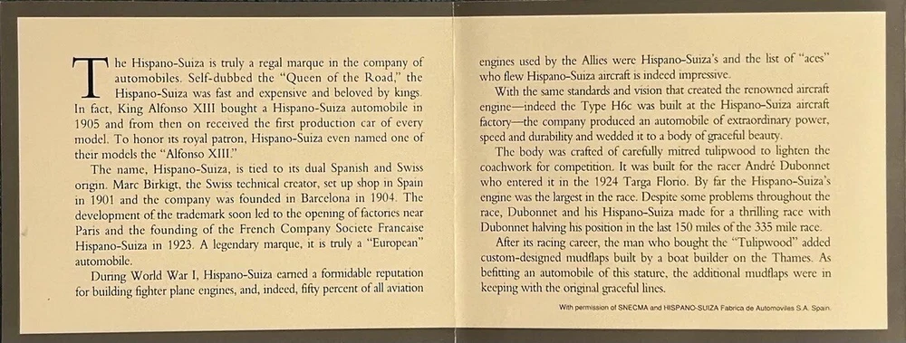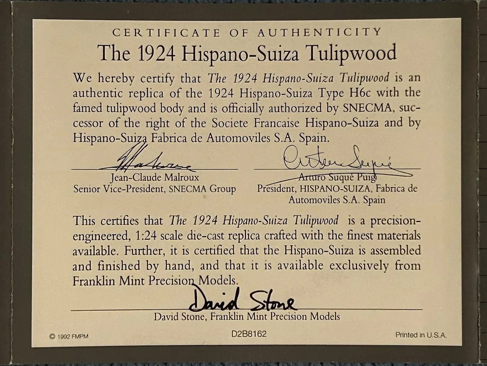 Here’s a Franklin Mint 1924 Hispano-Suiza Type H6c Speedster Model Replica was exclusively offered in 1993 to their Franklin Mint Club Members. The original 1924 Hispano-Suiza Type H6c Speedster Automobile dubbed “Queen of the Road” was a very expensive purchase and was beloved by King Alfonso XIII, who in 1905 purchased his first and inspired him to buy one every new production year from then on. During World War I, Hispano-Suiza earned a formidable reputation for building fast dependable aircraft engines with more than half of all aircraft being powered by Hispano-Suiza aircraft engines. Encompassing the same standards and vision as the aircraft engine, the Type H6c automobile was built at the same Hispano-Suiza Aircraft Factory producing power, speed, and durability. Hand-Assembled and Hand-Finished using the finest Tulipwood and Genuine Copper materials, this magnificently crafted work of art includes the signed Certificate of Authenticity, Hang Information Tag, The Care and Handling Instructions, Technical Specifications Data, The Hispano-Suiza Type H6c Speedster Tulipwood Story, Both Engine Plan and Driver’s Compartment Layouts, Display Case Full-Color Brochure, Custom Styrofoam Container, and Shipping Box. Take advantage of this opportunity to add this unique pristine museum level of superior magnificent’s to your collection today.