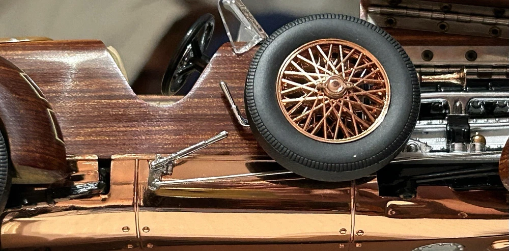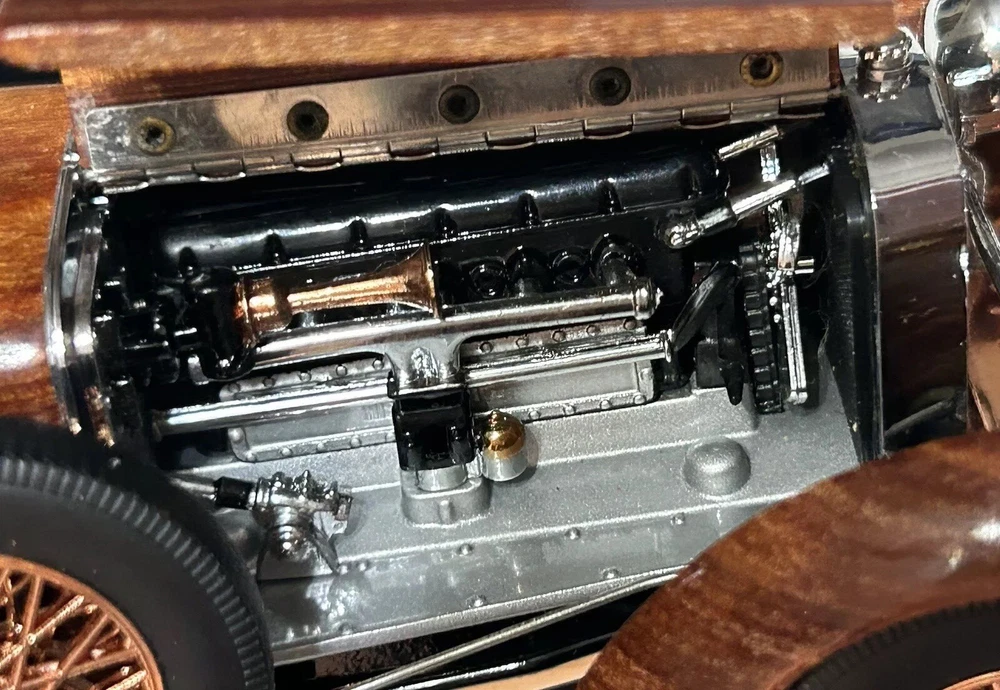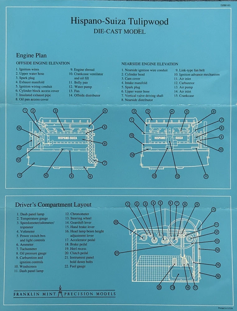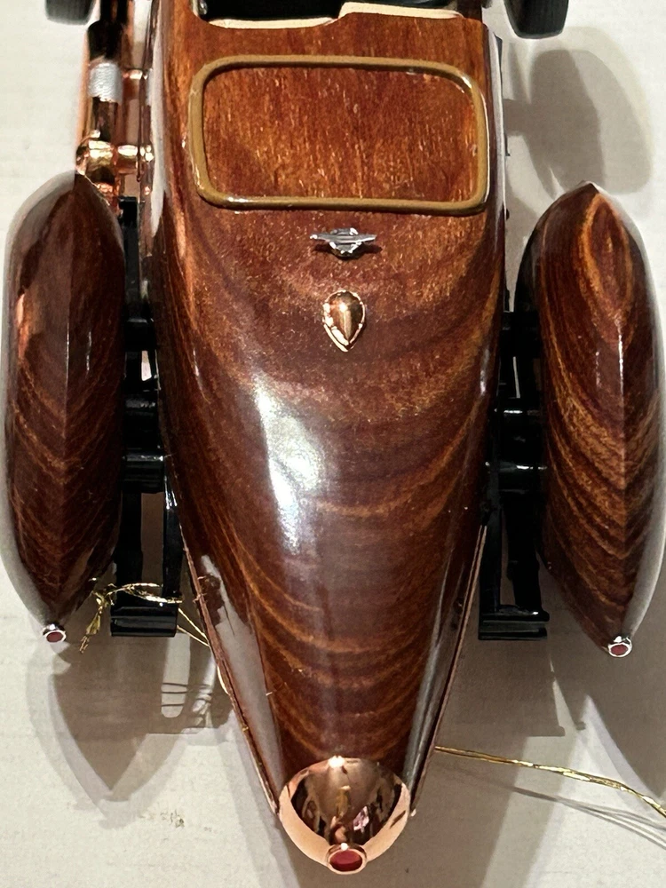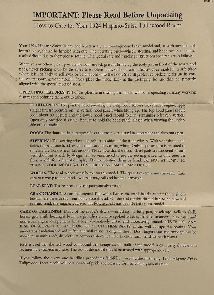 Here’s a Franklin Mint 1924 Hispano-Suiza Type H6c Speedster Model Replica was exclusively offered in 1993 to their Franklin Mint Club Members. The original 1924 Hispano-Suiza Type H6c Speedster Automobile dubbed “Queen of the Road” was a very expensive purchase and was beloved by King Alfonso XIII, who in 1905 purchased his first and inspired him to buy one every new production year from then on. During World War I, Hispano-Suiza earned a formidable reputation for building fast dependable aircraft engines with more than half of all aircraft being powered by Hispano-Suiza aircraft engines. Encompassing the same standards and vision as the aircraft engine, the Type H6c automobile was built at the same Hispano-Suiza Aircraft Factory producing power, speed, and durability. Hand-Assembled and Hand-Finished using the finest Tulipwood and Genuine Copper materials, this magnificently crafted work of art includes the signed Certificate of Authenticity, Hang Information Tag, The Care and Handling Instructions, Technical Specifications Data, The Hispano-Suiza Type H6c Speedster Tulipwood Story, Both Engine Plan and Driver’s Compartment Layouts, Display Case Full-Color Brochure, Custom Styrofoam Container, and Shipping Box. Take advantage of this opportunity to add this unique pristine museum level of superior magnificent’s to your collection today.