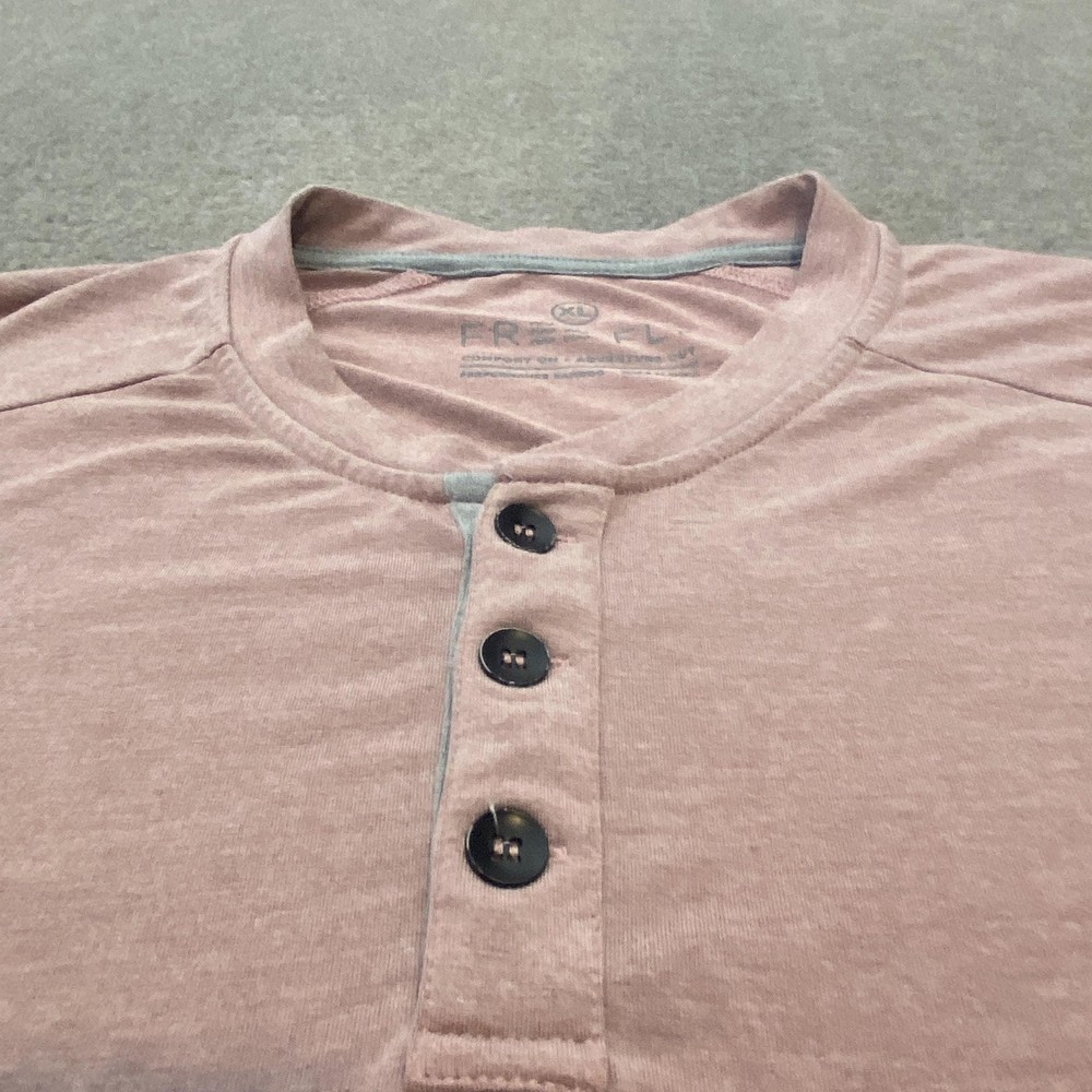 Free Fly Henley Shirt Mens XL Pink Long Sleeve Condition: Gently worn, no visible flaws Material: 64% Viscose from Bamboo, 28% Polyester Fiber, 8% Spandex Performance bamboo fabric for soft, breathable comfort Four-button henley placket Tag size: XL (Mens) Brand markings: Free Fly Comfort On. Adventure Out. logo and chest print