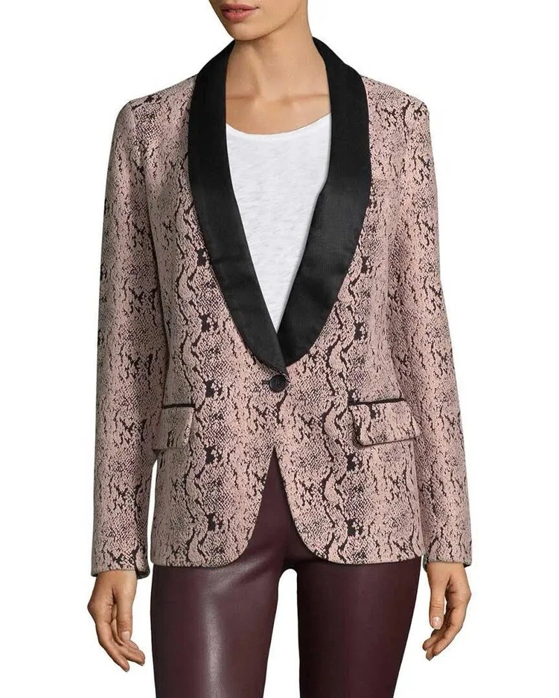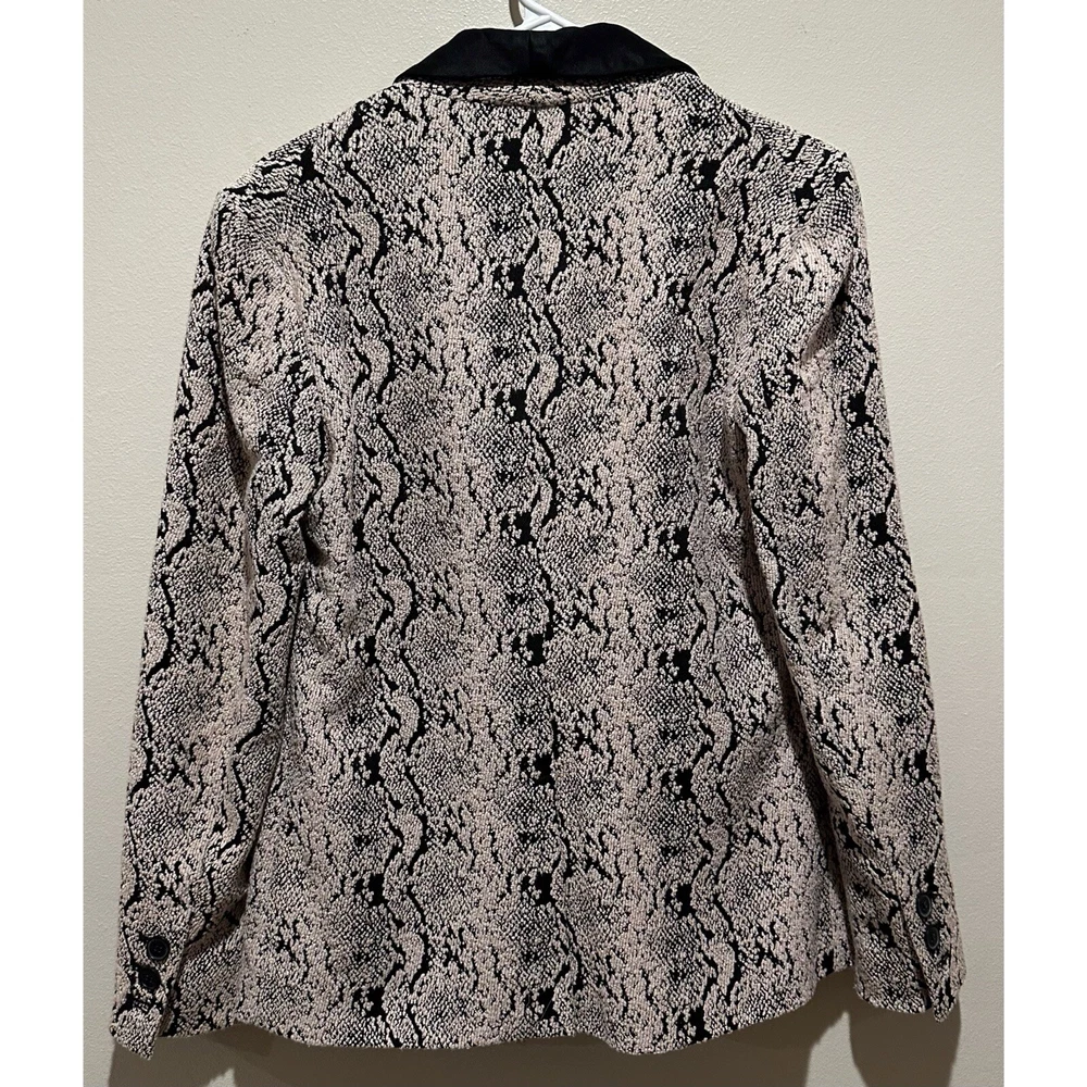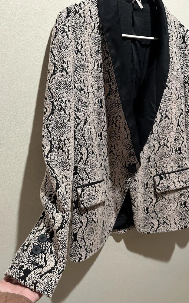 Elevate your style game with this stunning Free People Jacquard Snakeskin Tuxedo Jacket Tapestry Blazer. The mid-length blazer features an animal print pattern in a multicolor palette, with a collared neckline and button closure. The outer shell is made of soft cotton, and the lining is made of polyester, providing comfort and breathability. • Black Satin Shawl Collar • Fully Lined • Faux Flap Pockets • Single Back Vent is Still Stitched Closed • One Button Closure • 40% Polyester, 37% Cotton, 22% Rayon, 1% Spandex Measurements Chest 19" lying flat Shoulder 16" lying flat Sleeve 22" Length 28" from fold of collar to end of garment No rips holes or stains! EXCELLENT CONDITION!