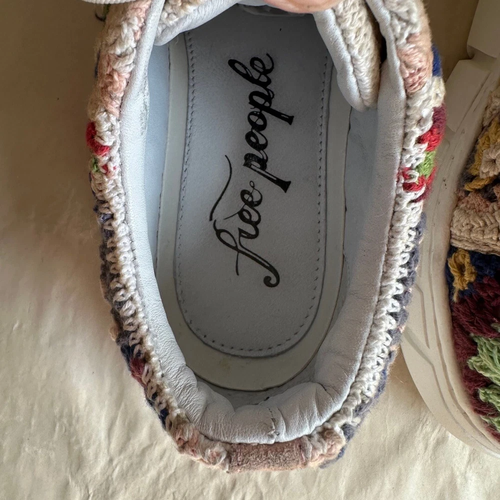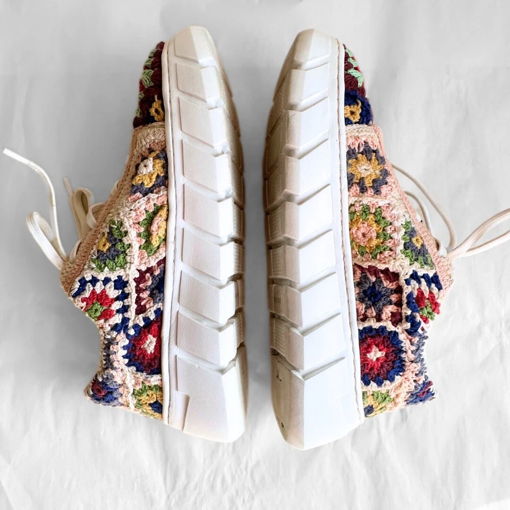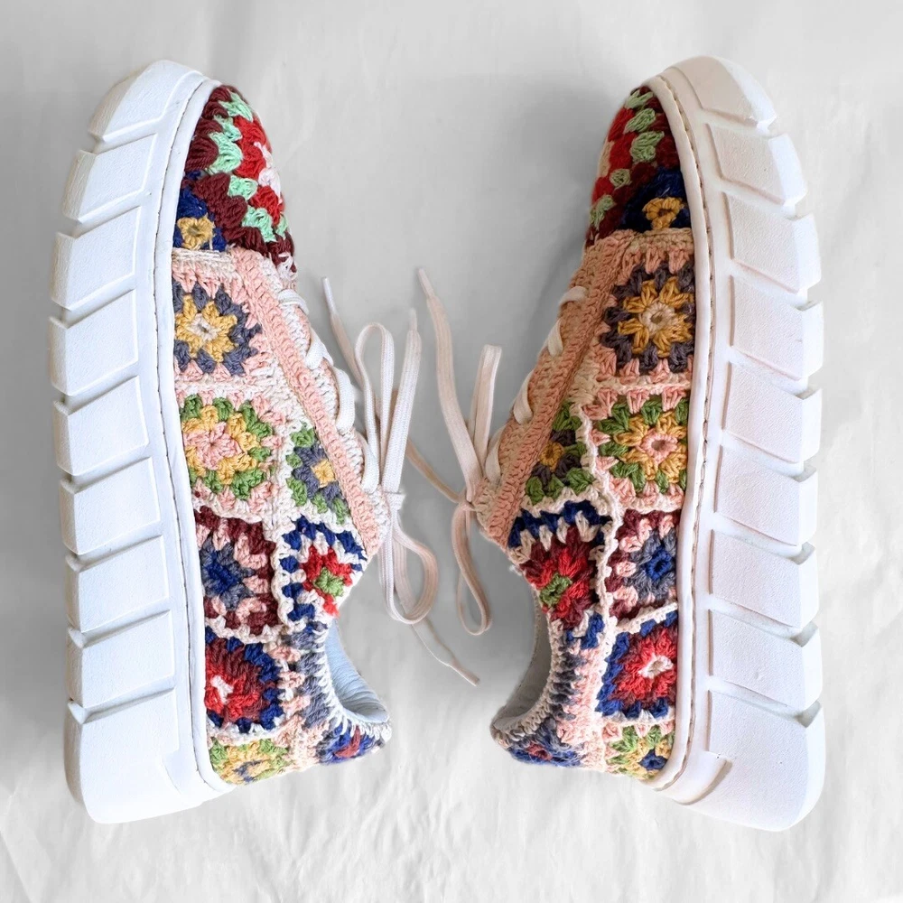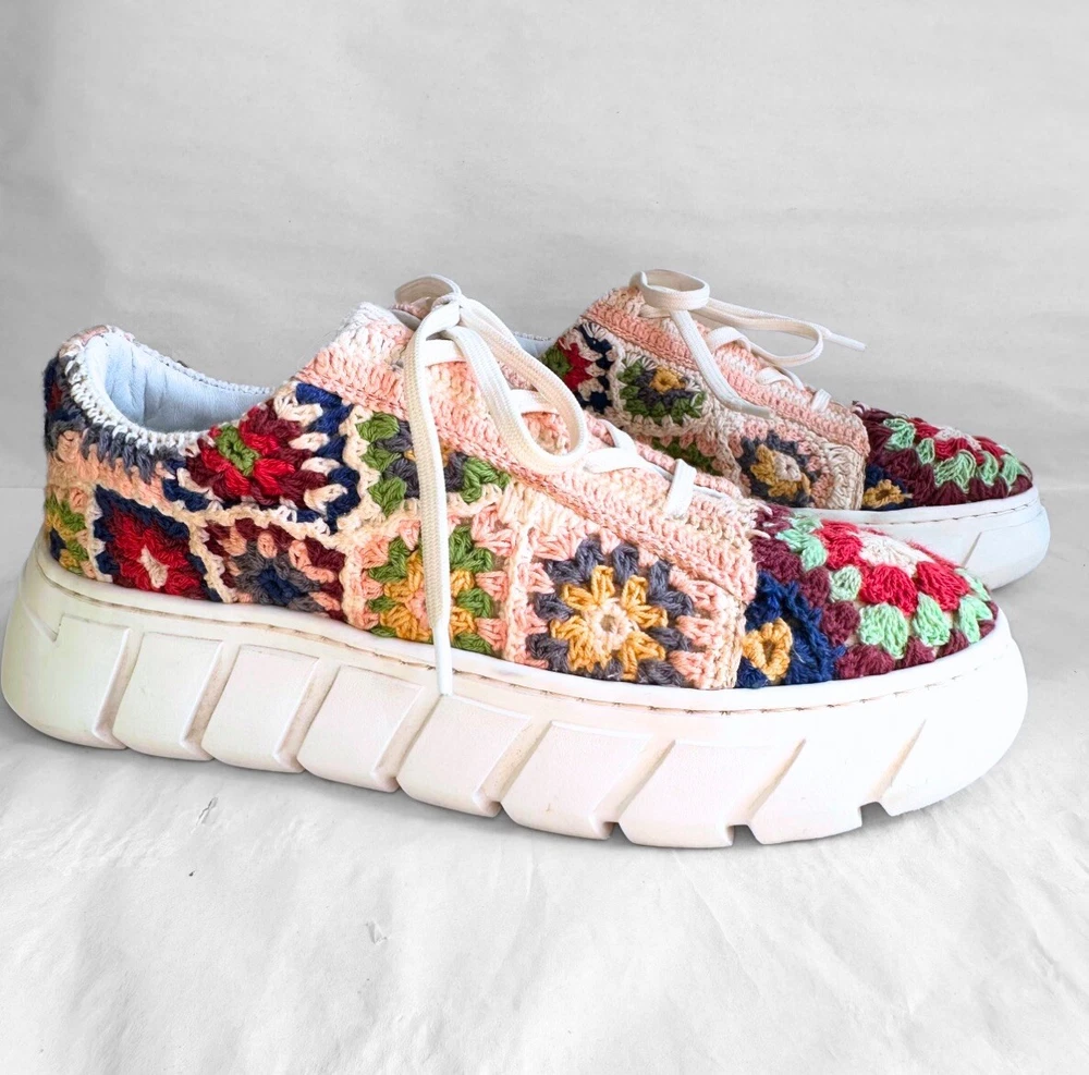 Free People Women size 7.5 Colorful Patchwork Crochet Shoe Catch Me If You Can Sneaker / tennis shoe Hippie Boho EU 38 platform / flats crocheted granny square shoes CONDITION: pattern is a little loser on one toe that the other. tags: fun festival festive happy birthday bohemian grannycore multicolor 1970's Y2K comfortable platform height: 1 3/4" widest part of the sole (ball of the foot): 4 1/4" length of sole from toe to heel: 11 1/4" 📦Packaged with care 📬 I will ship it out within 2 business days 🙂Smoke free home ♥️Offers welcome.