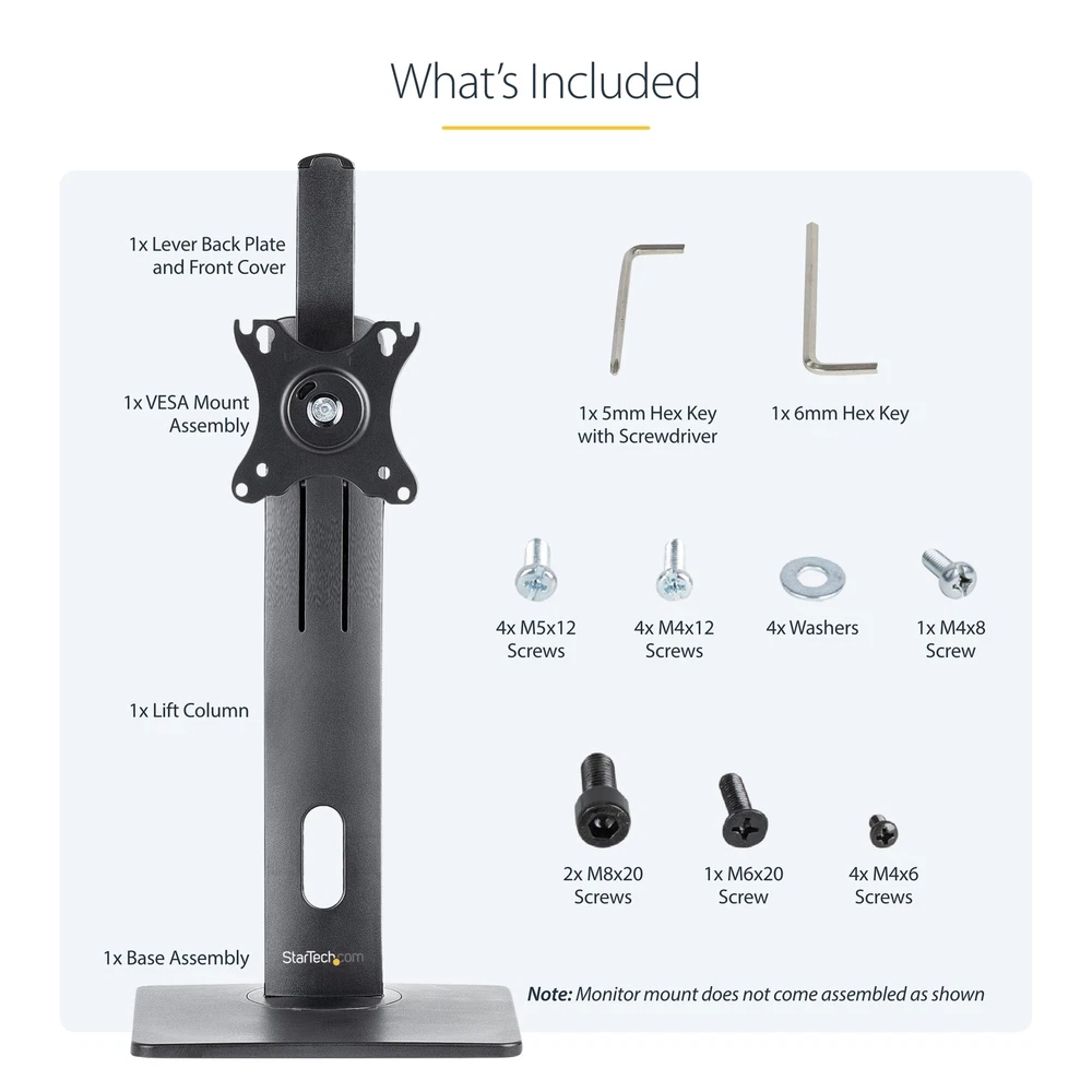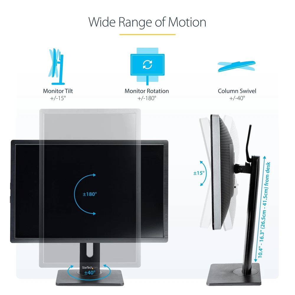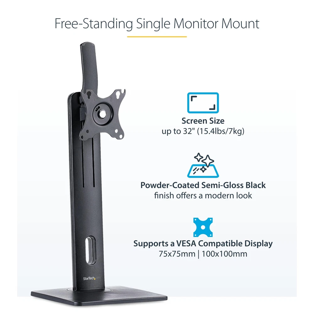 FREE-STANDING SINGLE MONITOR MOUNT SUPPORTS A DISPLAY UP TO 32 INCH (15LB); VESA FREE-STANDING SINGLE MONITOR MOUNT : This monitor stand supports a VESA display up to 32" (15.4lb / 7kg); VESA 75x75/100x100mm; Solid rotating base (+/-40°); coated semi-gloss black finish offers a professional and modern look RANGE OF MOTION: Ergonomic monitor mount increases comfort & productivity with +/-15° tilt, +/-180° screen rotation (portrait/landscape); Entire column swivels +/-40° -TOUCH ADJUSTMENT: Universal monitor stand with height adjustable range of 10.4" to 16.3" (265mm to 415mm) from the desk; The spring-assisted LCD monitor stand offers height adjustments by hand using the easy-access lever at the top of the stand STABLE & NON-SLIP: Freestanding computer monitor mount w/ sturdy anti-slip base (7.8"x9.4" / 200mm x 240mm) and small footprint for maximum stability & flexible placement; Also ideal for glass top desks or surfaces where monitor mounts cannot be installed EASY INSTALL: Keyhole pattern allows you to easily hook and mount your desktop/PC monitor for a faster install; Built-in cable management slot in the lower portion of the column for a tidy workspace; Anti-slip rubber pads prevent scratches on desk surface