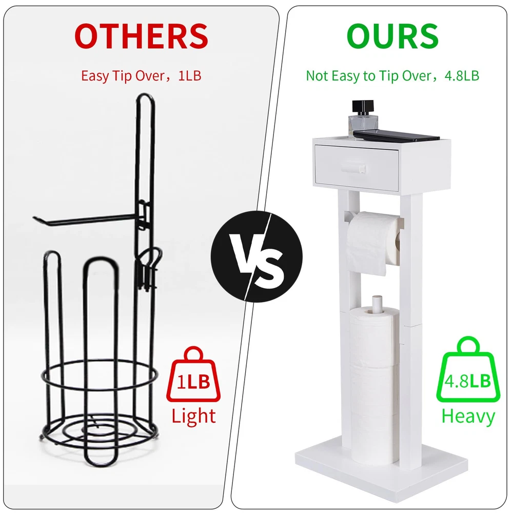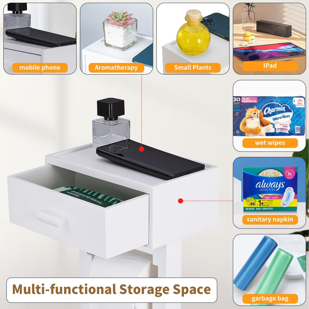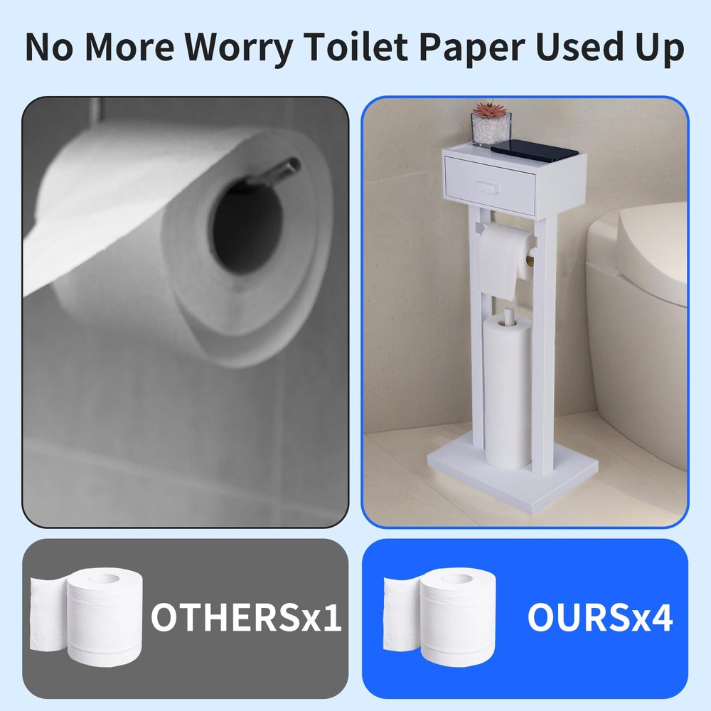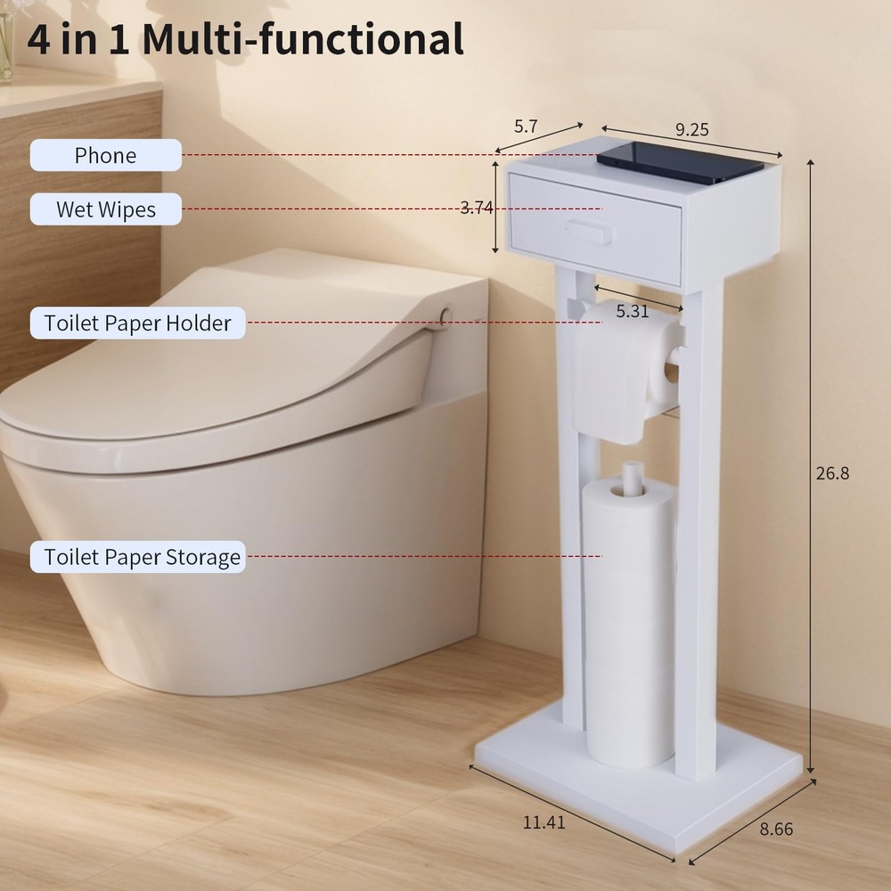 4-IN-1 DESIGN: This wooden freestanding toilet paper holder comes with a storage drawer at the top for cell phones and wipes. Additional toilet paper storage is also available. You can store 4 rolls of toilet paper at the same time, this toilet paper holder with shelf combines the functions of four products in one, which can meet your various needs in the bathroom. WITH TOILET TISSUE ROLL STORAGE: This free standing toilet paper holder with Storage can store up to 3 rolls of toilet paper, avoiding the embarrassment of running out of toilet paper by accident and eliminating the worry of running out of toilet paper while going to the restroom. and with drawer storage for wipes LARGE CAPACITY AND LARGE USE SPACE: This freestanding toilet paper holder with storage drawer is a departure from traditional designs, our toilet paper holder allows you to place items directly on the shelf while pulling out the drawer to access the wipes. The drawer of this vertical tissue holder is large enough to be used for storing wipes, feminine products, tampons and more. The top of the product can be used as a cell phone holder or to store other bathroom items such as perfume bottles, succulents, watches, etc. The drawer measures 9.25in long x 5.7in wide x 3.74in high and can store most wipes on the market. STRONG AND STABLE: Our toilet paper holder stand features a double post design with a total weight of 4.8 lbs to ensure a sturdy and stable structure. This freestanding toilet paper holder removable wooden pole slots make changing rolls quick and easy while preventing rolls from sliding down one side. ALL SOLID WOOD HIGH QUALITY MATERIAL: This freestanding toilet paper holder with shelf is made of natural solid wood, the surface of the wood will not rust, sturdy and stable, simple and practical, fashionable and minimalist design can be adapted to a variety of home decorating styles. Add a warm and harmonious atmosphere to your bathroom.
