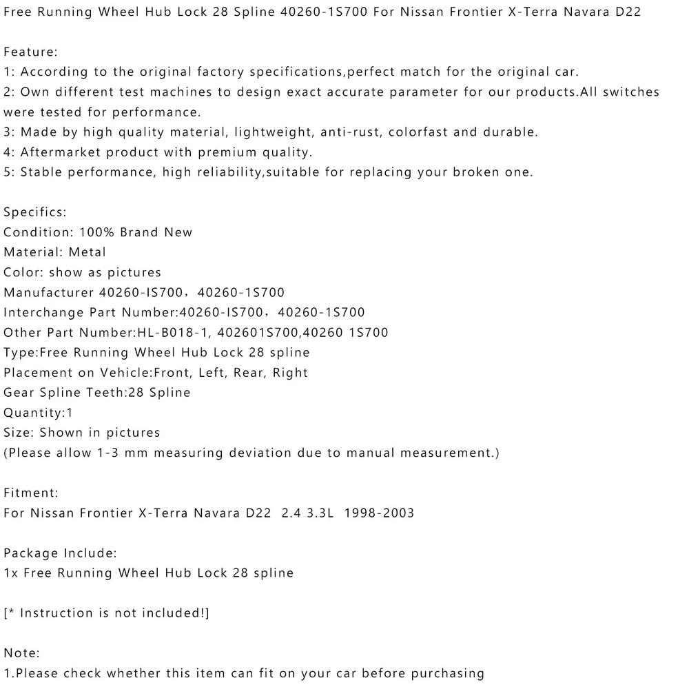 A Fantastic Shop Send us a message Our Store Seller Profile Feedbacks Save this seller Contact Free Wheel Hub Lock 28 Spline 40260-1S700 For Nissan Frontier X-Terra Navara D22 Free Running Wheel Hub Lock 28 Spline 40260-1S700 For Nissan Frontier X-Terra Navara D22 Feature: 1: According to the original factory specifications,perfect match for the original car. 2: Own different test machines to design exact accurate parameter for our products.All switches were tested for performance. 3: Made by high quality material, lightweight, anti-rust, colorfast and durable. 4: Aftermarket product with premium quality. 5: Stable performance, high reliability,suitable for replacing your broken one. Specifics: Condition: 100% Brand New Material: Metal Color: show as pictures Manufacturer 40260-IS700,40260-1S700 Interchange Part Number:40260-IS700,40260-1S700 Other Part Number:HL-B018-1, 402601S700,40260 1S700 Type:Free Running Wheel Hub Lock 28 spline Placement on Vehicle:Front, Left, Rear, Right Gear Spline Teeth:28 Spline Quantity:1 Size: Shown in pictures (Please allow 1-3 mm measuring deviation due to manual measurement.) Fitment: For Nissan Frontier X-Terra Navara D22 2.4 3.3L 1998-2003 Package Include: 1x Free Running Wheel Hub Lock 28 spline [* Instruction is not included!] Note: 1.Please check whether this item can fit on your car before purchasing About US About Our Items We strive to describe all items accurately and thoroughly, with the utmost care and attention to detail. However, to ensure a mutually satisfactory transaction, we kindly ask for your assistance in thoroughly reviewing the item description and photos, and addressing any questions before placing a bid. Customer Satisfaction We stand behind our commitment with exceptional service, a 100% money-back guarantee, and a dedication to customer satisfaction. I am readily available to address any inquiries or concerns you may have, both before and after your purchase. Our aim is to ensure your shopping experience is enjoyable and that you're delighted with your purchase. Feedback Your feedback is crucial to our business's success. If you're satisfied with your purchase and the service you received, we would greatly appreciate your positive feedback, along with an overall Detailed Selling Rating (DSR) of 5. Please take a moment to leave us positive feedback. Our eBay account is set up to automatically reciprocate positive feedback once yours is received. If you're considering leaving neutral/negative feedback or opening an eBay/PayPal case, we encourage you to reach out to us immediately. We're committed to resolving any issues to the best of our ability. Shipping Parcel will be shipped using Standard shipping method. For security purposes, items will be shipped exclusively to the confirmed address on Paypal. Please ensure your Shipping address is up to date before proceeding with payment. Estimated delivery time within the United States ranges from 3 to 10 business days, depending on your location. Returns We accept returns within 60 days from the date the buyer receives the item. If the item is found to be defective upon receipt, the customer has up to 30 days from the date of receipt to request an exchange for a new item or a refund. For returns due to a change of mind, we accept items in their original selling condition. However, if the package has been opened due to a mistaken order, it does not qualify for our return policy. Please note that the buyer is responsible for covering the cost of return postage. If you encounter any issues, please reach out to us via eBay message, and we'll respond within 24 hours.