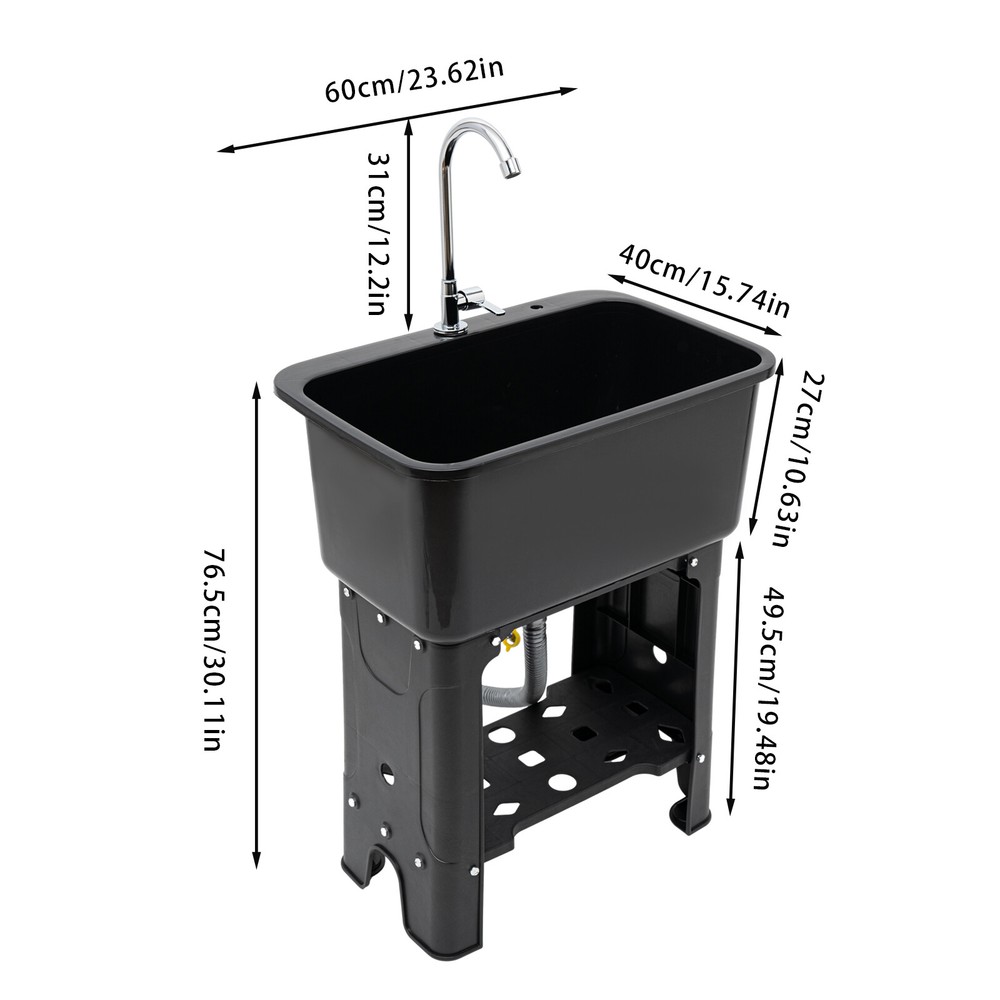 Modern Utility Sink With Faucet Freestanding Utility Sink with Storage Shelf Description With Its 360° Rotating Faucet and Premium Pp Material, This Freestanding Utility Sink Is an Excellent Cleaning Tool. Its Deeper and Larger Sink Reduces Splashing While Simultaneously Making Better Use of Available Space. Meanwhile, It's Easy to Install Thanks to Its Straightforward Design and Full Complement of Attachments. It's Ideal for Laundry Rooms, Baths, and Minimalist Kitchens Because of Its Smart Design and Modern Appearance. Key Features Beautiful Appearance: the Black Color Scheme Gives the Product a High-end and Minimalist Look, Which Can Adapt to a Variety of Different Decorating Styles and Add More Stylishness to Your Room. User-friendly Design: the 30.12" Overall Height(Not Including the Faucet) and 10.24" Depth of the Sink Reduce the Frequency of Bending and the Burden on Your Waist. High Stability: Thickened Material, Four Supporting Lage, Stable Rectangular Structure, Strong Screw Fixation, and Reinforcing Rib Make Its Weight Capacity up to 110.23 Lbs, Making the Product More Stable and Safer to Use. Build to Last: It Is Made of High-quality Pp Material and Adopts an Injection Molding Process, Which Makes the Product Wear-resistant , Corrosion-resistant , Sturdy and Durable, and Not Easy to Rust. Large Cleaning Space: the Large Inner Size of the Sink( 22.05*12.6*10.24in ches) Allows You to Clean Large Amounts of Clothes and Wash Pet Cats and Dogs Inside. Quick Drainage: the Large-diameter Drainage Outlet(1.18inches), Porous Design, and Long Drain Pipe(Max. up to 30.31 Inches) Allow for Faster and Better Water Drainage Without Clogging. Complete Set: This Complete Sink Kit Includes a Sink, a Faucet, a Drain Pipe, a Water Inlet Hose, a Washboard, and a Complete Line of Accessories, so You Don't Have to Buy Them Separately, Making It More Economical and Convenient. Easy to Install: Its Simple Structure, Standard Threaded Connector, and Complete Installation Accessories Allow You to Easily Complete the Installation in a Short Time. Effortless Cleaning: the Smooth Surface Provided by High-quality Materials and Craftsmanship, and Simple Structure Allow You to Easily Clean the Dust with Water and a Soft Towel! Details Washboard: the Washboard with a Soap Slot Has a Tightly Toothed Surface Pattern for Better Stain Removal. Rounded Corner: the Four Corners of the Sink Are Machined to Be Rounded for Better Protection from Collisions. Anti-slip Feet: the Wider Non-slip Feet Increase the Contact Area with the Ground and Effectively Play a Non-slip Role, Thus Providing More Stable Support for the Product. Ample Bottom Space: You Can Put Large Bottles of Laundry Detergent, Small Baskets, Washbasins, and Other Items in the Bottom Space to Make Smart Use of Space. Practical Faucet : This 360° Rotatable High Faucet with a Comfortable Handle Allows You to Easily Adjust the Water Flow, Achieve Dead-end Cleaning , and Provide You with Enough Washing Space and Flexibility. Application It Is Suitable for Cleaning Clothes, Pets, Pots and Pans, Fruits, Vegetables, Meat, Etc. in Restaurants, Laundries, Stores, Utility Rooms, Laboratories, Canteens, Cafes, Gardens, Warehouses, Bars, Dessert Shops, Garages, and Other Commercial Places. Specifications Color: Black Material: Pp Style: Modern Process: Inject Molding Assembly Required: Yes Mounting Type: Freestanding Faucet Opening: Single Hole Faucet Single Hole Diameter: About 2.6cm/1.02in Base Type: Legs Number of Sinks: 1 Load-bearing Capacity: About 50kg/110.23lbs Drain Pipe Diameter: 3cm/1.18in Volume: 48l/12.68gal Faucet Adjustable Angle: 360° Water Inlet Pipe: 60cm/23.62in Drain Pipe Length: 77cm/30.31in Faucet Height: 31cm/12.2in Leg Height: 49.5cm/19.48in Sink Inner Size: 56*32*26cm/22.05*12.6*10.24in Overall Product Size(Not Including Faucet): 60*40*76.5cm/23.62*15.75*30.12in Gross Weight: 6.1kg/13.45lbs Net Weight: 5.5kg/12.13lbs Package Size: 61.5*41*31.5cm/24.21*16.14*12.4in Package Included 1* Utility Sink 1*Faucet 1*Washboard 1*Inlet Pipe 1*Drain Pipe All Accessories for Assembly Notes Please Allow the Slight Color Difference Caused by the Shooting Light and 1-3cm Error Due to Manual Measurement, and Make Sure You Do Not Mind Before You Order. Payment Delivery details Terms of sales About us Contact us Payment We accept ebay payment 。 Fees such as import duties, taxes are not included in the item price or shipping costs. These charges are the buyer's responsibility. Delivery details Shipping: 2-9 working days to: USA Terms of sales We maintain high standards of excellence and strive for hundred percent customer satisfaction. Feedback is very important to us. We hope that you contact us immediately before you give neutral or negative feedback, so that we can address your concerns. It is impossible to address issues if we do not know about them! About us Your satis faction is our ultimate goal. We work hard to earn your trust and future business. Our certified technicians have tested each item before shipping. The unit comes with 1 year limited warranty on all manufacturing defects. a) If you receive a defective item, you may return it or ask for a discount. Please contact us within 14 days after you receive the package. b) What you returned must be intact and in its original packaging as re? u. Customer is responsible for shipping costs of the returned item. c) We will cover the cost of shipping back t with the shipping rate indicated in the registration page. We will send you a new unit or refund the full payment you paid. Thank you. Contact us Business Hour Business Hour: Monday To Friday: 8:30 AM to 5:00 PM (Beijing China time) Due to time zones, our reply to your questions may not be immediately. But within above working time, we will reply your email within 24 hours. If it's non-workdays, please kindly be patient and wait till Monday. Please contact us with ebay message. Please feel free to contact us if you have any questions. Monday To F
