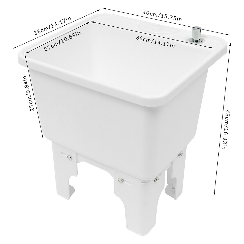 Mop Sink Service Basin Plastic Mop Sink Freestanding Sink 15.7" x 14" x 16.9" Description~~ Description This floor mop sink is made of high-quality PP with a one-piece molding process, making it sturdy and corrosion-resistant . Its enlarged and deepened sink not only reduces splashing, but also increases the space for cleaning the mop. With it, you can enjoy a more convenient life. Come and bring it home! Key Features Long Service Life: It is made of high-quality PP with a one-piece molding process, which is hard, wear-resistant , rust-resistant, sturdy and long-lasting. Enhanced Load-bearing Capacity: It is made of sturdy construction and high-quality material, which can hold about 220.46lbs , you can use it with more confidence. Large Capacity: The adequate internal space of the product (14.17*10.63*9.84 inches) can hold a large amount of water, which makes you more comfortable and efficient when cleaning. It is a good helper for you to mop the floor. Cleaning Assitant: With it, you can easily realize free mopping and have a clean environment without having to go to the toilet to get water for mopping frequently. Thoughtful Design: It has a one-touch drain function that lifting the switch the drain will open accordingly without getting your hands dirty. The large diameter drain allows for quick draining and effectively intercepts debris to prevent clogging of downspouts. Modern and Simple: The simple white color and smooth lines give this product a modern and simple appearance, which fits most household styles. Easy to Carry: The light weight( 5.07lbs ) and compact size( 15.75*14.17*16.93in ) make it easy to carry it outdoors to carry out cleanup work and make your life more convenient. Installation-free : After receiving the product, you can tighten the butterfly screws by hand without tools such as wrenches, which greatly saves time. Effortless Cleaning: The smooth surface and round corners allow you to easily clean it without leaving dead corners of dirt accumulation. Ideal Gift: It is functional and attractive, making it an ideal gift for friends, loved ones and family members who do housework! Details Raised Bottom: It not only facilitates ventilation and prevents prolonged exposure to humidity, but also raises the height of the product for your use. Smooth Edge: The rounded and smooth edges not only add to the aesthetics of the product but also improve the safety of use. Application It is suitable for both commercial and residential use and is ideal for restaurants, RVs, bars, garages, patios, bathrooms, stores and outdoors. Specifications Material: PP Process: One-piece Molding Style: Modern Color: White Mount Type: Freestanding Shape: Rectangular Assembly Required: Yes Drain Type: Pop-Up Product Care Instructions: Wipe with Dry Cloth Load-bearing Capacity: 100kg/220.46lbs Gross Weight: 2.6kg/5.73lbs Net Weight: 2.3kg/5.07lbs Internal Product Size: 36*27*25cm/14.17*10.63*9.84in External Product Size: 40*36*43cm/15.75*14.17*16.93in Package Size: 38*41*31cm/14.96*16.14*12.2in Package Included 1* Floor Mop Sink Notes Please note that this product does not include a mop. Please do not place the product under the hot sun for a long period of time or near sources of fire. Please allow the slight color difference caused by the shooting light and 1-3cm error due to manual measurement, and make sure you do not mind before you order. 1.Features` Easy installation,Compact Design *Festures1 Durable Material,Good quality Type mop sink Brand Unbranded Item Width 14.17in Item Height 16.93in Item Length 15.75in Material PP Style Modern Color White Mount Type Freestanding Shape Rectangular Assembly Required Yes Drain Type Pop-Up Product Care Instructions Wipe with Dry Cloth Load-bearing Capacity 100kg/220.46lbs Internal Product Size 36*27*25cm/14.17*10.63*9.84in