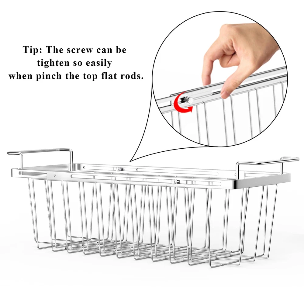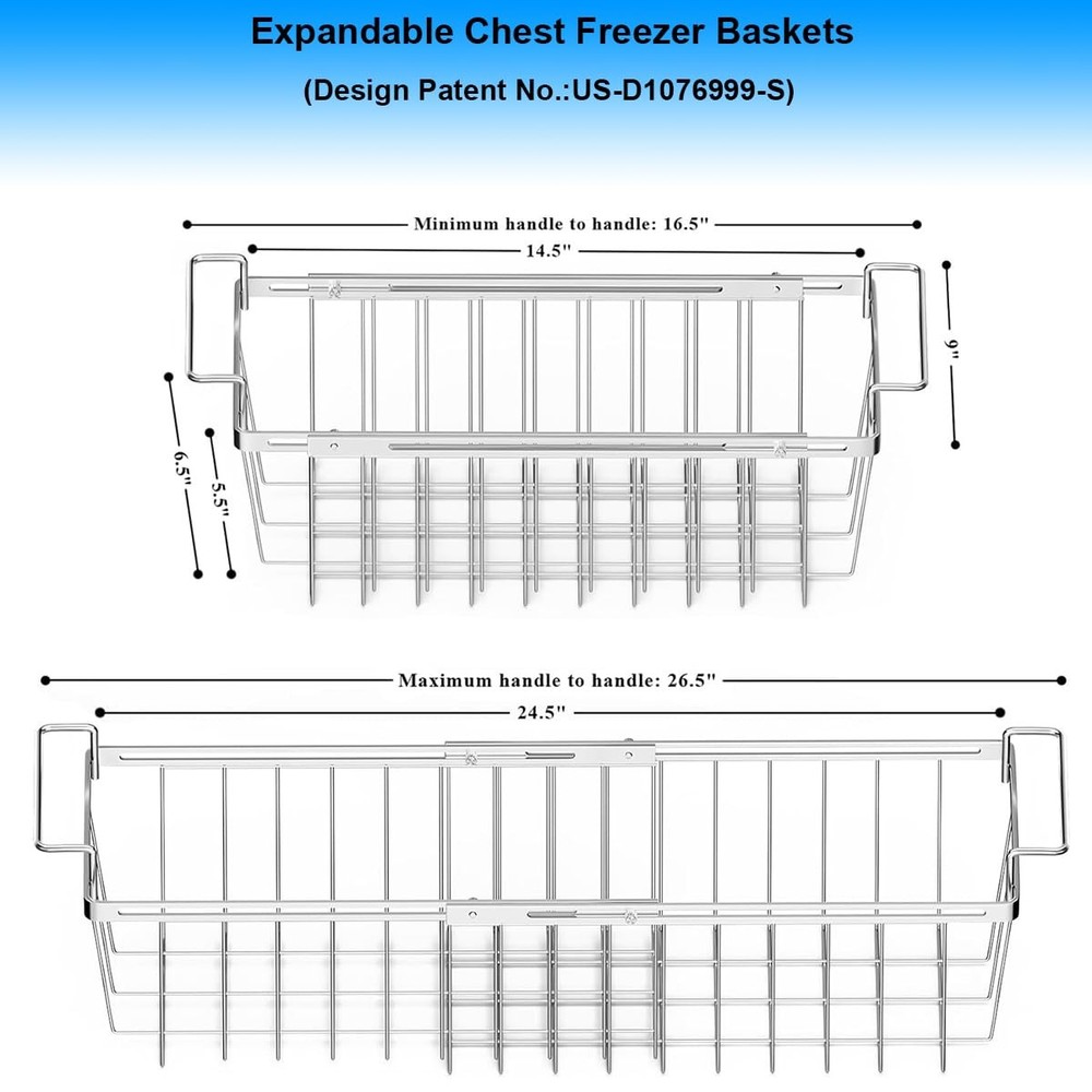 Tip: The screw will be tighten so easily when pinch the top flat rod. Adjustable Chest Freezer Basket The basket design features a telescoping adjustment to rest on the freezer railing and can be easily slide side to side, allowing easy access to lower levels to get the frozen food. Expandable & Lock Design Expandable freezer basket for chest freezer features with lock design to make sure it stays on the freezer rails and won't fall into the freezer. Different to the adjustable handle one, this freezer basket features with fixed handle and adjustable basket bin to maximize the use of freezer internal space. Check Dimensions Before Purchasing Width:9" Total height include of handles:6.5" Height exclusive of handles:5.5" Total length include of handles: Extendable from 16.5" to 26.5" Total length exclusive of handles: Extendable from 14.5" to 24.5" Will It Fit For My Chest Freezer? Please measure the inside width of your chest freezer, the freezer basket will fit if it’s between 14.5-24.5 inch. Used as Over the Sink Dish Drying Rack This expandable chest freezer organizer bin can also be used as over the sink dish drying rack. The expandable handle design allows it fits for most kitchen sinks. But it's better to measure before purchasing. Expandable Chest Freezer Basket - The basket design features a telescoping adjustment to rest on the freezer railing. The adjustable wire basket bin can be locked at any length between 16.5" and 26.5" that you need to fit for your chest freezer and maximize the use of freezer internal space. Measure Before Purchasing - Basket bins width: 9 inch, height: 6.5 inch. Handle to handle length is extendable from 16.5 to 26.5 inch. This expandable freezer basket bin fit for most chest freezers in the market, but not all, pls measure twice before purchasing. Never Fall Down - Expandable freezer basket for chest freezer features with lock design to make sure it stays on the freezer rails and won't fall into the freezer. Hanging freezer baskets can be easily slide side to side, allowing easy access to lower levels to get the frozen food. Always know what’s at the bottom of your freezer. Freezer organizer bin can also be used as over the sink dish drying rack. High Quality - Deep freezer basket bin made of strong stainless steel, sturdy and quality construction. Easy Care - Simply wipe clean with damp cloth. Note: If the screws missed in the package, please feel free to for !