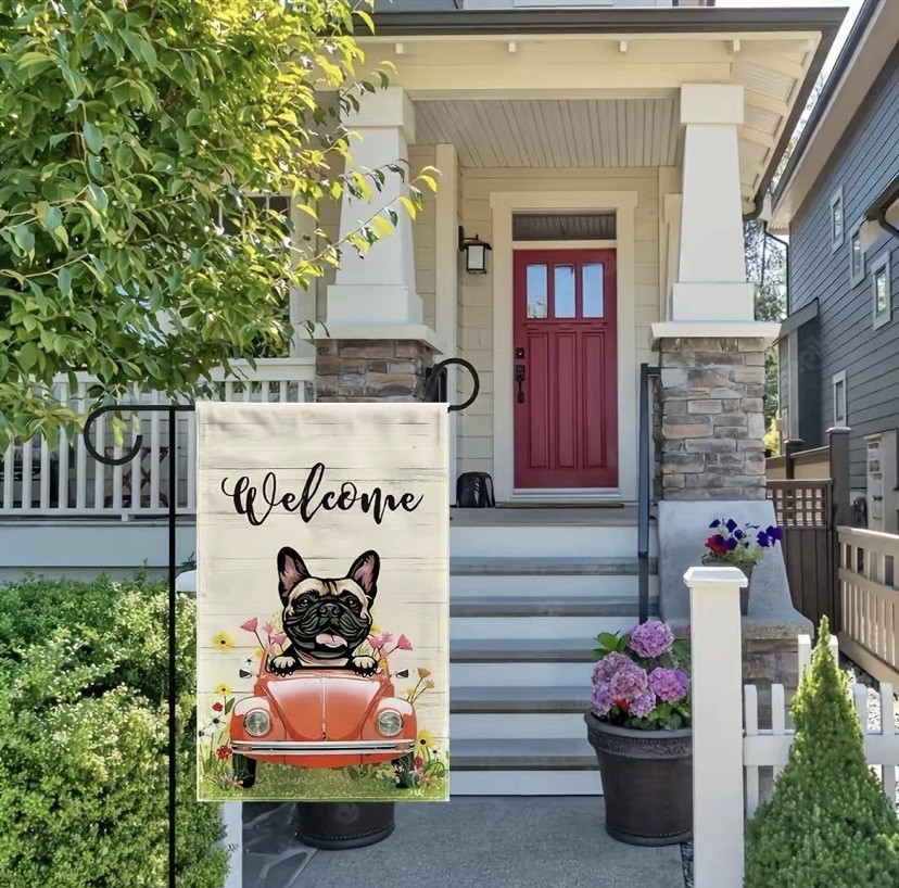 French Bulldog Welcome Garden Flag, 18x12 Inches, All-Weather Safe, Cute Design This French Bulldog Welcome Garden Flag is made of durable canvas material and is all weather safe. It features a cute French Bulldog in a bug car, with the words "Welcome" on the bottom. The flag is 18x12 inches in size and does NOT include a flagpole. It is perfect for adding a cute and colorful touch to your garden or yard. Cute French Bulldog Welcome Garden Flag, Durable Canvas Material. All Weather Safe. French Bulldog in a Bug Car, Welcome. 18x12 Inches, Flagpole is NOT Included. Perfect for your front porch, patio or yard to welcome your friends and family. Made of high quality polyester canvas, which is weather resistant and fade resistant. The vivid colors and detailed design will make your yard or garden more attractive. Double sided design! Weather proof, durable.