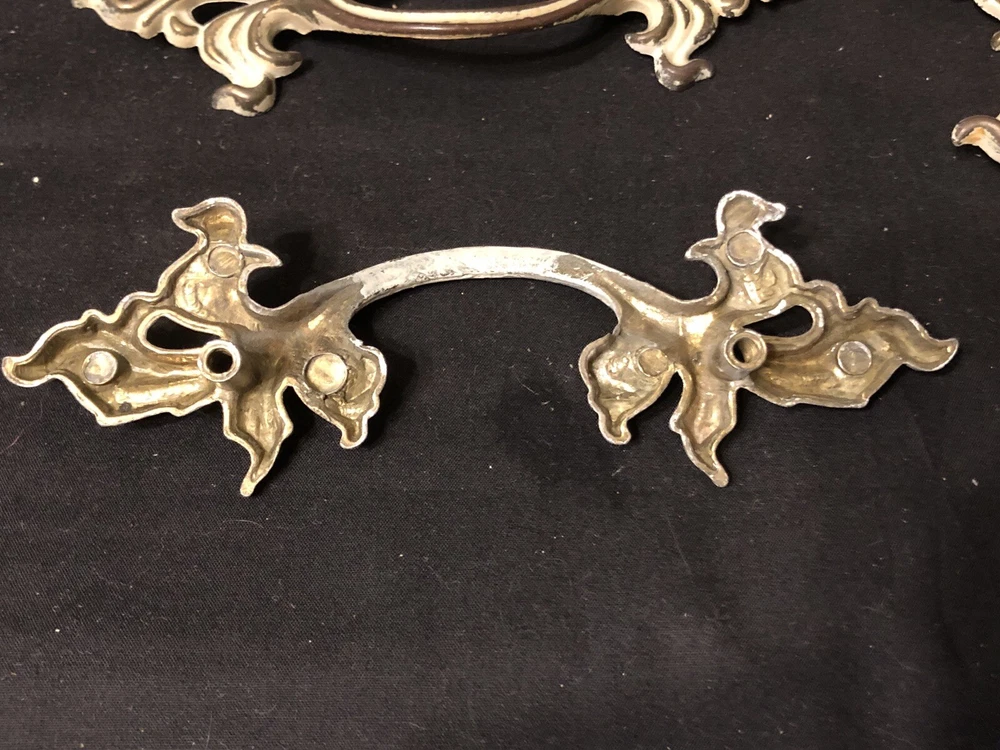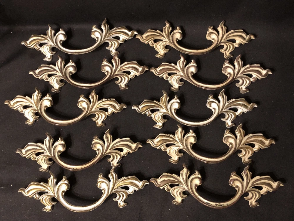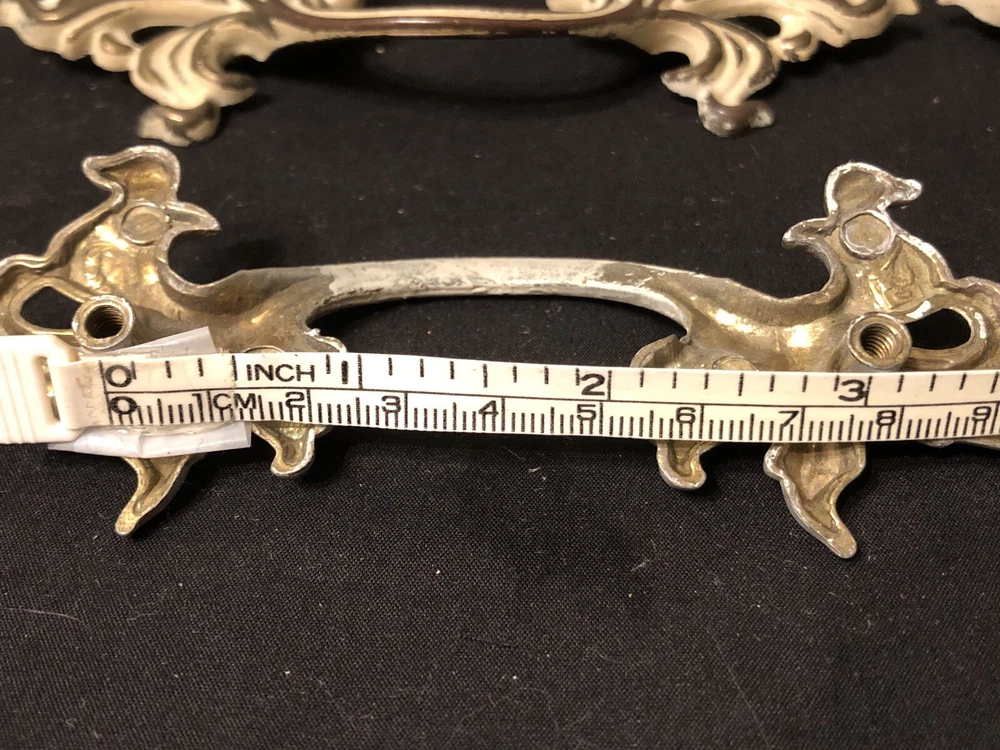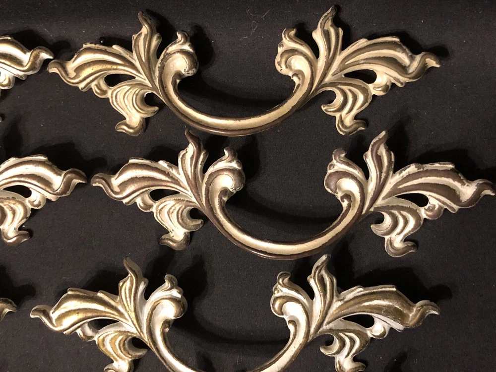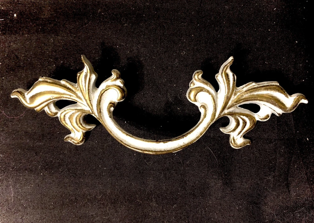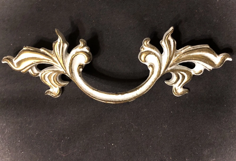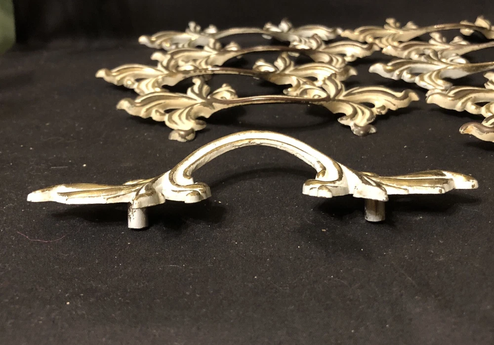 Add a touch of vintage French country style to your drawers and cabinets with these French Provincial handles. These handles are made of durable metal and have a beautiful brushed finish that comes in burnished finish with white paint. The center-to-center measurement of these handles is 3 inches and they are 6 inches in length. I have 10 individual handles. Buy as many as you need . The price is per handle. French Provincial style Marked with a “B” in a shield, SP1751A 6” L x 2” W No fasteners or screws provided. Please feel free to ask any questions before purchasing, thanks