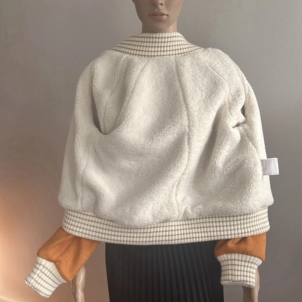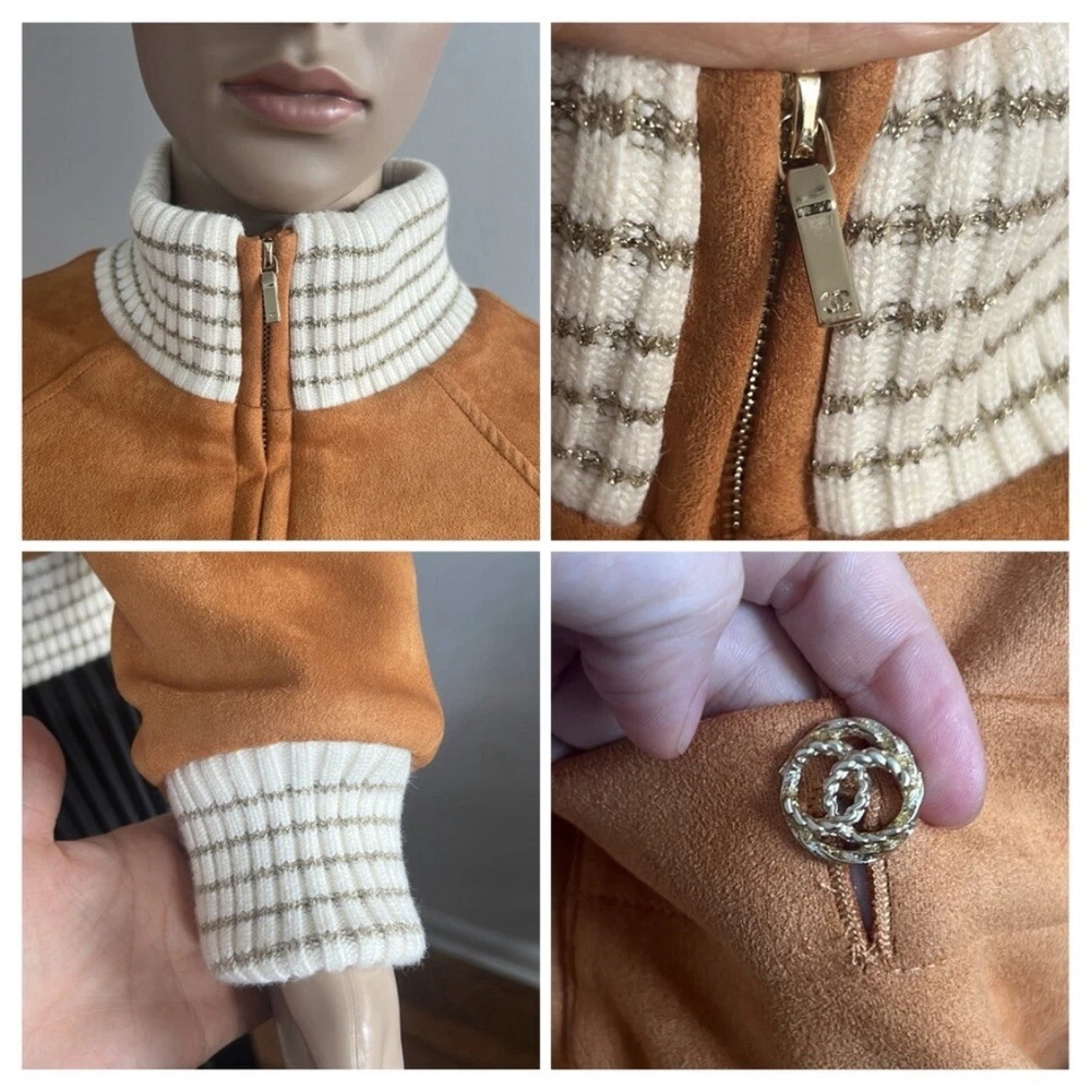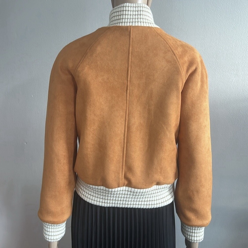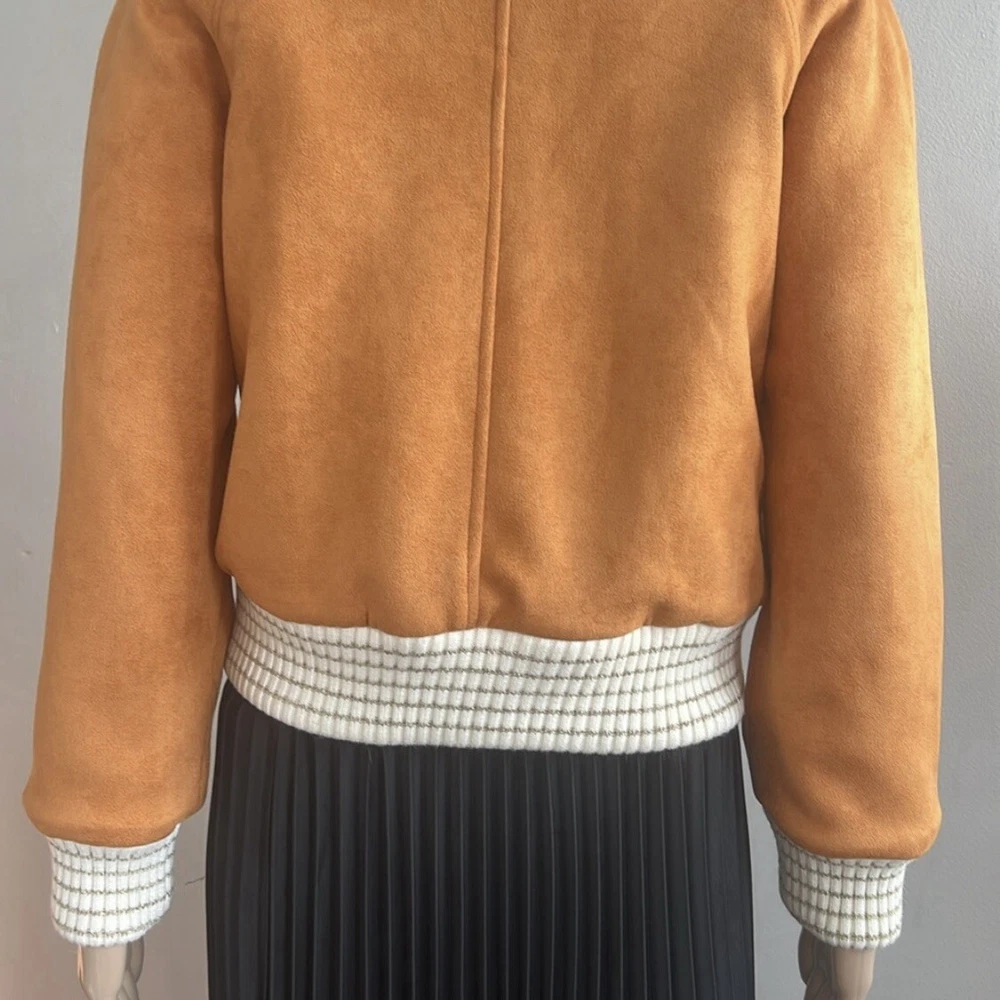 Shearling Suede Lambskin Camel Bomber Jacket Perfect condition! Size 36 USA Size 4 Approx measurements garment laying flat Pit to pit 19.5” Shoulder to hem 21” Sleeve measured from the pit 16.5” Main tag (that shows brand name) is missing. 70% lambswool 30% polyester Lining-100% polyester Made in France Color-Camel Front Full Zip closure Suede Pockets Faux fur lining Ribbed edges •No Returns No Holds No Trades