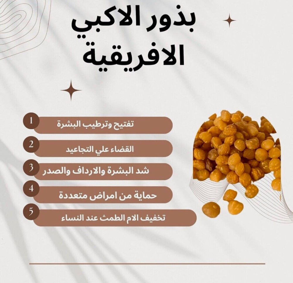 African Fresh Akpi Seeds - Natural Feminine Health & Curves | Djansang 20g Product Description (English): Discover the Power of African Akpi Seeds (Djansang) Experience the numerous benefits of Fresh African Akpi Seeds , also known as Djansang , in this convenient ---gram pack. These premium-quality seeds are renowned for their natural ability to support feminine health , promote skin care , and enhance culinary flavors . Trusted in African traditions for their versatility, Akpi seeds are a must-have for wellness and natural beauty enthusiasts. Key Benefits of Akpi Seeds: Feminine Health & Curves: Supports hormonal balance and helps naturally enhance curves, particularly in the hips, buttocks, and chest. Skin & Hair Care: Packed with antioxidants that promote glowing skin and strengthen hair. Culinary Value: Adds rich flavor to soups, stews, and sauces as a thickening agent and seasoning. Nutritional Boost: Rich in essential vitamins and minerals for overall wellness. How to Use: For Feminine Curves: Grind Akpi seeds into powder and mix with Vitamin E oil or shea butter. Apply to desired areas, massaging gently for better absorption. For Skin Care: Combine powdered Akpi seeds with honey or yogurt to create a nourishing face mask. For Culinary Uses: Crush the seeds and add them to soups, stews, or sauces to enhance flavor and texture. Package Size: - Perfect for personal use, whether for wellness routines or culinary creations. Storage Instructions: Store in a cool, dry place away from direct sunlight to preserve freshness and potency. Why Choose Our Akpi Seeds? Our Fresh African Akpi Seeds (Djansang) are sourced from trusted suppliers to ensure top quality and maximum effectiveness. Whether you're looking to support your health, enhance your natural beauty, or elevate your cooking, these seeds offer a versatile solution. African Akpi Seeds Fresh Djansang Seeds Natural Curves Enhancer Hormonal Balance Remedy Skin & Hair Care with Akpi African Culinary Superfood Akpi Seeds for Wellness Arabic Description: اكتشف فوائد بذور الأكبي الأفريقية ( ديجانسانج ) استمتع بفوائد بذور الأكبي الطازجة ، المعروفة أيضًا باسم ديجانسانج ، مع عبوة مريحة . تشتهر هذه البذور عالية الجودة بقدرتها الطبيعية على دعم صحة المرأة ، تعزيز جمال البشرة ، وتحسين نكهات الطهي . الفوائد الرئيسية لبذور الأكبي : صحة المرأة وتعزيز المنحنيات : تدعم توازن الهرمونات وتساعد بشكل طبيعي على تحسين شكل الأرداف والصدر . العناية بالبشرة والشعر : غنية بمضادات الأكسدة التي تعزز بشرة متألقة وشعر قوي . القيمة الغذائية : تضيف نكهة غنية للشوربات واليخنات والصلصات كمثخن ومنكه طبيعي . تعزيز الصحة العامة : غنية بالفيتامينات والمعادن الأساسية . طريقة الاستخدام : لتعزيز المنحنيات : اطحني البذور إلى مسحوق وامزجيها مع زيت فيتامين E أو زبدة الشيا . ضعيها على المناطق المرغوبة مع التدليك بلطف . للعناية بالبشرة : امزجي مسحوق بذور الأكبي مع العسل أو الزبادي للحصول على قناع وجه مغذي . لأغراض الطهي : اطحني البذور وأضيفيها للشوربات واليخنات لتحسين النكهة والقوام . حجم العبوة : مثالي للاستخدام الشخصي، سواء للعناية بالصحة أو الجمال أو لتحضير الأطباق . تعليمات التخزين : يُحفظ في مكان بارد وجاف بعيدًا عن أشعة الشمس المباشرة للحفاظ على النضارة والفعالية . لماذا تختار بذور الأكبي الخاصة بنا؟ تم اختيار بذور الأكبي الطازجة ( ديجانسانج ) بعناية لضمان الجودة الممتازة والفعالية القصوى . سواء كنت تبحثين عن دعم صحتك، تعزيز جمالك الطبيعي، أو تحسين أطباقك، تقدم هذه البذور حلاً متعدد الاستخدامات . French Description: Découvrez les Bienfaits des Graines d’Akpi Africaines (Djansang) Profitez des bienfaits des graines d’Akpi fraîches , également connues sous le nom de Djansang , avec ce paquet pratique de --grammes. Ces graines de haute qualité sont reconnues pour leurs capacités naturelles à soutenir la santé féminine , améliorer la peau , et enrichir les saveurs culinaires. Avantages Clés des Graines d’Akpi : Santé Féminine et Courbes : Favorise l’équilibre hormonal et aide à améliorer les courbes naturelles des hanches, fesses, et poitrine. Soin de la Peau et des Cheveux : Riche en antioxydants, elle favorise une peau éclatante et une croissance saine des cheveux. Valeur Culinaire : Ajoute une saveur riche aux soupes, ragoûts et sauces en tant qu’épaississant et assaisonnement. Boost Nutritionnel : Riche en vitamines et minéraux essentiels pour le bien-être général. Comment Utiliser : Pour les Courbes Féminines : Réduisez les graines en poudre et mélangez-les avec de l’huile de vitamine E ou du beurre de karité. Appliquez en massant doucement. Pour le Soin de la Peau : Mélangez les graines d’Akpi en poudre avec du miel ou du yaourt pour un masque nourrissant. Pour la Cuisine : Écrasez les graines et ajoutez-les aux soupes, ragoûts ou sauces pour plus de saveur et de texture. Taille du Paquet : Idéal pour un usage personnel, qu’il s’agisse de routines bien-être ou de créations culinaires. Instructions de Conservation : Conservez dans un endroit frais et sec, à l’abri de la 