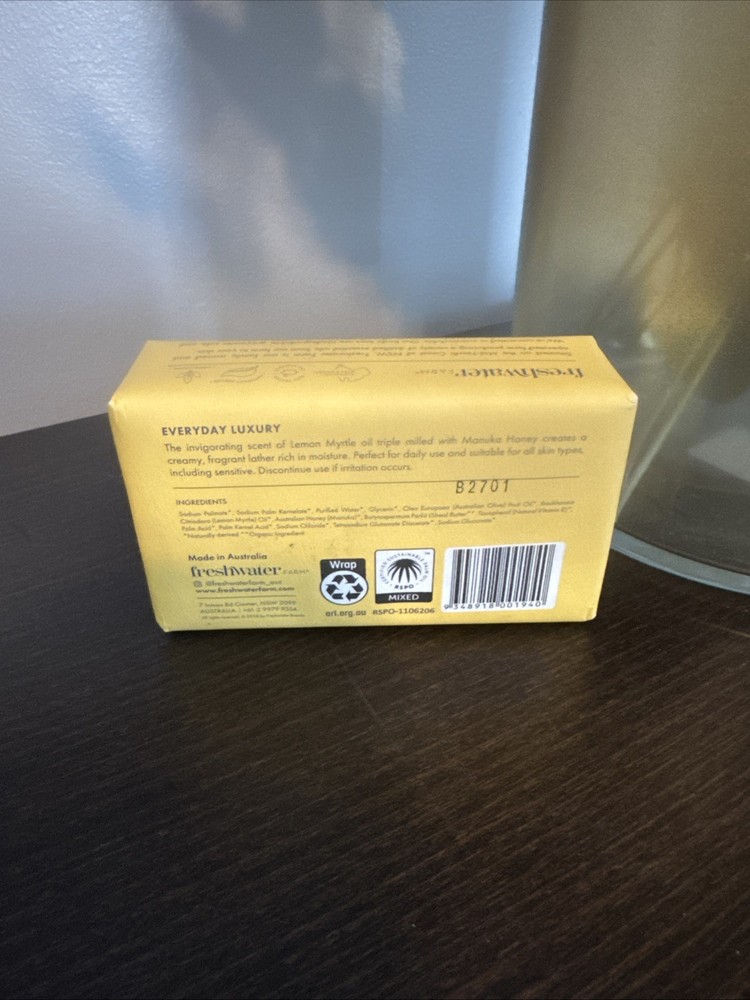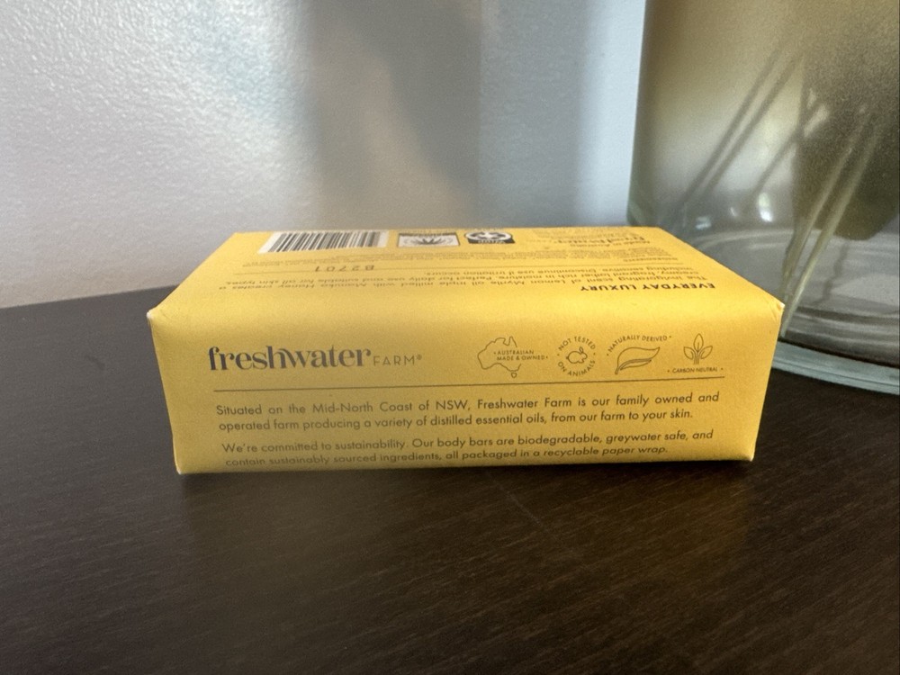 Custom Bundle: No Body Area: Body Scent: Lemon Department: Women Product Line: Freshwater Farm Shape: Rectangular Item Weight: 7 oz Size: Large 7oz MPN: 321 Ingredients: Glycerin, Honey, Olive Oil, Lemon Myrtle Oil, Shea Butter, vitami Type: Castile Soap Personalize: No Country of Origin: Australia Brand: Freshwater Farm, Australia gtin13: 9 348918 001940 UPC: 9 348918 001940 Age Group: Adult, teens Modified Item: No Skin Type: All skin types including sensitive Features: Antiseptic, Hydrating, Moisturizing, Soothing Pattern: No pattern Design: n/a