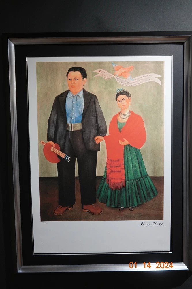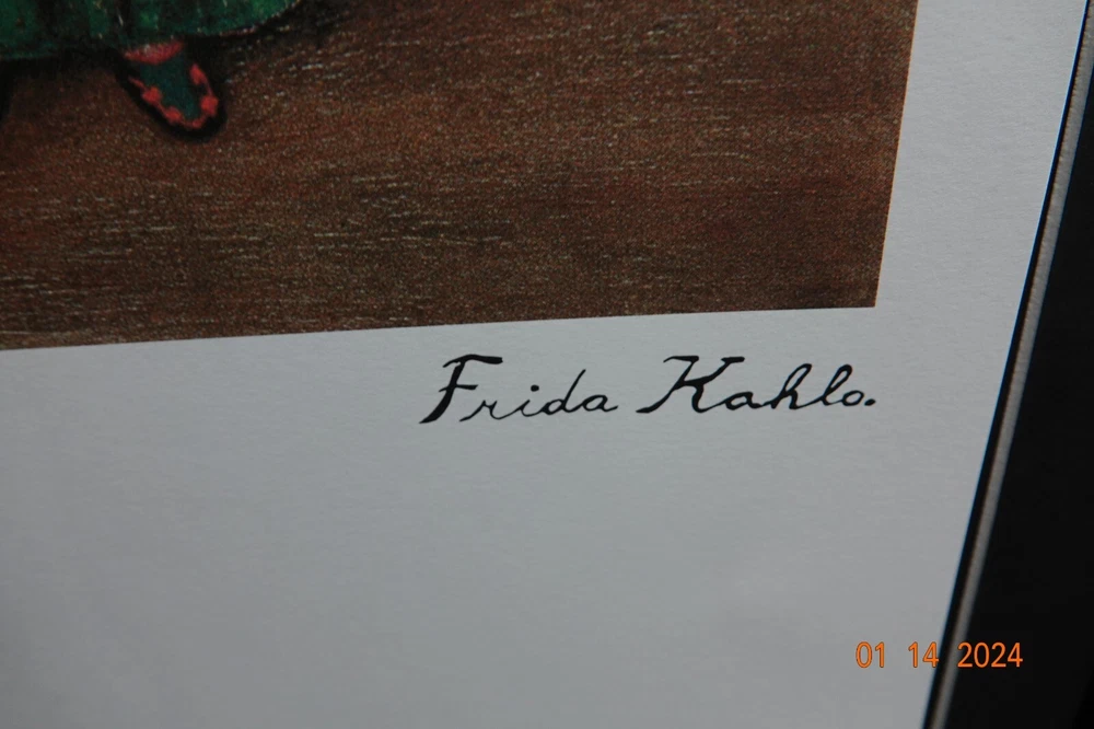 Verkauft wird eine Frida Kahlo Rep. Lithographie, l imitiert auf 250 hier die Nr. 52 Die Lithographie ist mit einem Lizenz Trockenstempel versehen, sowie signiert. Nummeriert wurde von Hand mit Bleistift. ( Die Nummern können variieren, Auflage stimmt). Größe 70 x 50 cm ! Jetzt und hier zum Schnapperpreis dabei sein! Es wird nur die Lithographie verkauft, nicht der abgebildete Rahmen. Natürlich zahlen sie nur einmal die Versandkosten (14,95 Euro - BRD) egal wie groß ihre Bestellung ist ! (Selbstverständlich flach & knicksicher verpackt, wir sind zertifiziert und versenden CO2 Neutral!! -GO GREEN- ) Ab 10 Items kaufen Sie bei uns weltweit Versandkostenfrei! LIFESTYLE FIEBER DAS SOLLTE SIE NICHT KALT LASSEN !! A small discription English: The lithographie is signed,strictly limited, embossing stamp, rare Motiv ! You buy commercially , so you take no Risk ! You pay shipping costs only once, no matter how big your order is. From 10 parts you buy from us worldwide free shipping! Please keep in mind that you are not buying the frame, you are buying the lithograph without the frame. LIFESTYLE FEVER,THAT SHOULDN'T LEAVE YOU COLD!