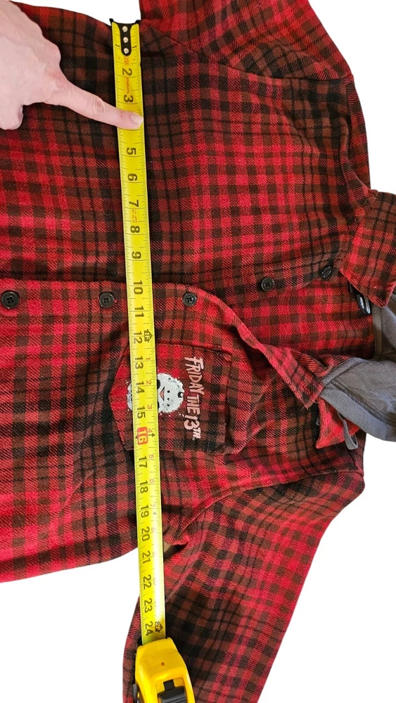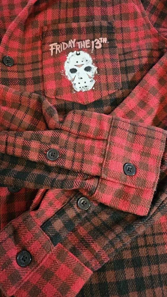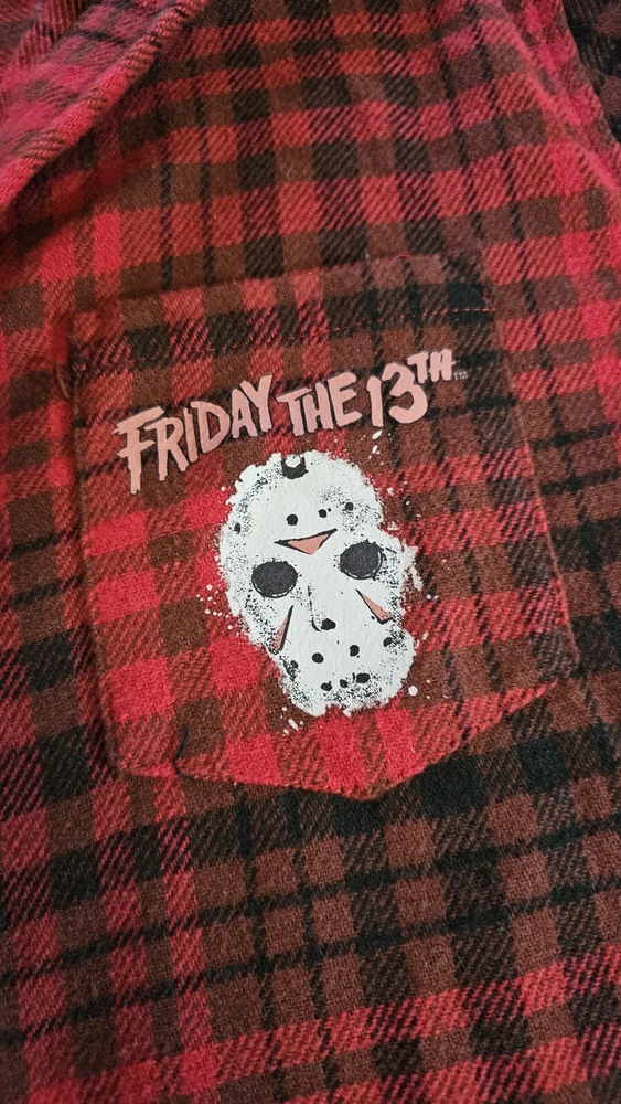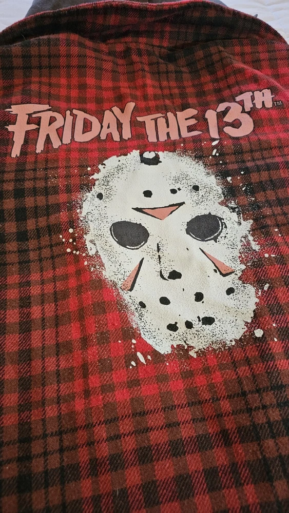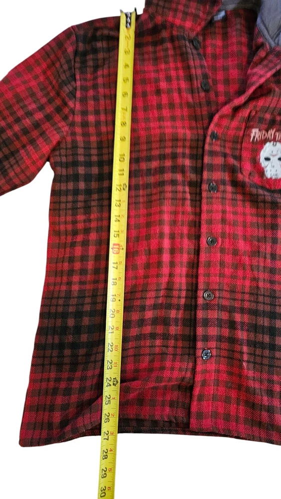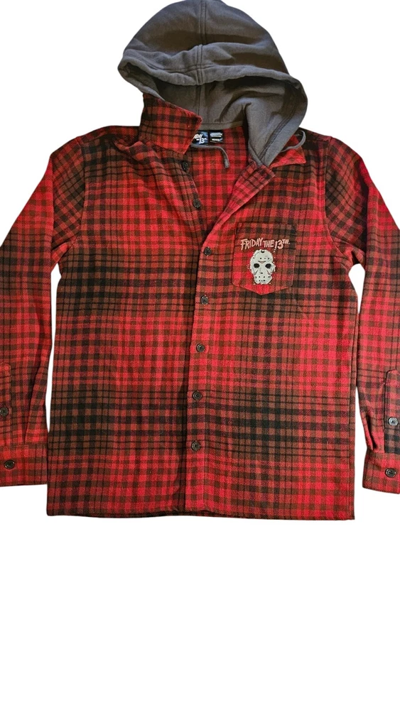 Embrace the chill of horror with the Friday The 13th Jason Hooded Flannel. A must-have for fans of the iconic movie franchise, this medium-sized flannel blends comfort with a touch of terror. The classic design features the notorious Jason Voorhees, making it an ideal addition to any horror aficionado's wardrobe or memorabilia collection. Crafted for both warmth and style, this flannel is a versatile piece that transcends casual outings and becomes a statement at horror movie events. Whether you're lounging at home or out with friends, this garment is sure to spark conversations and admiration for its unique blend of fashion and film.
