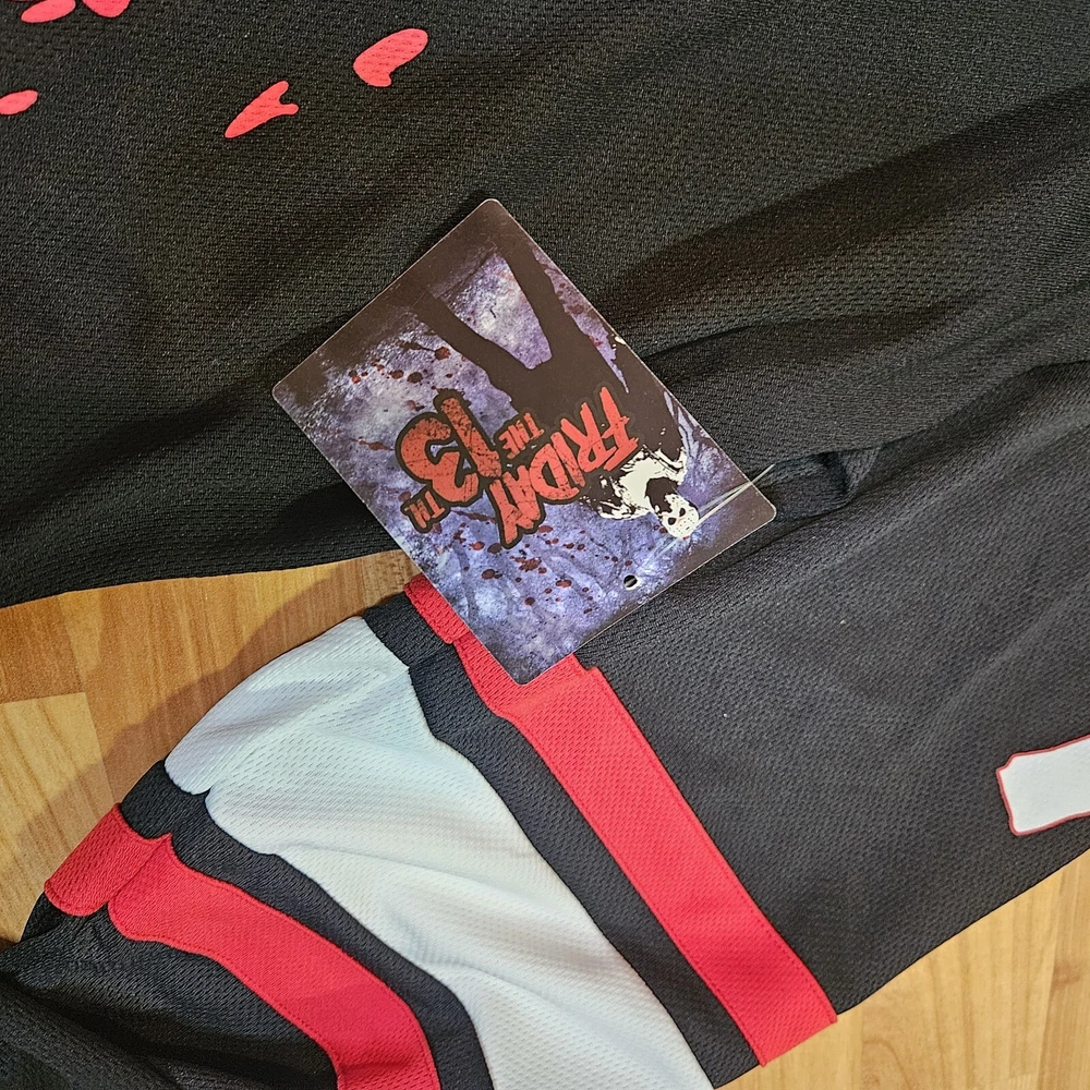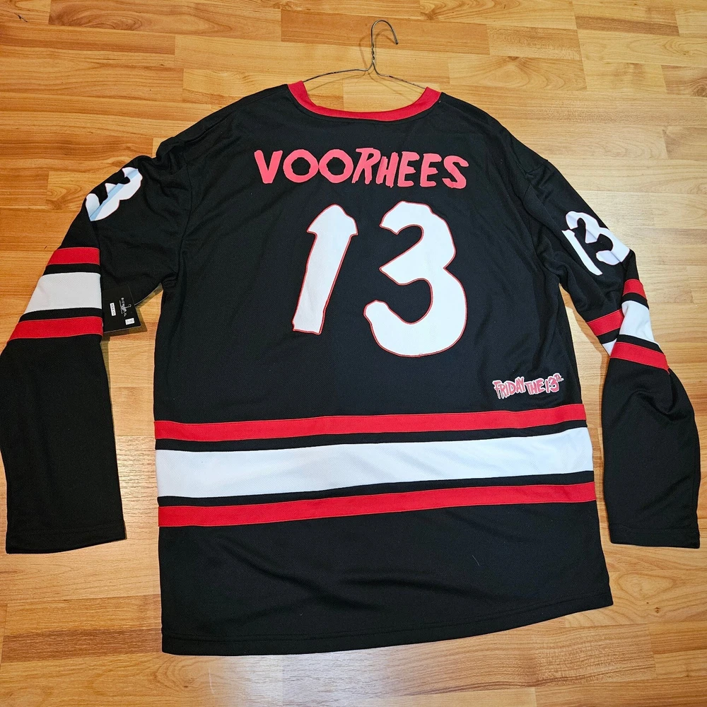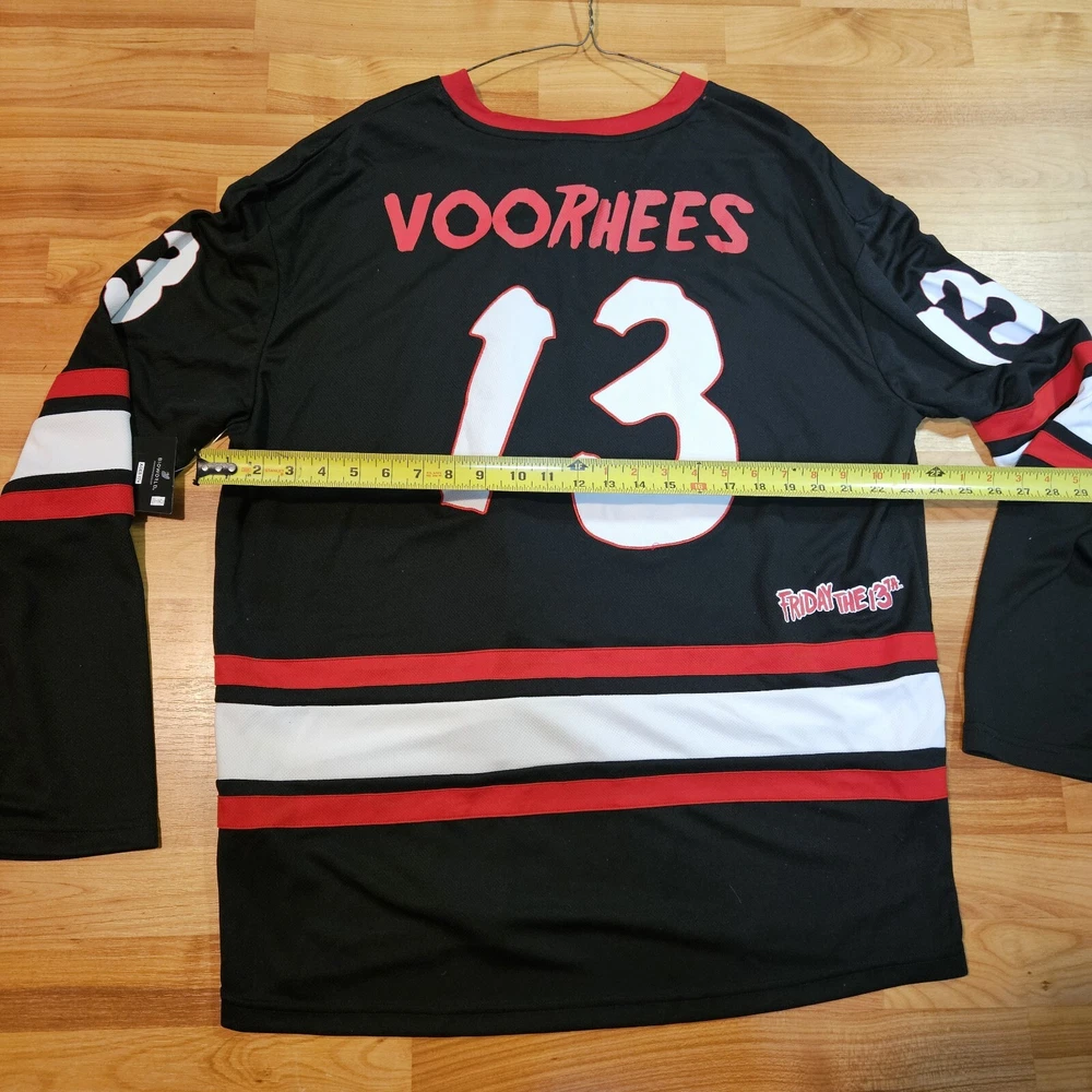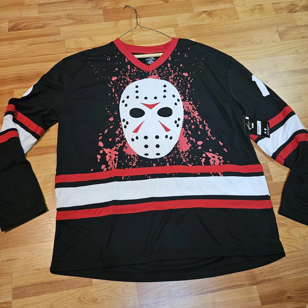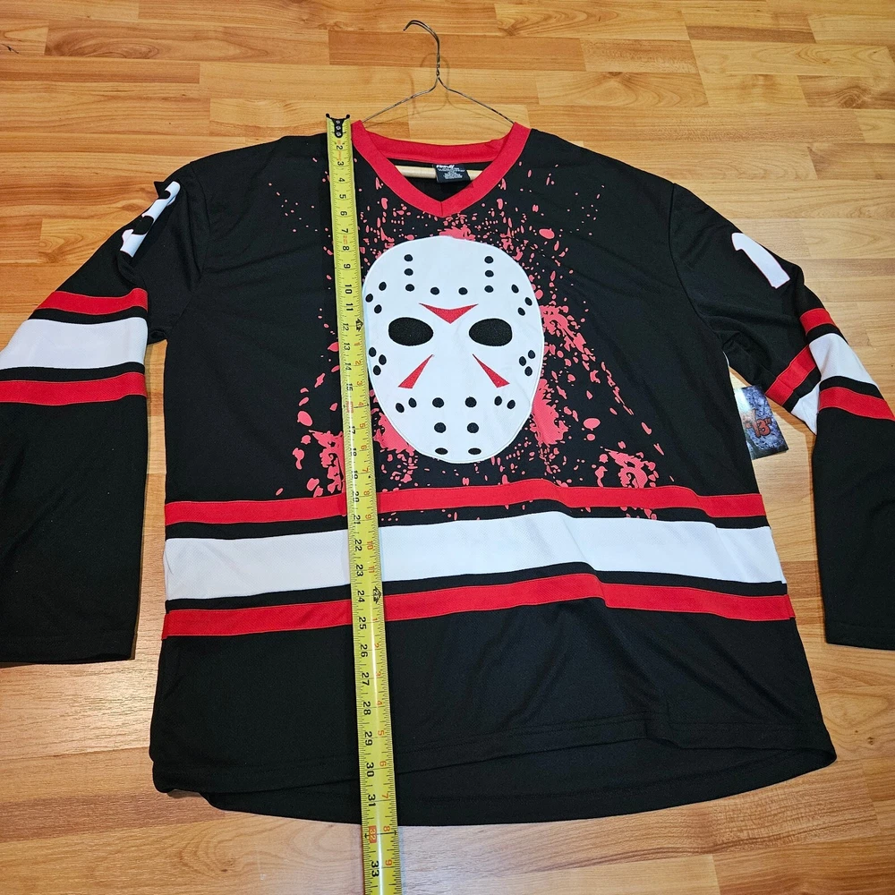 Get ready to hit the ice in style with this Friday the 13th Jason Vorhees hockey jersey. Made from high-quality jersey fabric, this size XL T-shirt is perfect for any fan of the iconic movie series. The jersey features the iconic Jason Voorhees character family, and is designed for men who want to make a statement. Whether you're a collector or just looking for a unique addition to your wardrobe, this T-shirt is sure to turn heads. So why wait? Add this Friday the 13th Jason Vorhees hockey jersey to your collection today and step up your style game!