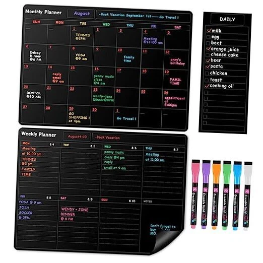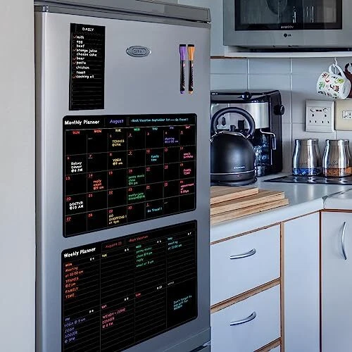 Return Policy Fast Delivery Trusted seller Fridge Black Whiteboard Calendar Set(3-Pack),1 Pcs Magnetic Weekly Board and 1 Pcs Refrigerator Planner Calendar,1 Pcs List and 6 Markers,Reward Chore Chart for Kids Multiple Kids Teens Adults Family Product Description 【Durable - Easy to Use】:Durable and Tear-Resistant Design - Say goodbye to flimsy calendars that easily fall down. 5 weeks design, no worry about missing 1 or 2 days in a month. Perfect dry erase monthly calendar set for busy people to keep in track of every event & dates, or use as to-do list, aid to daily tasks. For busy moms who takes care of household chores for family, helpful for student with school schedule for classroom, also for home school student, good for kids' habit training. 【Generous Writing Space】: We know how much important it is for you to have plenty amount of space for writing notes, reminders.Tfore, our magnetic calendar has a large enough place to record your important things. T are many ways you can use our magnetic whiteboards set: apartment decor, family chores, office meeting or deadline planner, a gym routine organizer, a classroom chore planner, to-Do’s reminder, work notes/sheet, workout tracker, a weekly meal planner or grocery list. 【Exceptional Durability】: Our fridge chalkboard calendar set is made with top-of-the-line materials that ensure long-lasting performance. With its edge-cutting stain-resistant PET surface, you can erase and re-write countless times without worrying about any ghosting or smudging. It's perfect for making quick corrections or changing plans on the fly. 【Ideal Gift Idea】:Make your life easier and more organized with our convenient and durable monthly planner. Our planner makes the perfect gift for anyone who wants to stay organized and on top of their busy schedule. Surprise a friend or loved one with this practical and thoughtful present, and help them achieve their goals in style. 【Black 3 Pcs set and Service】:The entire set includes“2 Pcs Large Magnetic Dry Erase Boards(17x12 in)+ 1 Pcs List(10x4 in)+ 6 Markers with Eraser Caps”. We stand behind our product 100%, and if for any reason you are not satisfied with your purchase, please contact us right away. We promise to resolve your issue within 24 hours, so you can rest easy knowing that we've got your back! Shipping Returns Payment Shipping Shipping is FREE to all addresses other than APO/PO boxes in the lower 48 states. All our stock ships from US-based warehouses. Shipped via USPS or UPS (depending on location and package weight) Unless stated otherwise, all orders will ship within 24-72 hours of your payment being processed. Check our feedback to see the great reviews of FAST shipping we offer. Returns Seller does not accept returns Payment We currently accept payment via eBay managed payments only. Once payment is cleared, we will dispatch your shipment within 1-3 business days. Please refer to the "Shipping" tab for more information regarding shipping speed to your destination.