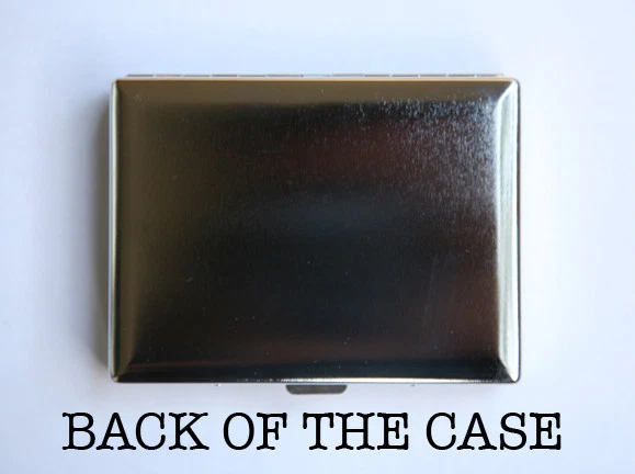Case hold about 18 smokes. Or you can hold Ids, business cards or other things. The case is metal with two hinged side. This case opens through a side push button. The size of the case is 4 1/4" tall by 3 1/4" inches wide closed by 1/2" deep. Image is protected by clear epoxy.