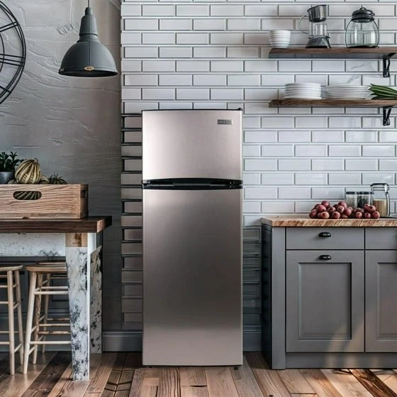 Installation: Not Specified Defrost Method: Frost-Free/Automatic Defrost Number of Shelves: 4 Ice Maker Location: Above Refrigerator Features: Spill Proof Shelves, Reversible Door, Adjustable Shelves Country of Origin: United States Number of Freezer Compartments: 1 Brand: Frigidaire Item Height: 55.50 In Finish: Stainless Steel Item Depth: 21.50 in MPN: EFR780-6COM Manufacturer Warranty: 1 Year Cable Length: 6 ft Model: Platinum Series Material: Steel + Aluminum Capacity: 7.5 cu. ft. Type: Top-Freezer Refrigerator Item Width: 21.45 in Energy Star: 5 Stars Bottle Capacity: 6-25 Number of Drawers: 1 Number of Doors: 2 Color: Silver Door Style: Top-Freezer Open Door Width: Less Than 20 in EC Range: A+++ - G