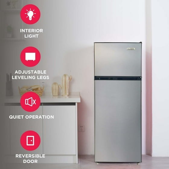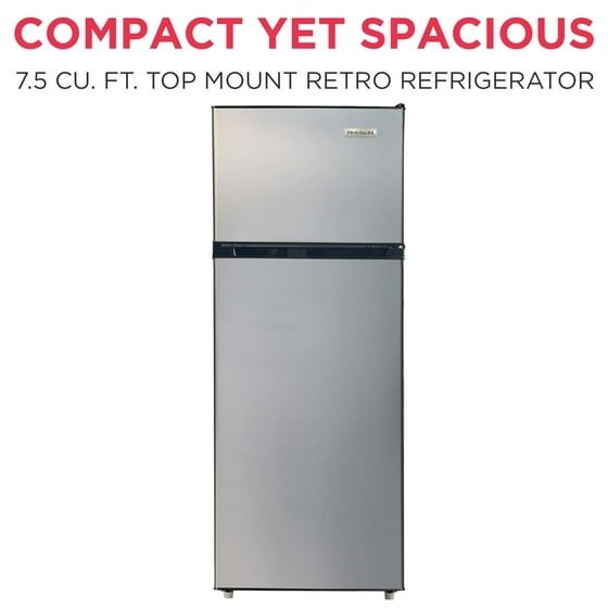 About this item Product details Your Frigidaire 7.5 cu. ft. Top-Freezer Refrigerator with Platinum design look features upfront temperature controls that make it simple to regulate both the fresh food and freezer sections. Adjustable shelves provide flexibility to meet your food storage needs. Combines easy-to-use features with practical design to complement any kitchen. Maintenance is easy with the convenient cycle defrost system and finding your favorite beverages is a breeze due to the tall bottle storage in the door. There are three adjustable glass refrigerator shelves and one adjustable/removable wire freezer shelf to provide maximum and versatile storage space. Your vegetables will stay cool and easy to find in the glass cover crisper. Left or right-handed opening is your choice with the reversible door hinge and this sturdy refrigerator can be installed against a wall with its smooth back design. 7.5 cu. ft. of standard storage capacity lets you stock up on all of your favorite foods Easily accessible temperature controls make temperature management easy New Spill-proof glass shelves contain spills and simplify cleanup, preventing liquids from leaking on to shelves below Sleek platinum design adds a touch of elegance to any space Transparent crisper for easy visibility and organization of fresh produce Interior light illuminates the contents for convenient access, even in low light Reversible door allows for flexible placement and convenient access options Dedicated freezer compartment for frozen food storage Adjustable and removable glass shelves for customizable storage options Full-width door bin for convenient storage of bottles and larger items More details Volts 115 V Brand Frigidaire Model EFR780-6COM Refrigerator Feature Freezer, Reversible Door Hinges Assembled Product Weight 83 lb Manufacturer Part Number EFR780-6COM Manufacturer CURTIS INTERNATIONAL LTD. Number of Shelves 4 Shelf Material Glass Number of Drawers 1 Number of Bins 5 Installation Type Freestanding Assembled Product Dimensions (L x W x H) 21.50 x 21.45 x 55.50 Inches