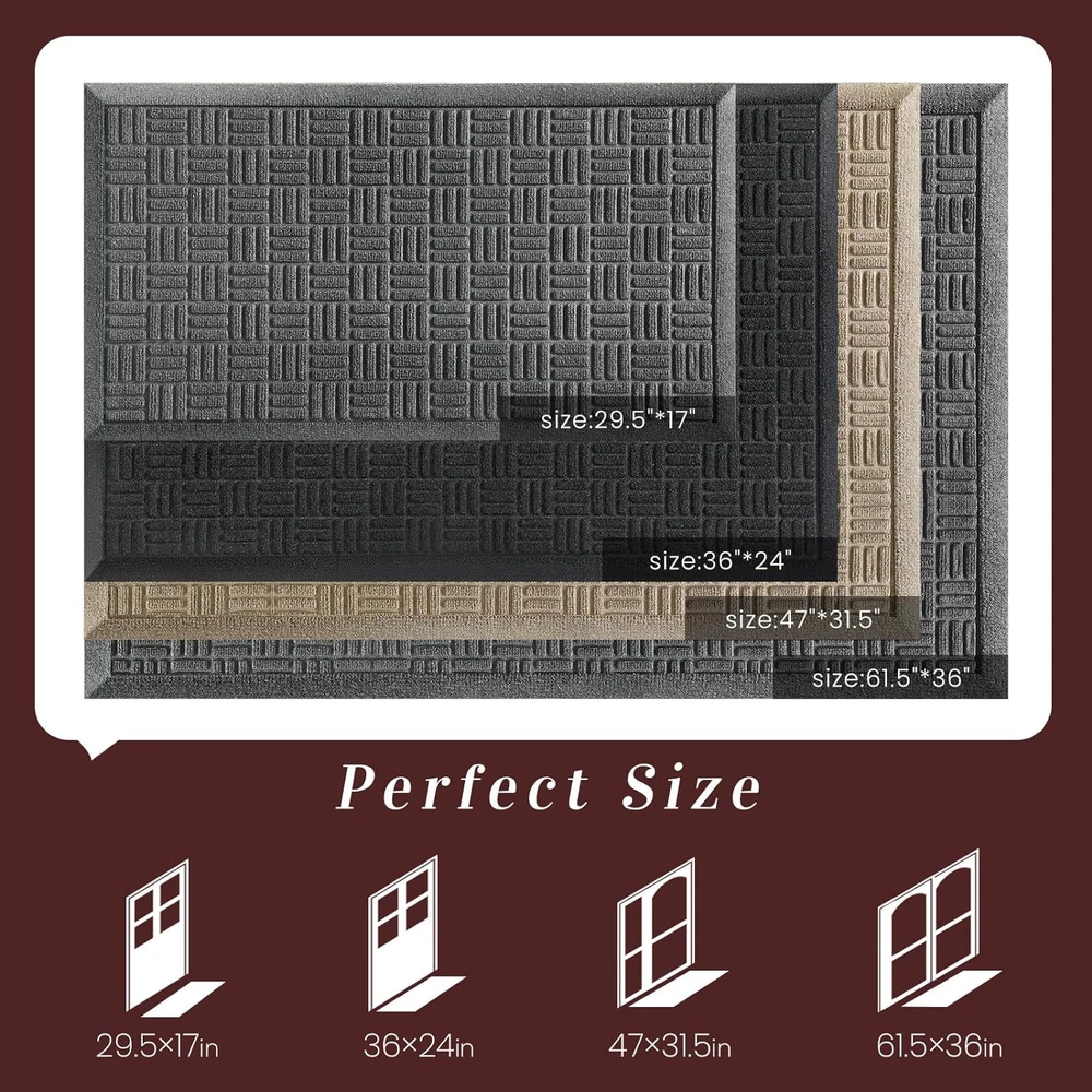 DIRT TRAPPER & DURABLE: Mibao doormat is made of high-quality absorbent polypropylene fabric, uses double layer technology which absorb moisture and dirt from shoes quickly, makes your floors clean and dry. The pattern is durable and hard to scatter. It can be used for several years. NON SLIP RUBBER BACKING: Mibao outdoor mats' natural rubber backing provides higher tensile strength and tear resistance, and less odor than synthetic rubber. Also make it anti slip on dry smooth floor, helps keep mat firmly in place, that it won't slip or slide, more safe and cozy. EASY TO CLEAN: The floor mat is designed for easy to clean. You just use vacuum to clean it or shake it off. For deep clean,you can rinse it with garden hose and let it dry. On the other hand, Mibao welcome mats' color are resistant to dirt. VERSATILE USE: Our doormats are used for all weather, from hot summer to cold winter, works as front door mat, outdoor door mat, welcome door mats, garage rugs and mats, indoor mats for entryway, shoe mat, dog doormat, floor mats, ect. It can scrap off mud, slush, grass or retain snow. IDEAL SIZE: 29.5" x 17", 36" x 24", 24"x48", 47" x 32", 61.5" x 36", 1/4 inch thick , low profile design so doors won't get stuck. Heavy duty extra large door mat entrance rug carpet widely used for outdoor indoor, exterior patio entry way, garage, garden, shopmall with high traffic inside and outside. Product Description 1 OUTDOOR 2 ENTRANCE 3 PATIO 4 STAIRS