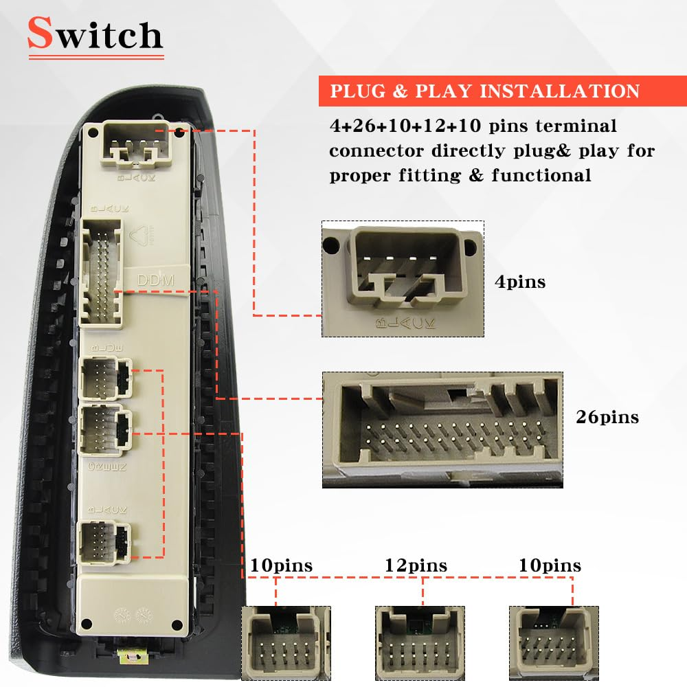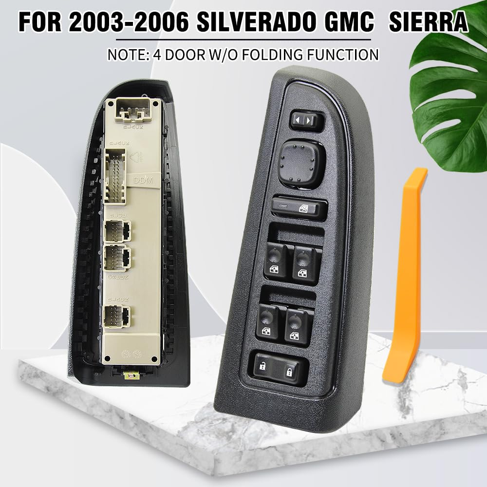 Excellent Value: This drive module is built to original factory specifications, and our drive switches are constructed of ABS and polycarbonate materials for long life and excellent performance Vehicle Compatibility 1: The 15883323 Front Driver Door Window Control Switch with Bezel Assembly is compatible with 2003-2006 Chevrolet Avalanche 1500, 2003-2006 Chevrolet Avalanche 2500, 2003-2006 Chevrolet Silverado 1500, 2007 Chevrolet Silverado 1500 Classic, 2003-2006 Chevrolet Silverado 2500, 2007 Chevrolet Silverado 2500 Classic, 2003-2006 Chevrolet Silverado 3500, 2007 Chevrolet Silverado 3500 Classic, 2003-2008 Chevrolet Tahoe, 2003-2006 Chevrolet Suburban 1500, 2003-2006 Chevrolet Suburban 2500(For details of specific models, please slide to the details page below) Vehicle Compatibility 2: Compatible with 2003-2006 Cadillac Escalade, 2007 Gmc Sierra 1500 Classic, 2003-2006 Gmc Sierra 2500, 2007 Gmc Sierra 2500 Classic, 2003-2006 Gmc Sierra 3500, 2007 Gmc Sierra 3500 Classic, 2003-2006 Gmc Yukon, 2003-2006 Gmc Yukon xl 1500, 2003-2006 Gmc Yukon xl 2500(For details of specific models, please slide to the details page below) Part Number: 901-075, 901075, DWS220, 1S15842, 10398568, 15109670, 15112974, 15125145, 15181220, 15195303, 15202853, 15883323 Package Included: 1x Power Window Switch, 1x Power Window Switch Bezel and 1x Switch Removal Tool Customer support: Master Power Window Switch comes with a 1-Year Warranty. In case of product defects and malfunctions, you can contact us via Amazon Message and we will reply within 24 hours. Product Description CNPAPC 15883323 FRONT DRIVER SIDE MAETER POWER WINDOW SWITCH Attention: Power Folding Mirror:NO Lifting Switch:4 Doors Adjusting Mirror:YES Door Unlock Switch:YES Door Lock Switch:YES Terminal Quantity:4+26+10+12+10 Pin Package Contents 1x Power Window Switch 1x Power Window Switch Bezel 1x Switch Removal Tool Specification: Location:Front Left Driver Side Connector Gender:Female Color:Black Housing Material:Plastic Illuminated:Yes Instruction Manual Included:No Current Rating:8 Amps Operating Voltage:12 Volts Terminal Gender:Male Part Number: 901-075, 901075, DWS220, 1S15842, 10398568, 15109670, 15112974, 15125145, 15181220, 15195303, 15202853, 15883323 Fitment: for Cadillac Escalade 2003-2006 8 Button, w/o Power Folding Mirrors; w/ Fixed Pedals for Cadillac Escalade ESV 2003-2006 8 Button, w/o Power Folding Mirrors; w/ Fixed Pedals for Cadillac Escalade EXT 2003-2006 8 Button, w/o Power Folding Mirrors; w/ Fixed Pedals for Chevrolet Avalanche 2007 8 Button, w/o Power Folding Mirrors; w/ Fixed Pedals for Chevrolet Avalanche 1500 2006 8 Button, w/o Power Folding Mirrors; w/ Fixed Pedals for Chevrolet Avalanche 1500 2003-2005 8 Button, With Keyless Entry; w/ Fixed Pedals for Chevrolet Avalanche 2500 2003-2006 8 Button, w/o Power Folding Mirrors; w/ Fixed Pedals for Chevrolet Silverado 1500 2003 8 Button, w/o Power Folding Mirrors; w/ Fixed Pedals for Chevrolet Silverado 1500 2004-2006 8 Button, With Keyless Entry; w/ Fixed Pedals for Chevrolet Silverado 1500 Classic 2007 8 Button, With Keyless Entry; With Fixed Pedals for Chevrolet Silverado 1500 HD 2003 8 Button, w/o Power Folding Mirrors; w/ Fixed Pedals for Chevrolet Silverado 1500 HD 2005-2006 8 Button, w/o Power Folding Mirrors; w/ Fixed Pedals for Chevrolet Silverado 1500 HD Classic 2007 8 Button, w/o Power Folding Mirrors; w/ Fixed Pedals for Chevrolet Silverado 2500 2003-2004 8 Button, w/o Power Folding Mirrors; w/ Fixed Pedals for Chevrolet Silverado 2500 HD 2003-2006 8 Button, w/o Power Folding Mirrors; w/ Fixed Pedals for Chevrolet Silverado 3500 2003-2006 8 Button, w/o Power Folding Mirrors; w/ Fixed Pedals for Chevrolet Silverado 3500 Classic 2007 8 Button, w/o Power Folding Mirrors; w/ Fixed Pedals for Chevrolet Suburban 1500 2003-2006 8 Button, w/o Power Folding Mirrors; w/ Fixed Pedals for Chevrolet Suburban 2500 2003-2006 8 Button, w/o Power Folding Mirrors; w/ Fixed Pedals for Chevrolet Tahoe 2003-2006 8 Button, w/o Power Folding Mirrors; w/ Fixed Pedals for Chevrolet Tahoe 2008 8 Button, w/o Power Folding Mirrors; w/ Fixed Pedals, Hybrid for GMC for Sierra 1500 2003-2007 8 Button, w/o Power Folding Mirrors; w/ Fixed Pedals for GMC for Sierra 1500 Classic 2007 8 Button, w/o Power Folding Mirrors; w/ Fixed Pedals for GMC for Sierra 1500 HD 2003 8 Button, w/o Power Folding Mirrors; w/ Fixed Pedals for GMC for Sierra 1500 HD 2005-2006 8 Button, w/o Power Folding Mirrors; w/ Fixed Pedals for GMC for Sierra 1500 HD Classic 2007 8 Button, w/o Power Folding Mirrors; w/ Fixed Pedals for GMC for Sierra 2500 2003-2004 8 Button, w/o Power Folding Mirrors; w/ Fixed Pedals for GMC for Sierra 2500 HD 2003-2006 8 Button, w/o Power Folding Mirrors; w/ Fixed Pedals for GMC for Sierra 2500 HD Classic 2007 8 Button, w/o Power Folding Mirrors; w/ Fixed Pedals for GMC for Sierra 3500 2003-2006 8 Button, w/o Power Folding Mirrors; w/ Fixed Pedals for GMC for Sierra 3500 Classic 2007 8 Button, w/o Power Folding Mirrors; w/ Fixed Pedals for GMC for Yukon 2003-2006 8 Button, w/o Power Folding Mirrors; w/ Fixed Pedals for GMC for Yukon XL 1500 2003-2006 8 Button, w/o Power Folding Mirrors; w/ Fixed Pedals for GMC for Yukon XL 2500 2003-2006 8 Button, w/ Fixed Pedals Location: Front Left High Quality Durable, Built To Strict ABS Quality Control Standards. Easy Installation No Special Tools Required. Durable. Direct replacement for your old or malfunctioning switch, with a simple plug-and-play installation process. Precise Functionality Allows you to control multiple power window operations with a single, integrated unit.