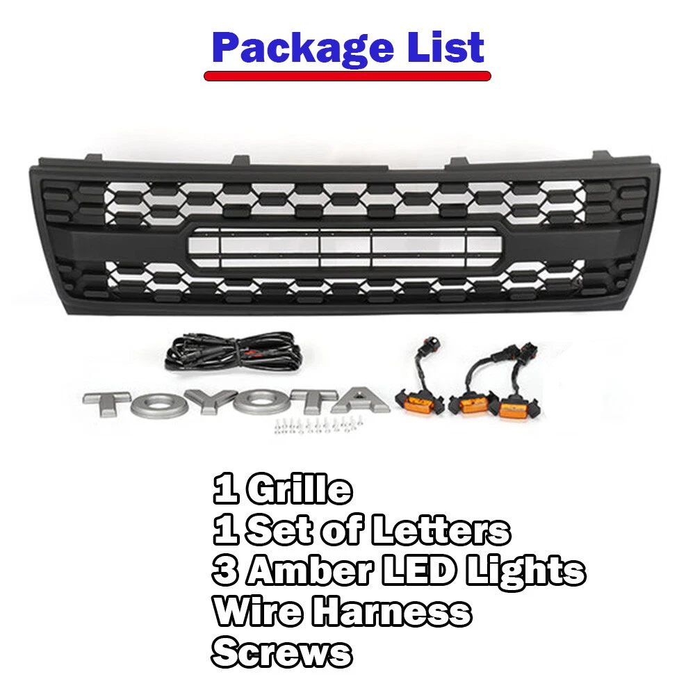 Product Description Front Grille For Toyota Tacoma 1997-2000 Bumper Grill Matte Black W/3LEDs ABS Package include: 1 x Front Grille with letters 3x LED Lights 1x Wire harness Fitment: For 1997, 1998, 1999, 2000 Toyota Tacoma Perfectly on all Tacoma models including: SR, SR5, TRD Sport, TRD Off-Road, TRD Limited, TRD PRO. If you can not make sure the grill fit your car or not, pls send the VIN to us, we will check it for you. Specification: Color: Matte Black Material: ABS Plastic Feature: *Grill made of high quality ABS material, resistant to light impacts, dust, water, and corrosion. The mesh design allows air to flow easily into your vehicle’s engine. *The grille is painted in black with letters. The best updated grille for Tacoma that gives a new look. *Easy to install. Just u nscrew the factory grill and attach the new grill with the existing screws. *With 3 LED lights About Us Payment Shipping Returns Contact Us Welcome to FunKit ,this is a professional shop selling Auto parts, with high-quality and affordable products.You can choose the products suitable for your car, we provide you with the best price and high quality products. Thank you for your business.If you have any questions, please contact us. Please leave us with positive feedback if you are satisfied with our products and services,if not, please contact us before leave any neutral or negative feedback,we'll try our best to satisfy with you. Thank you! We only accept PayPal payment. IMPORTANT NOTICE: We ship our products via FedEX or USPS. In some cases,your purchase will be shipped in two packages(e.g. Grille is in a package,letters,LED lights are in another packge),so please be patience if you recieve one of them first. -We do not offer expedited shipping. -We only ship to the Lower 48 states, and we do not ship to FPO, APO or PO Box addresses. And we are not responsible for wrong or undeliverable address. Please provide us your full address with Telephone number and make sure your shipping address is correct and deliverable. If you need to change your address,please change it in PayPal first before you pay. -Package handling only takes 1 business day at our warehouse, so please make sure entering correct payment and shipping information before checking out. -We are not responsible for any changed of address after item has been shipped. Return: We offer a 30-Day Limited Warranty. If you are not satisfied with your purchase, we are more than happy to offer an exchange or refund within 30 days. !!! No returns are accepted after installation/used. ***Received Incorrect / Damaged / Missing Item: Please take some photos of everything you have received in the package, along with a picture of the invoice and shipping label and send it to our email. We will take care of everything. Please inspect the items upon receiving any damages or missing contents. Please contact us within 7 days of delivery via email. If you change your mind / don't like it / buy it by mistake. Please repack the items carefully. Items to be returned must be in resalable condition. Returned items will be tested and if found defective / incorrect / damaged / missing parts,we will deduct the refund based on the condition of the item. The product must in brand NEW conditions and in original packaging. Installations: It is imperative that buyers understand the items are vehicle-related and require installation and vehicle knowledge. Some of our parts are direct from EUROPE or ASIA which may require modification to complete the installation. Most of the items do not have installation instructions. We highly recommend professional installation if you are not familiar with the installation. If you have any question regarding this listing, Please send us a message. Before leaving us neutral or negative feedback, please contact us first. We will do everything we can to give you a satisfying solution. We do our best to resolve any issue. Leaving negative feedbacks and low ratings doesn't get things solved. So please talk with us and we will not let you down. Business hours: Monday to Friday (exclude Holidays) 9:00 A.M. – 6:00 P.M. Pacific Standard Time ***We do not answer any emails over the weekends and holidays. All emails will be replied in the order it was received on the following business day. About Us Welcome to FunKit ,this is a professional shop selling Auto parts, with high-quality and affordable products.You can choose the products suitable for your car, we provide you with the best price and high quality products. Thank you for your business.If you have any questions, please contact us. Please leave us with positive feedback if you are satisfied with our products and services,if not, please contact us before leave any neutral or negative feedback,we'll try our best to satisfy with you. Thank you! Payment We only accept PayPal payment. Shipping IMPORTANT NOTICE: We ship our products via FedEX or USPS. In some cases,your purchase will be shipped in two packages(e.g. Grille is in a package,letters,LED lights are in another packge),so please be patience if you recieve one of them first. -We do not offer expedited shipping. -We only ship to the Lower 48 states, and we do not ship to FPO, APO or PO Box addresses. And we are not responsible for wrong or undeliverable address. Please provide us your full address with Telephone number and make sure your shipping address is correct and deliverable. If you need to change your address,please change it in PayPal first before you pay. -Package handling only takes 1 business day at our warehouse, so please make sure entering correct payment and shipping information before checking out. -We are not responsible for any changed of address after item has been shipped. Returns Return: We offer a 30-Day Limited Warranty. If you are not satisfied with your purchase, we are more than happy to offer an exchange or refund within 30 days. !!! No returns are accepted after installation/used. ***Received Incorrect / Damaged / Mi