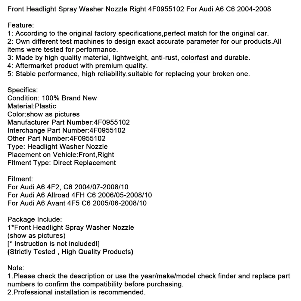 You may also like Windshield Washer Motor Pump for Hyundai for Kia 2006-2023 98510-2J500 17.78 USD Free shipping 2pcs Sprayer Windshield Washer Nozzle for Cadillac SRX 25823361 10.78 USD Free shipping Sprayer Windshield Washer Nozzle for Cadillac XT5 2017-2021 84221502 13.78 USD Free shipping 2pcs Sprayer Windshield Washer Nozzle for Cadillac XT5 2017-2021 84221502 19.78 USD Free shipping Front&Rear Windscreen Washer Motor Pump for Land Rover LR3 RR Sport DMC500010 16.78 USD Free shipping 2* Windshield Washer Nozzle Wiper Spray 55156728AB for Jeep Wrangler JK 02-12 12.78 USD Free shipping Front&Rear Windscreen Washer Pump For Hyundai I20 I40 98510-26100 98510-1W000 17.78 USD Free shipping Windshield Washer Pump for KIA-HYUNDAI 985102L100 985102V100 9851025100 BLK 16.78 USD Free shipping Windshield Washer Pump for Mercedes C208 C190 R230 W210 W219 A2108690821 BLK 15.78 USD Free shipping Windshield Wiper Nozzle 2118601147 fits Mercedes-Benz W203 W208 W209 W211 W219 27.78 USD Free shipping Windshield Washer Pump for Nissan X-Trail T31 07-14 4cyl 2.0L 2.5L 28920-CN000 14.78 USD Free shipping Windshield Washer Nozzle Hose Heated for E/GLS-Class S212 W212 V212 2128600892 65.78 USD Free shipping Windshield Washer Pump for Ford Focus Mk3 2011-2018 BV6117K624BA 15.78 USD Free shipping Windshield Washer Nozzle Hose for BMW X3 G01 2018-2024 61667399024 68.78 USD Free shipping Windshield Washer Nozzle Hose Heated for Mercedes Vito W447 4478600592 64.78 USD Free shipping Windshield Washer Nozzle Hose Heated for Mercedes Benz E43 W213 2138609000 68.78 USD Free shipping All Models For Honda For Suzuki For Kawasaki For Yamaha For BMW For Polaris For CFmoto For Ducati For Benelli For Trident For Triumph For Aprilia Other part You may also like Power Outlet Cigarette Lighter Socket 56046637AA for Dodge Jeep 2011-2024 16.88 USD Free shipping Long Brake Clutch Levers For Kawasaki ZX636R / ZX6RR 2005-2006 Blue #3 28.78 USD Free shipping Extension Brake Foot Pedal Enlarger Pad Cnc Black For Bmw R1300Gs 2023-2025 24 18.63 USD Free shipping Camshaft Cam Shaft Silent Rocker Arm Kits for Honda CRF230F 2003-2019 49.88 USD Free shipping Frame Sliders Crash Protector Fit For Suzuki 1000 2005-2006 Black SS A 29.63 USD Free shipping PRODUCT DESCRIPTION Front Headlight Spray Washer Nozzle Right 4F0955102 For Audi A6 C6 2004-2008 Feature: 1: According to the original factory specifications,perfect match for the original car. 2: Own different test machines to design exact accurate parameter for our products.All items were tested for performance. 3: Made by high quality material, lightweight, anti-rust, colorfast and durable. 4: Aftermarket product with premium quality. 5: Stable performance, high reliability,suitable for replacing your broken one. Specifics: Condition: 100% Brand New Material:Plastic Color:show as pictures Manufacturer Part Number:4F0955102 Interchange Part Number:4F0955102 Other Part Number:4F0955102 Type: Headlight Washer Nozzle Placement on Vehicle:Front,Right Fitment Type: Direct Replacement Fitment: For Audi A6 4F2, C6 2004/07-2008/10 For Audi A6 Allroad 4FH C6 2006/05-2008/10 For Audi A6 Avant 4F5 C6 2005/06-2008/10 Package Include: 1*Front Headlight Spray Washer Nozzle (show as pictures) [* Instruction is not included!] (Strictly Tested , High Quality Products) Note: 1.Please check the description or use the year/make/model check finder and replace part numbers to confirm the compatibility before purchasing. 2.Professional installation is recommended. About Us Payment Shipping Returns Contact Us About VIPIH VIPIH is one of the international leading distributors specialized in distribution of motor parts of the world's prime motorcycle part suppliers on a global scale with the full responsibility in procurement, shipping, sales and marketing and after sales service. VIPIH fulfills all needs of its clients completely and on a timely basis with the know-how it has built up since it was established and the comprehension knowledge of the sectors standards. The perfectionist approach in product quality, high service availability, strict principle of business follow-up, reliability and the good reputation which has gained strength as a result of customer satisfaction are the most striking components of VIPIH's success. VIPIH is presently capable of supplying all demands for motor parts from the petrol pump to rectifier in a wide range. Free delivery with worldwide shipping options available. If you need any further information before ordering,please get in touch with expert advice. About Item All items sold by us are being described to the best of our abilities, as accurate as possible, and with utmost conscientiousness on our part. However, to avoid any potential oversights, I respectfully request your assistance in helping us to make this a mutually satisfactory transaction by THOROUGHLY reviewing item description and photos, and asking all questions PRIOR TO BIDDING. Customer Satisfactory 1.We back our commitment with superb service, 100% full money back and a customer satisfaction guarantee. 2.I am here and ready to assist you with any questions or concerns you might have before or after the purchase. 3.My goal is to make sure you are a happy customer and pleasant shopping with us. Feedback If you are satisfied with the purchase and our total service, your comment is very important in our business success. Please take a minute to leave us a positive feedback with an overall Detailed Selling Rating (DSR) of 5. Our eBay account setup auto feedback, so eBay system gives you automatically Positive feedback back after your positive feedback left. If you plan to give us a neutral/negative feedback Or open ebay/paypal case, please write to us immediately so that we can do our best to resolve your problem. 1.We only accept PayPal. 2.PayPal is the only online payment method we accept. Please make sure you have a valid/confirmed PayPal account prior bidding. 3.Payment must be made within 3 days of the auction 