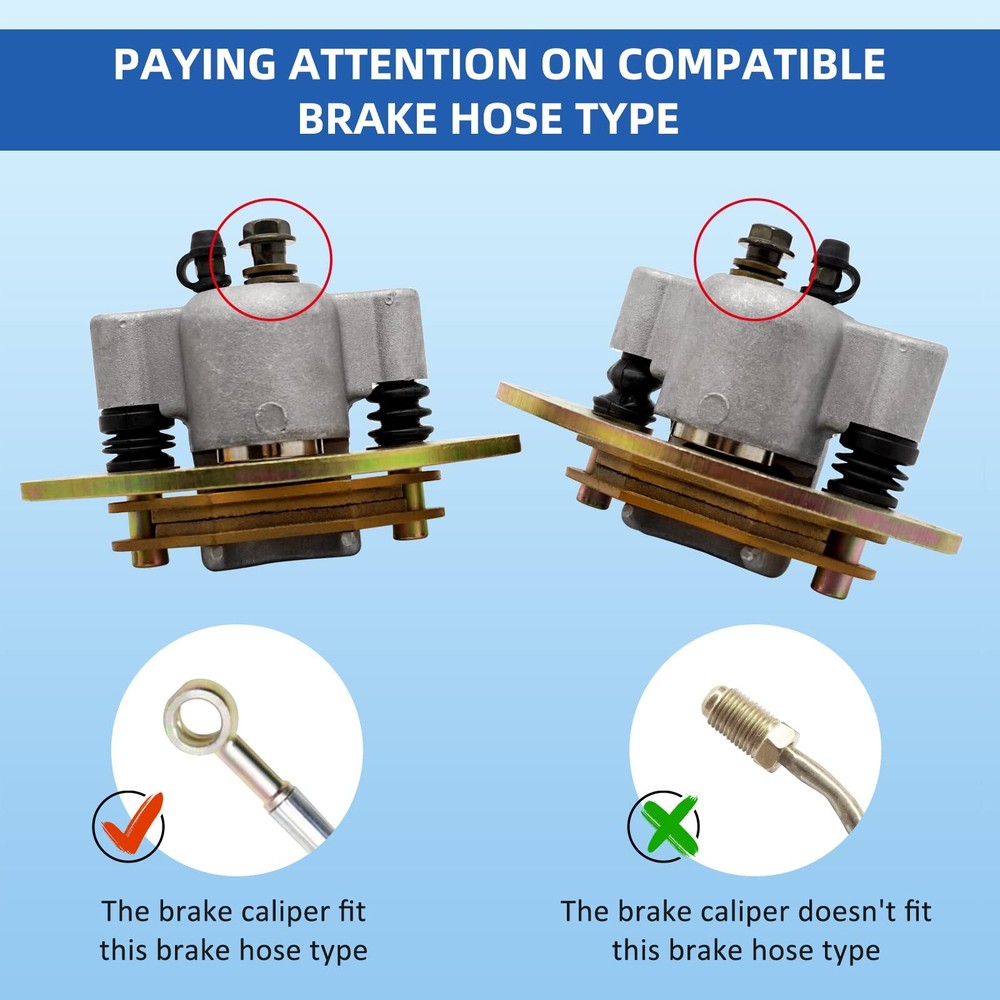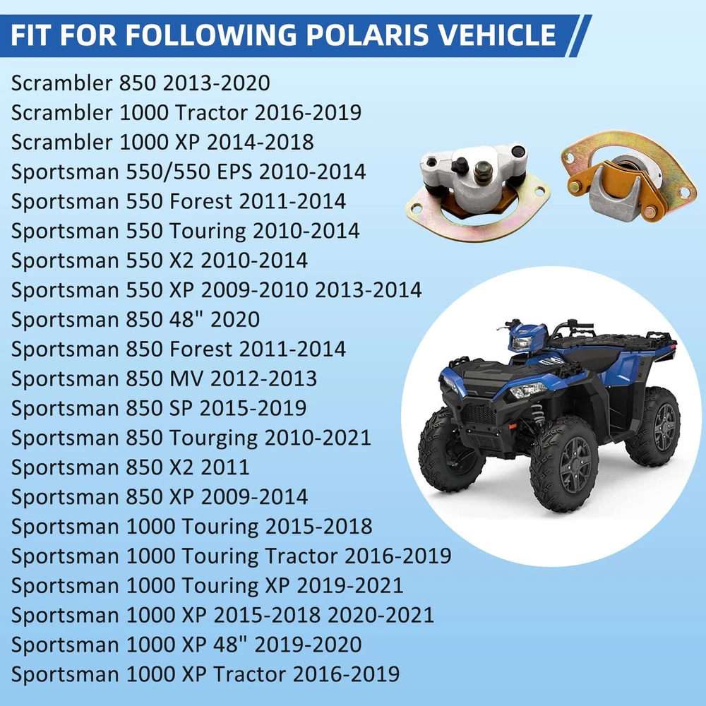 Front Left & Right Brake Caliper Assembly for Polaris Scrambler 850 1000 Manufacturer Part#151 Replacement Part#302 Fitment:Fit for Polaris Scrambler 850 1000 Tractor 1000 XP Sportsman 550/550 EPS 550 Forest 550 Touring 850 XP 850 Tourging 1000 Touring 1000 Touring Tractor Feature: OEM specifications brake caliper assembly with brake pads and exact mounting bracket of American standard thread, directly install, don't need adjustment. Material: Precise alloy piston and anti-ageing seal kit make the caliper have more braking force and longer operation life. Service:If there is any product problem within 1 year, please contact us to solve it for you.We provide product service. Manufacturer Part#151 Replacement Part#302 Package Front right brake caliper ×1 Front left brake caliper×1 Front Left&Rightbrake caliper fit for the following Polaris ATV vehicles: Scrambler 850 2013-2020 Scrambler 1000 Tractor 2016-2019 Scrambler 1000 XP 2014-2018 Sportsman 550/550 EPS 2010-2014 Sportsman 550 Forest 2011-2014 Sportsman 550 Touring 2010-2014 Sportsman 550 X2 2010-2014 Sportsman 550 XP 2009-2010 2013-2014 Sportsman 850 48" 2020 Sportsman 850 Forest 2011-2014 Sportsman 850 MV 2012-2013 Sportsman 850 SP 2015-2019 Sportsman 850 Tourging 2010-2021 Sportsman 850 X2 2011 Sportsman 850 XP 2009-2014 Sportsman 1000 Touring 2015-2018 Sportsman 1000 Touring Tractor 2016-2019 Sportsman 1000 Touring XP 2019-2021 Sportsman 1000 XP 48" 2019-2020 Sportsman 1000 XP Tractor 2016-2019 Shipping We offer FREE shipping on all orders! We ship within Three business days of payment, usually sooner. We use a selection of shipping services such as UPS, FedEx, USPS etc. We only ship to the lower 48 states, no APO/FPO addresses or PO Boxes allowed. Local pickups and combined shipping options are not provided at this time. Return You can return a product for up to 30 days from the date you purchased it. Any product you return must be in the same condition you received it and in the original packaging. Please keep the receipt. Payment We accept payment by any of the following methods: PayPal Please pay as soon as possible after winning an auction, as that will allow us to post your item to you sooner! Feedback Customer satisfaction is very important to us. If you have any problem with your order, please contact us and we will do our best to make you satisfied. Contact Us If you have any queries, please contact us via ebay. We usually respond within 24 hours on weekdays. Please visit our eBay store to check out other items for sale! Thank you for shopping at our store.