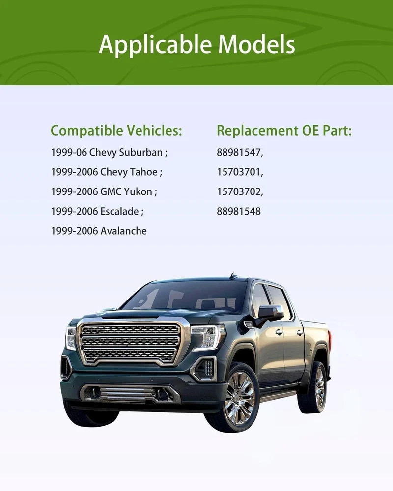 Front Left+Right Door Armrest Handle Fits GMC Yukon Chevy Suburban/Tahoe 1999-06 Free Shipping to US One Year Warranty Part Number Left:88981547,15703701 Right:15703702,88981548,12472876 Fitment: For Chevy Suburban/Tahoe GMC Yukon/Escalade/Avalanche 1999-06 Sedan Only. For 1999-2006 Chevy Suburban For 1999-2006 Chevy Tahoe For 1999-2006 Chevy GMC Yukon For 1999-2006 Chevy Escalade For 1999-2006 Chevy Avalanche -------------------------------------------------------------- 1 Year Warranty: This item have 1-year warranty. In the event the item should fail due to manufacturing defects during intended use, we will replace the part by free. We only warranty cost of item parts. Any installation or other fees are non-refundable. Note: Any modifying the item of any kind without contacting us will void any and all warranty coverage for this item. Please contact us before modifying the part so that we have the opportunity to correct the situation. You can contact us by ebay message to get the full text of the written warranty. -------------------------------------------------------------- Shipping: Handling time: 1 days Shipping time: 2-6 business days in USA We ship to eBay address -------------------------------------------------------------- Return: No returns are accepted without an RMA number Item must be returned in original packing same as reached Refund will be given as money back or replacement We only warranty cost of item parts. Any installation or other fees are non-refundable. -------------------------------------------------------------- WARNING: This product can expose you to chemicals including Chromium (Hexavalent Compounds), which is known to the State of California to cause cancer, and birth defects or other reproductive harm. For more information, go to California goverment website, you can search California P65Warnings. -------------------------------------------------------------- Thanks for purchasing ^-^ On Sep 20, 2025 at 00:53:01 PDT, seller added the following information: On Jan 7, 2026 at 14:35:56 PST, seller added the following information: