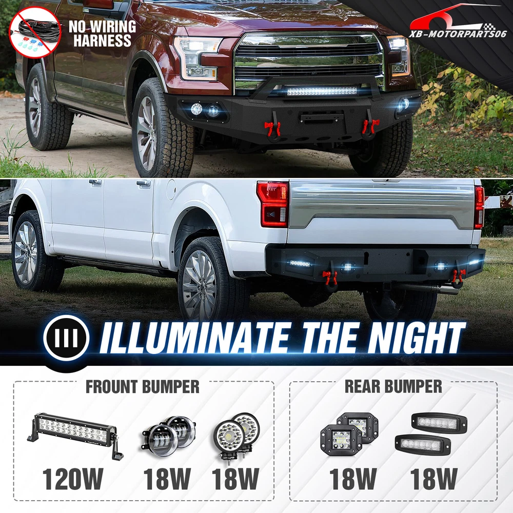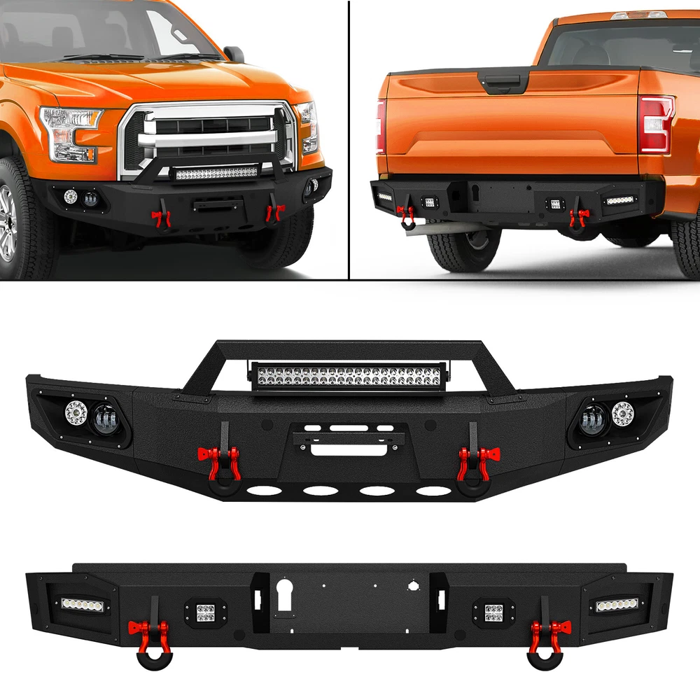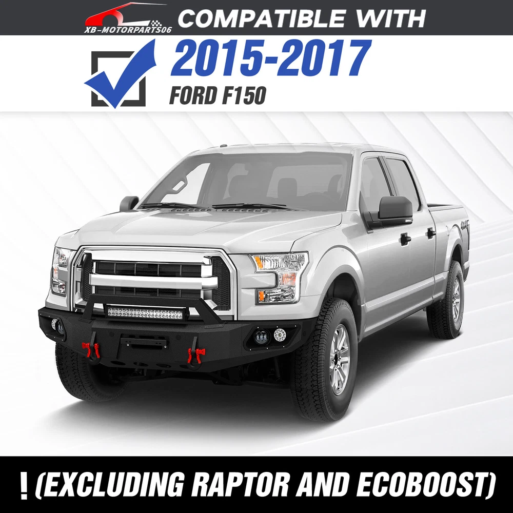 Front /Rear Bumper For 2015 2016 2017 Ford F150 (Excluding Raptor and Ecoboost) Please pay attention to the product options you select: If you choose Front & Rear Bumper,You can get 1 × Front Bumper, 1 × Rear Bumper and Mounting Hardware; If you choose Only Front Bumper,You can get 1 × Front Bumper and Mounting Hardware; If you choose Only Rear Bumper,You can get 1 × Rear Bumper and Mounting Hardware; Suitable Models : Compatible with 2015 2016 2017 Ford F150 (Excluding Raptor and Ecoboost) Package Includes : ① Front & Rear Bumper option : 1 x Front Bumper, 1 x Rear Bumper, 1 x Winch Plate, 1 x License Plate Bracket , 9 x LED Lights, 4 x D-rings, 2 x manual, screw fittings, Paintable Armor ② Front Bumper option : 1 x Front Bumper, 1 x Winch Plate, 1 x License Plate Bracket , 2 x D-rings, 5 x LED Lights, 1 x manual, screw fittings ③ Rear Bumper option : 1 x Rear Bumper, Paintable Armor , 2 x D-rings, 4 x LED Lights, 1 x manual, screw fittings Product Information : Package Dimensions : 65.35"D x 18.31"W x 13.39"H Installation mode: Bolt-On With Sensor Holes: Yes ( Not fit for original sensor ) Steel thickness: 3mm Placement on Vehicle: Front/Rear Item Weight: Front Bumper: 122.1 Pounds; Rear Bumper: 68.2 Pounds Material: Carbon Steel Color: Black (hand measurements may have an error of 2-3 mm/0.078-0.118 in) Feature : Front bumper : ①Made of high-strength steel, with a two-stage textured black powder coating; ②P re-drilled backup sensor holes; ③ No cutting, no drilling required, Rust-proof; ④Powder Coated, Durability, Waterproof; Rear Bumper : ①Made of high-strength steel, with a two-stage textured black powder coating; ② It has pre-drilled holes for backup sensors, license plates, lights, and a trailer plug; ③ No cutting, no drilling required, Rust-proof; ④Powder Coated, Durability, Waterproof; Warranty Period :2 year Standard Shipping (FedEx Ground or FedEx Home Delivery) Will usually ship within 3 business days of receiving cleared payment Please pay attention to the product options you select: If you choose Front & Rear Bumper,You can get 1 × Front Bumper, 1 × Rear Bumper and Mounting Hardware; If you choose Only Front Bumper,You can get 1 × Front Bumper and Mounting Hardware; If you choose Only Rear Bumper,You can get 1 × Rear Bumper and Mounting Hardware; Suitable Models : Compatible with 2015 2016 2017 Ford F150 (Excluding Raptor and Ecoboost) Package Includes : ① Front & Rear Bumper option : 1 x Front Bumper, 1 x Rear Bumper, 1 x Winch Plate, 1 x License Plate Bracket , 9 x LED Lights, 4 x D-rings, 2 x manual, screw fittings, Paintable Armor ② Front Bumper option : 1 x Front Bumper, 1 x Winch Plate, 1 x License Plate Bracket , 2 x D-rings, 5 x LED Lights, 1 x manual, screw fittings ③ Rear Bumper option : 1 x Rear Bumper, Paintable Armor , 2 x D-rings, 4 x LED Lights, 1 x manual, screw fittings Product Information : Package Dimensions : 65.35"D x 18.31"W x 13.39"H Installation mode: Bolt-On With Sensor Holes: Yes ( Not fit for original sensor ) Steel thickness: 3mm Placement on Vehicle: Front/Rear Item Weight: Front Bumper: 122.1 Pounds; Rear Bumper: 68.2 Pounds Material: Carbon Steel Color: Black (hand measurements may have an error of 2-3 mm/0.078-0.118 in) Feature : Front bumper : ①Made of high-strength steel, with a two-stage textured black powder coating; ②P re-drilled backup sensor holes; ③ No cutting, no drilling required, Rust-proof; ④Powder Coated, Durability, Waterproof; Rear Bumper : ①Made of high-strength steel, with a two-stage textured black powder coating; ② It has pre-drilled holes for backup sensors, license plates, lights, and a trailer plug; ③ No cutting, no drilling required, Rust-proof; ④Powder Coated, Durability, Waterproof; Warranty Period :2 year