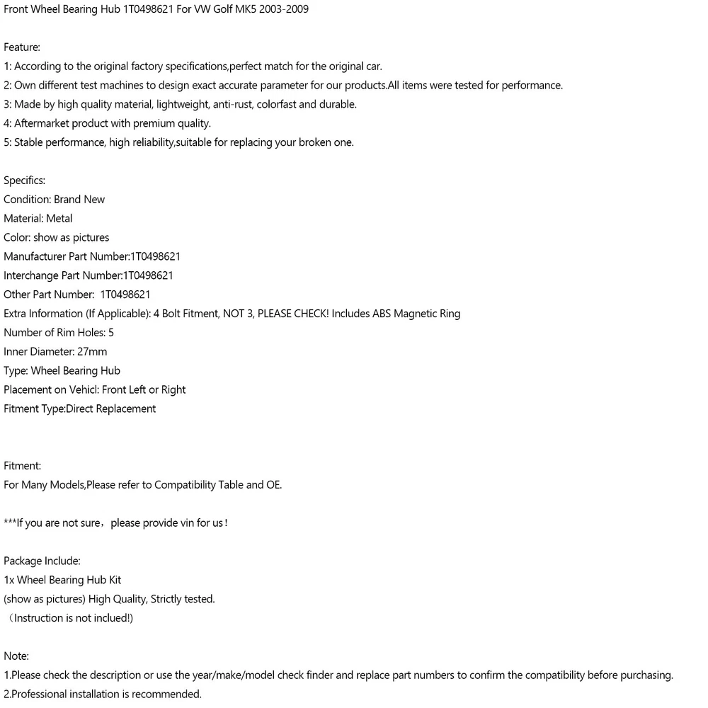 6L80 6L90 Transmission Rebuild 1-2-3-4 3-5-Reverse Clutch Seals Pack O-Rings 20.89 USD 21.99 USD Free shipping 5% off For Peterbilt Door Latch Striker R56-6017 16.57 USD Free shipping ABS Anti-Lock Brake Pump Assembly 57110-T2F-L22 for Honda Accord Sport 2.4L 2014 553.65 USD 582.79 USD Free shipping 5% off Clutch Cable For Honda CBR900 CBR954 Fireblade 2002-2003 CBR929 2000-2001 UE UE 16.27 USD Free shipping Rear Bumper Reflectors Fog Light Lamp Pair For Bmw 5Series F10 F18 2014 2015 U9 24.79 USD Free shipping Air Pressure Sensor for Multistrada 1200 Panigale 899 959 1199 Diavel 55241571A! 23.79 USD Free shipping Rectifier Regulator For Yamaha 40-70Hp Outboard 50hp 60hp 2000-17 6H2-81960-10 23.55 USD 24.79 USD Free shipping 5% off Ignition Switch Lock KEY SET (D206) For Kymco MXU 150 ATV Quad 35010-LCA4-90A 21.79 USD Free shipping Front Sprocket Nut Lock Washer Tab Kit For YAMAHA R6 YZF 600 1000 TDM 850 14.95 USD 16.79 USD Free shipping 11% off Cylinder Head Cover Gasket for Yamaha VMX12 V-Max1200 88-07 XVZ1200 26H-11193-00 24.73 USD 26.03 USD Free shipping 5% off FUEL PUMP FUSE RELAY fit for Yamaha YZF R1 R6 FZ1 Fazer FZ8-N Naked 5VK-81950-40 23.74 USD 24.99 USD Free shipping 5% off Blind Spot + Heat Exterior Mirror Glass Left For Dodge Ram 1500 2500 2019-2022 26.87 USD Free shipping A Fantastic Shop Send us a message Our Store Seller Profile Feedbacks Save this seller Contact Front Wheel Bearing Hub 1T0498621 For VW Golf MK5 2003-2009 Front Wheel Bearing Hub 1T0498621 For VW Golf MK5 2003-2009 Feature: 1: According to the original factory specifications,perfect match for the original car. 2: Own different test machines to design exact accurate parameter for our products.All items were tested for performance. 3: Made by high quality material, lightweight, anti-rust, colorfast and durable. 4: Aftermarket product with premium quality. 5: Stable performance, high reliability,suitable for replacing your broken one. Specifics: Condition: Brand New Material: Metal Color: show as pictures Manufacturer Part Number:1T0498621 Interchange Part Number:1T0498621 Other Part Number: 1T0498621 Extra Information (If Applicable): 4 Bolt Fitment, NOT 3, PLEASE CHECK! Includes ABS Magnetic Ring Number of Rim Holes: 5 Inner Diameter: 27mm Type: Wheel Bearing Hub Placement on Vehicl: Front Left or Right Fitment Type:Direct Replacement Fitment: For Many Models,Please refer to Compatibility Table and OE. ***If you are not sure,please provide vin for us! Package Include: 1x Wheel Bearing Hub Kit (show as pictures) High Quality, Strictly tested. (Instruction is not inclued!) Note: 1.Please check the description or use the year/make/model check finder and replace part numbers to confirm the compatibility before purchasing. 2.Professional installation is recommended. About US About Our Items We strive to describe all items accurately and thoroughly, with the utmost care and attention to detail. However, to ensure a mutually satisfactory transaction, we kindly ask for your assistance in thoroughly reviewing the item description and photos, and addressing any questions before placing a bid. Customer Satisfaction We stand behind our commitment with exceptional service, a 100% money-back guarantee, and a dedication to customer satisfaction. I am readily available to address any inquiries or concerns you may have, both before and after your purchase. Our aim is to ensure your shopping experience is enjoyable and that you're delighted with your purchase. Feedback Your feedback is crucial to our business's success. If you're satisfied with your purchase and the service you received, we would greatly appreciate your positive feedback, along with an overall Detailed Selling Rating (DSR) of 5. Please take a moment to leave us positive feedback. Our eBay account is set up to automatically reciprocate positive feedback once yours is received. If you're considering leaving neutral/negative feedback or opening an eBay/PayPal case, we encourage you to reach out to us immediately. We're committed to resolving any issues to the best of our ability. Shipping Parcel will be shipped using Standard shipping method. For security purposes, items will be shipped exclusively to the confirmed address on Paypal. Please ensure your Shipping address is up to date before proceeding with payment. Estimated delivery time within the United States ranges from 3 to 10 business days, depending on your location. Returns We accept returns within 60 days from the date the buyer receives the item. If the item is found to be defective upon receipt, the customer has up to 30 days from the date of receipt to request an exchange for a new item or a refund. For returns due to a change of mind, we accept items in their original selling condition. However, if the package has been opened due to a mistaken order, it does not qualify for our return policy. Please note that the buyer is responsible for covering the cost of return postage. If you encounter any issues, please reach out to us via eBay message, and we'll respond within 24 hours. Free Wheel Hub Lock 28 Spline 40260-1S700 For Nissan Frontier X-Terra Navara D22 45.99 USD Free shipping 2pcs Manual Locking Hubs 28 Spline 40250-2S610 For Nissan D21 Base/SE Pickup YU 66.87 USD Free shipping 4PCS Front Swivel Housing Bearing 40030VB000 For Nissan Patrol Y60 GQ RB30 RD28 52.79 USD Free shipping 2X Free Wheeling Hubs For Holden Rodeo Jackaroo Colorado Isuzu D-Max 17 SplineYU 95.79 USD Free shipping Rear Wheel Bearing 43X80X50X45 DAC43800050-45 90369-43005 US 45.87 USD Free shipping Lock Hub Actuator 4151009100 For SSANGYONG REXTON II ACTYON KYRON STAVIC 56.79 USD Free shipping Front Wheel Bearing For Nissan Elgrand E51 2002-2010 2.5 3.5 With ABS 2WD 4WD 84.79 USD Free shipping Front Wheel Bearing Hub 4F0498625B For Audi A6 A6 Allroad C6 4F2 4F5 R8 422 423 150.79 USD Free shipping 2x Free Lock Wheeling Hubs For Mitsubishi Triton ME MJ ML Pajero Delica L200 YU 82.79 USD Free shipping 2x Free Wheel Hub 43530-60130