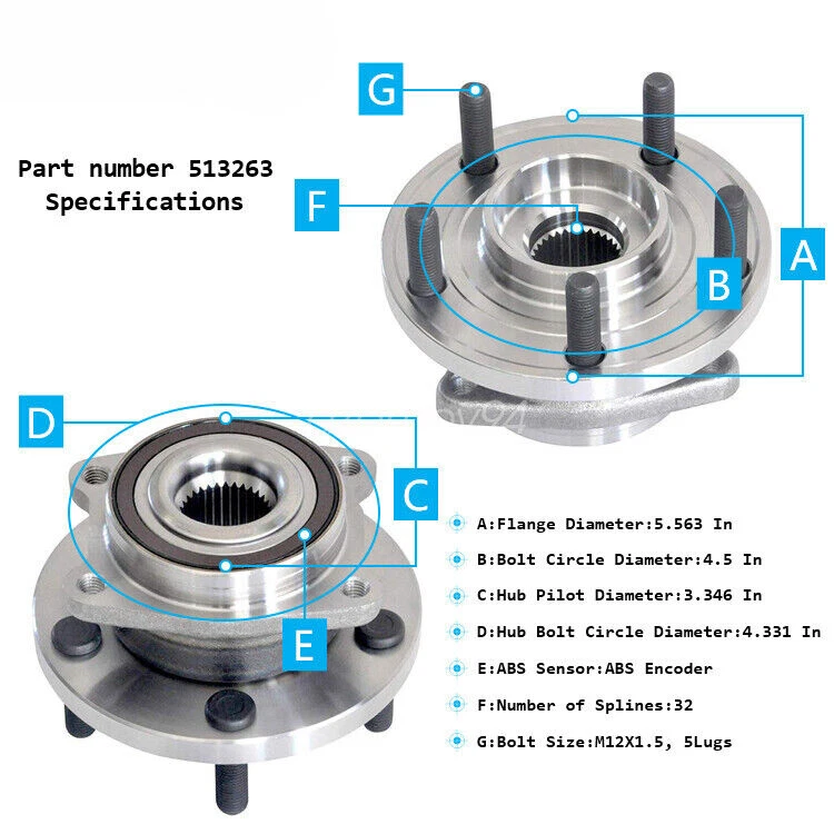 Both (2) Front Wheel Hub and Bearing Assembly Fits Both Driver and Passenger Sides Kit Includes: 2x Front (Left and Right) Wheel Hub Bearing Assembly - 513263 Hub Specifications Position: Front Lugs: 5 Bolt ABS on Hub: Encoder Flange Type: 4-Bolt Square FITS: MAKE MODEL YEAR RANGE SPECIFIC DETAILS CHRYSLER 200 2011 - 2014 All Models CHRYSLER SEBRING 2007 - 2010 All Models DODGE AVENGER 2008 - 2014 All Models