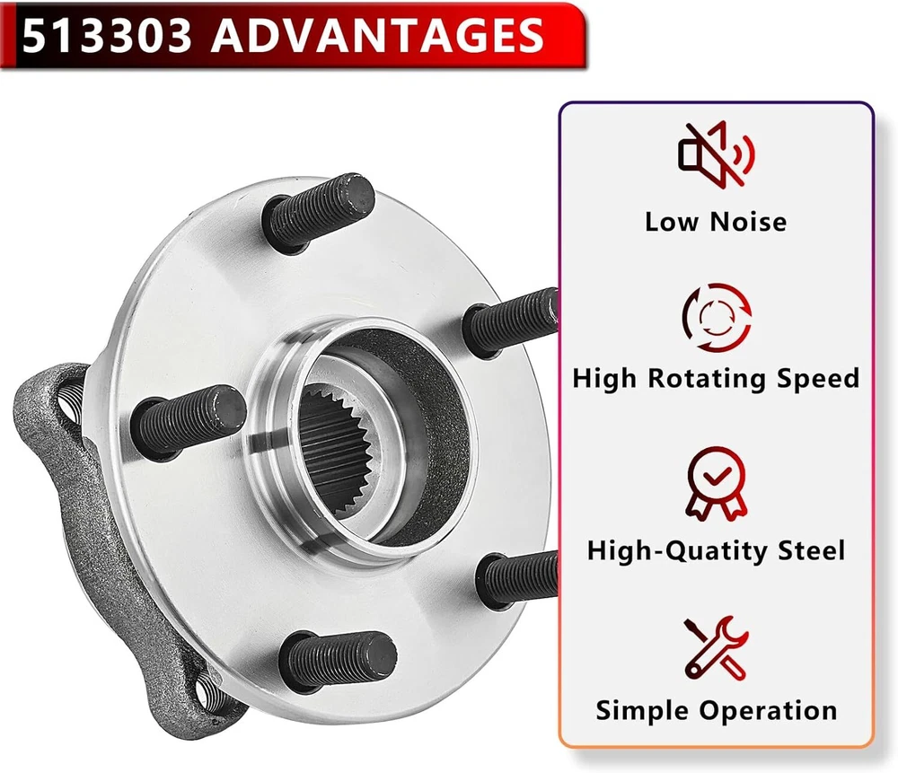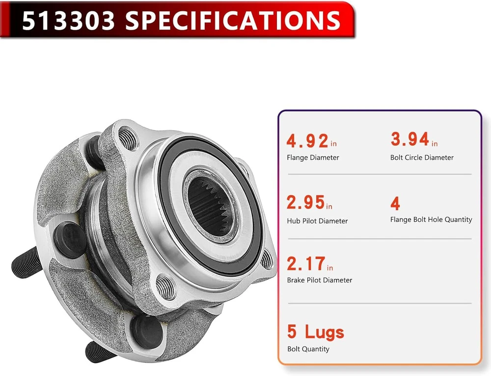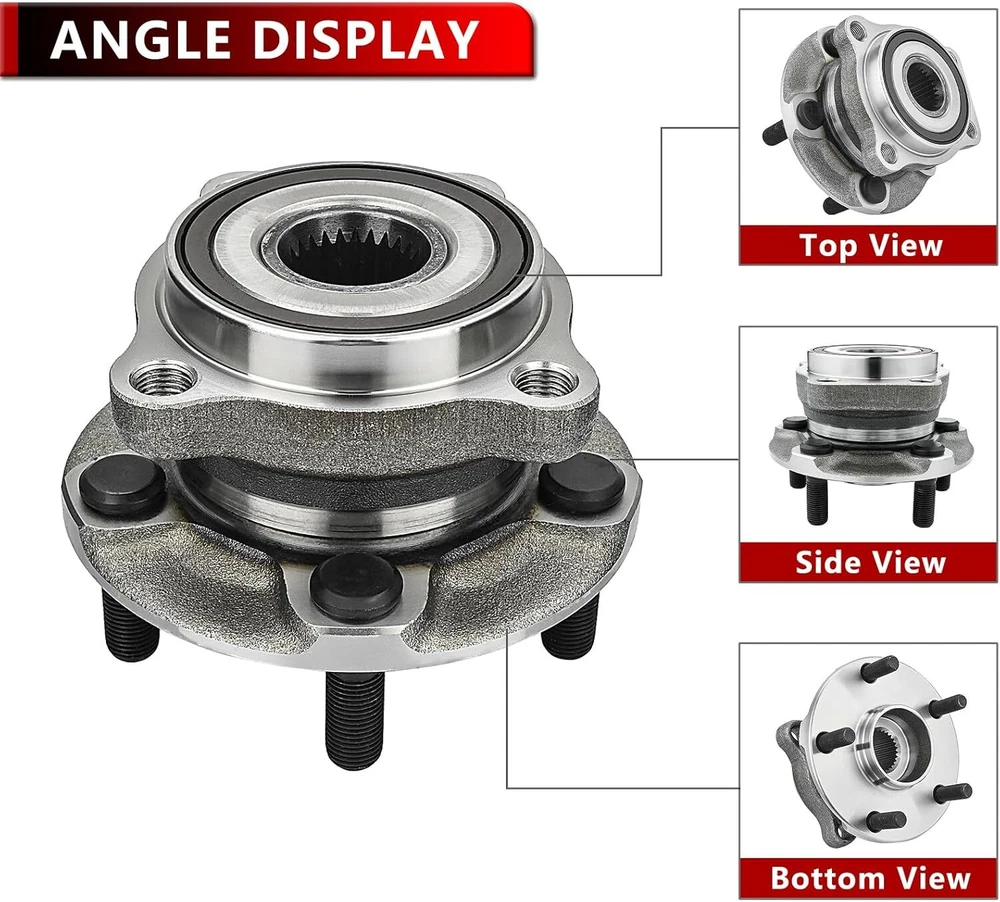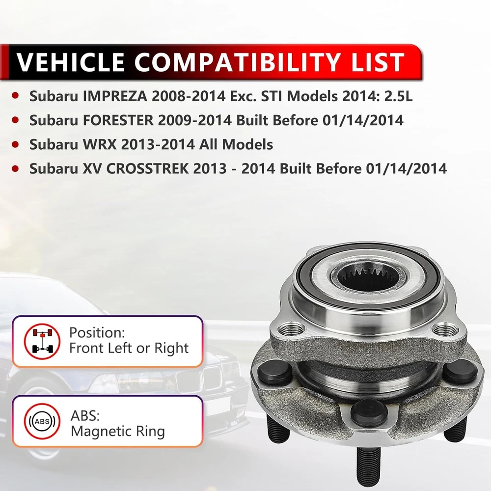 (2) Front Wheel Hub and Bearing Assemblies Fits Driver and Passenger Sides Kit Includes: 2x Front Wheel Hub and Bearing - 513303 Hub Specifications Position: Front Lugs: 5 Bolt ABS on Hub: Encoder Flange: 4-Bolt Square Fits: MAKE MODEL YEAR RANGE SPECIFIC DETAILS SUBARU IMPREZA 2008 - 2014 Exc. STI Models SUBARU FORESTER 2009 - 2014 Built Before 01/14/2014 SUBARU LEGACY 2005 - 2014 All Models SUBARU OUTBACK 2005 - 2014 All Models SUBARU WRX 2013 - 2014 All Models SUBARU XV CROSSTREK 2013 - 2014 Built Before 01/14/2014