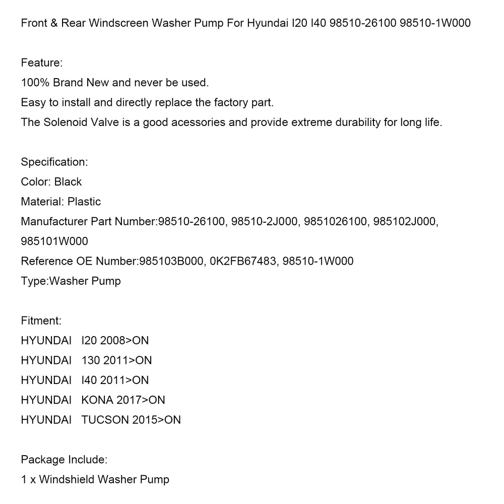 You may also like Turbo Solenoid Plug Billet for Dodge Ram Cummins 2004-2007 HE351CW BWD-012B 12.63 USD Free shipping 4475 Stiletto Pegs Footpegs For Softail Sportster Dyna Glide Fat Boy Black 47.63 USD Free shipping 7x Steering Wheel Button Trim Cover Fit For BMW X3 F25(11-17)X4 F26(14-17)B 23.63 USD Free shipping Clutch Pedal Control Lever Shaft Fit for Ford F-150 F-250 F-350 E7TZ7A554A 16.63 USD Free shipping Fuel Pump Fits Ski-Doo most 380F & 550F models 2003~2020 # 403901809 403901813 23.63 USD Free shipping 10pcs LADDER REPAIR KIT nuts Bunk Motorhome Parts Camper Trailer Coach Stainless 10.63 USD Free shipping New Black Motorcycle Clutch Cable Steel Wire 1SB-F6335-00 for Yamaha XTZ125 Blk 23.63 USD Free shipping 🏍️Motorcycle Front/Rear Footboards Floorboard For Suzuki Intruder Volusia 400, 42.63 USD Free shipping All Models For Honda For Suzuki For Kawasaki For Yamaha For BMW For Polaris For CFmoto For Ducati For Benelli For Trident For Triumph For Aprilia Other part You may also like PRODUCT DESCRIPTION Front & Rear Windscreen Washer Pump For Hyundai I20 I40 98510-26100 98510-1W000 Feature: 100% Brand New and never be used. Easy to install and directly replace the factory part. The Solenoid Valve is a good acessories and provide extreme durability for long life. Specification: Color: Black Material: Plastic Manufacturer Part Number:98510-26100, 98510-2J000, 9851026100, 985102J000, 985101W000 Reference OE Number:985103B000, 0K2FB67483, 98510-1W000 Type:Washer Pump Fitment: For HYUNDAI I20 2008>ON For HYUNDAI 130 2011>ON For HYUNDAI I40 2011>ON For HYUNDAI KONA 2017>ON For HYUNDAI TUCSON 2015>ON Package Include: 1 x Windshield Washer Pump About Us Payment Shipping Returns Contact Us About VIPIH VIPIH is one of the international leading distributors specialized in distribution of motor parts of the world's prime motorcycle part suppliers on a global scale with the full responsibility in procurement, shipping, sales and marketing and after sales service. VIPIH fulfills all needs of its clients completely and on a timely basis with the know-how it has built up since it was established and the comprehension knowledge of the sectors standards. The perfectionist approach in product quality, high service availability, strict principle of business follow-up, reliability and the good reputation which has gained strength as a result of customer satisfaction are the most striking components of VIPIH's success. VIPIH is presently capable of supplying all demands for motor parts from the petrol pump to rectifier in a wide range. Free delivery with worldwide shipping options available. If you need any further information before ordering,please get in touch with expert advice. About Item All items sold by us are being described to the best of our abilities, as accurate as possible, and with utmost conscientiousness on our part. However, to avoid any potential oversights, I respectfully request your assistance in helping us to make this a mutually satisfactory transaction by THOROUGHLY reviewing item description and photos, and asking all questions PRIOR TO BIDDING. Customer Satisfactory 1.We back our commitment with superb service, 100% full money back and a customer satisfaction guarantee. 2.I am here and ready to assist you with any questions or concerns you might have before or after the purchase. 3.My goal is to make sure you are a happy customer and pleasant shopping with us. Feedback If you are satisfied with the purchase and our total service, your comment is very important in our business success. Please take a minute to leave us a positive feedback with an overall Detailed Selling Rating (DSR) of 5. Our eBay account setup auto feedback, so eBay system gives you automatically Positive feedback back after your positive feedback left. If you plan to give us a neutral/negative feedback Or open ebay/paypal case, please write to us immediately so that we can do our best to resolve your problem. 1.We only accept PayPal. 2.PayPal is the only online payment method we accept. Please make sure you have a valid/confirmed PayPal account prior bidding. 3.Payment must be made within 3 days of the auction end time. Non-Paying bidders will be reported. 4.Our eBay account automatically open a dispute for a unpaid item, when we don't receive your payment after 4 days. United States Buyers Parcel will via USPS or UPS from us United States warehouse Shipping Time Usually ,Parcel will be delivered 2-10 working day include Handling time. Sometimes shiping time may has a little delay, such as Bad wether,Holidays We stand behind everything that we sell and will do everything possible to assure you are satisfied. When you receive your purchase if you are not 100% satisfied, please sent me ebay message and we will do our best to make you happy. If you still want to return your purchase, simply ship the item(s) back to us and we will refund your original purchase price and the original shipping charge. Buyers are responsible for the postal cost of returning the items. We must be notified of the intent to return your item within 30 days of receiving the item. Items returned must be in the same condition that they were received. How to return 1,Please ask us for return address . 2,Shipping back the package . The RMA#(Return Merchant Authorization Number = Your ebay ID) must be clearly written on the return package ,Otherwise the package will be refused. 3,Sent us the return tracking number. 4,All returns will be inspected prior to a credit being issued. Sent ebay message in English If you have any questions, our Customer Service staffs welcome you to sent me ebay message. We strive to answer all questions and resolve any problems as quickly as possible. Business Hours: HongKong Time GMT+8:00 Monday-Saturday 9:00-17:00 About Us About Item All items sold by us are being described to the best of our abilities, as accurate as possible, and with utmost conscientiousness on our part. However, to avoid any potential ove