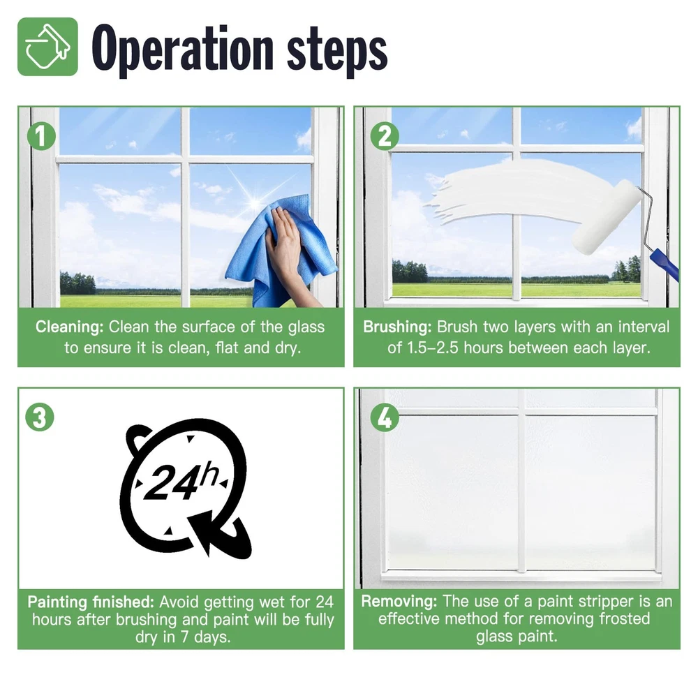 【Privacy and Light Balance】Maintains discretion in private spaces while letting in comfortable natural light without the glare. The translucent window privacy paint strikes the perfect balance between privacy and natural lighting 【High Coverage and Quality】A single 16 oz bottle of the frosted paint covers 25 sq ft with two coats which are waterproof and colorfast. Wait 1.5 hours after the first coat before applying the second and no water contact for 24 hours post-application 【Complete Kit Included】Features everything you need—frosted glass paint, masking supplies, roller, sandpaper, gloves—making it perfect for beginners and pros alike. This comprehensive kit helps you achieve professional-looking results easily 【Low Odor and VOCs】frosted window paint is a water-based formula with low odor and VOCs. This green approach means you can enjoy a fresh, frosted look without the harsh things typically associated with traditional paints 【Wide Application】The frosted glass paint is ideal for enhancing privacy and aesthetics in various indoor settings, such as bathrooms, kitchens, bedrooms, and office windows, suitable for any glass surface NOTE: There's an electronic version of the User Guide (PDF) on this product page. You can find it under "Product Guides and Documents" NOTE: For food safety, this window privacy paint is not suitable for use on any food storage cups, plates, or similar items.