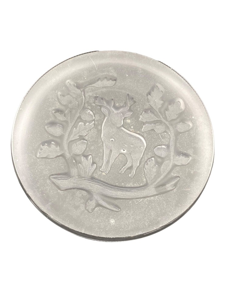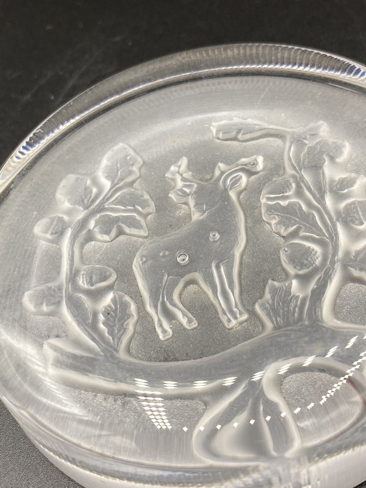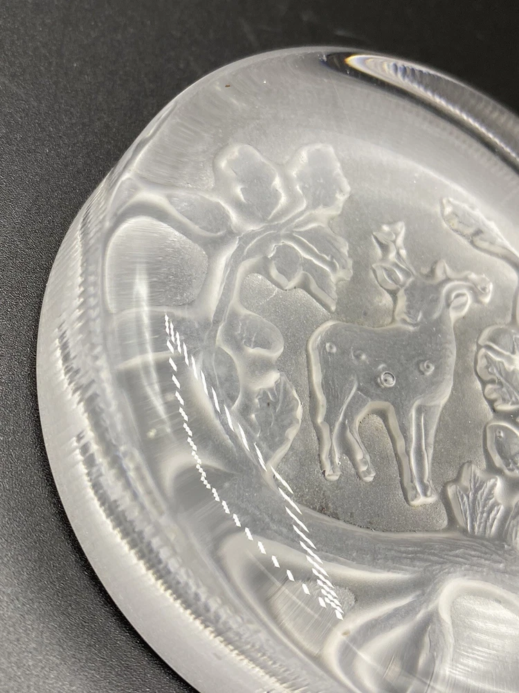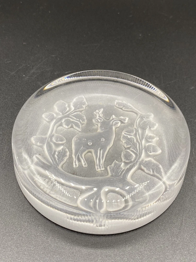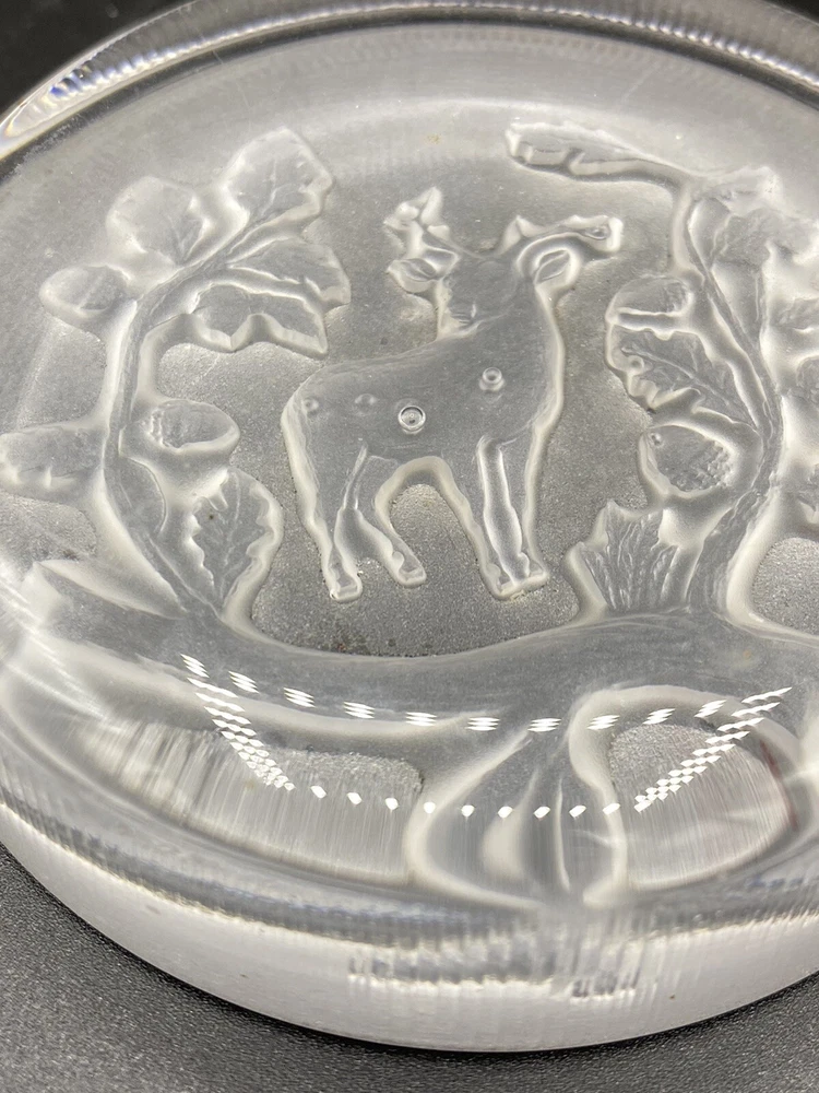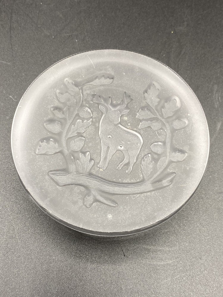 Original/Reproduction:Contemporary OriginalType of Glass:CrystalType:PaperweightObject Type:PaperweightMaterial:GlassProduction Style:Pressed GlassEra:21st Century (2000-now)Style:Mid-Century ModernSubject/Theme:ReindeerTheme:AnimalOriginal/Licensed Reproduction:OriginalBrand:UnmarkedColor:ClearGlassmaking Technique:EngravedMPN:N/ASeller Notes:“Lovely paper weight. no chips or cracks 3.5"Dx .75"”