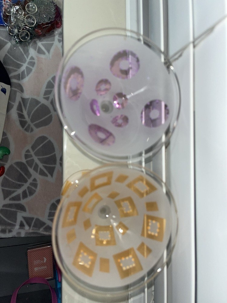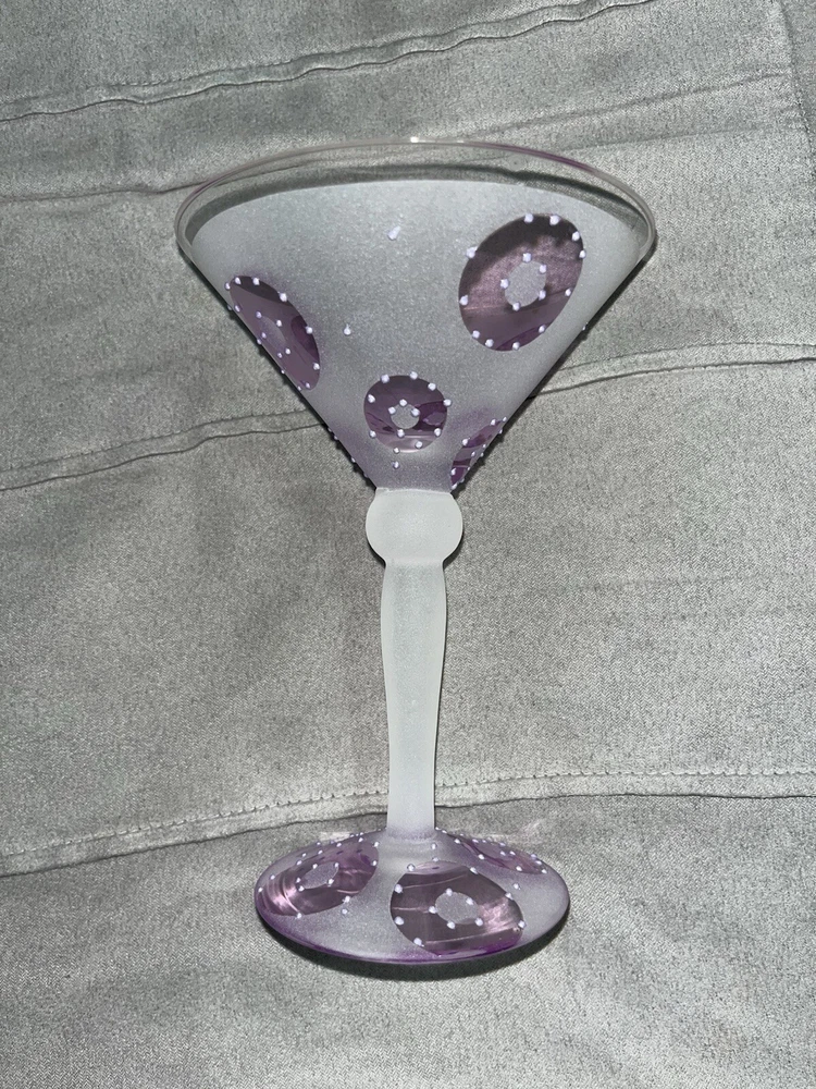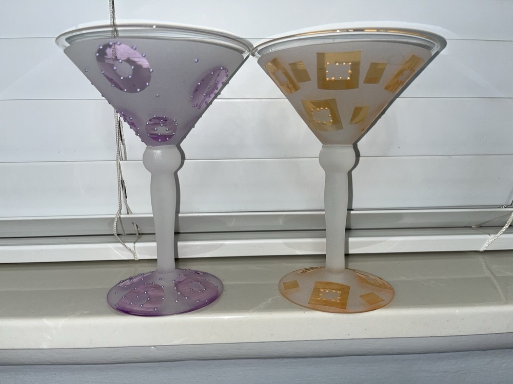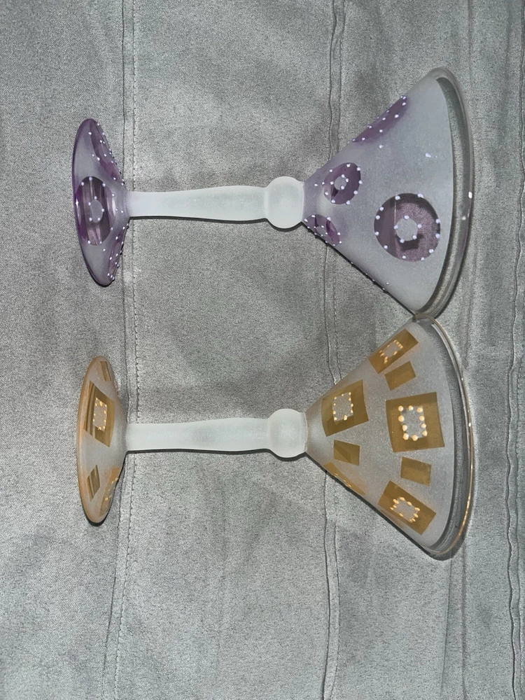 - 2 frosted glass martini glasses - One orange design - One purple design - In perfect condition, never used - From super-clean, nonsmoking, pet-free home